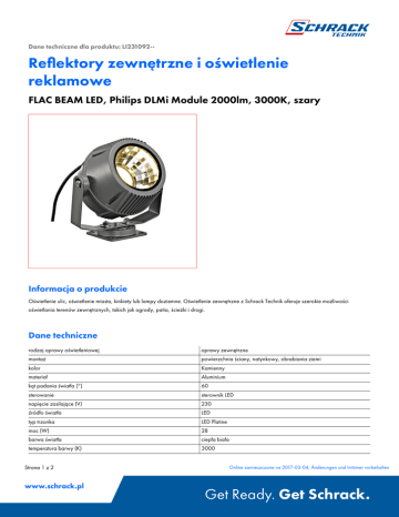 Dane techniczne dla produktu: LI231092-- Reflektory zewnętrzne i oświetlenie reklamowe FLAC BEAM LED, Philips DLMi Module 2000lm, 3000K, szary Informacja o produkcie Oświetlenie ulic, oświetlenie miasta, kinkiety lub lampy doziemne. Oświetlenie zewnętrzne z Schrack Technik oferuje szerokie możliwości oświetlania terenów zewnętrznych, takich jak ogrody, patia, ścieżki i drogi. Dane techniczne rodzaj oprawy oświetleniowej oprawy zewnętrzne montaż powierzchnia ściany, natynkowy, obrabiania ziemi kolor Kamienny materiał Aluminium kąt padania światła (°) 60 sterowanie sterownik LED napięcie zasilające (V) 230 źródło światła LED typ trzonka LED Platine moc (W) 28 barwa światła ciepła biała temperatura barwy (K) 3000 Strona 1 z 2 www.schrack.pl Online zamieszczone na 2017-03-04, Änderungen und Irrtümer vorbehalten Get Ready. Get Schrack. Dane techniczne - kontynuacja stopień oddawania barw ≥80 strumień świetlny (lm) 2000 ilość lamp 1 klasa ochrony I stopień szczelności IP65 Zakres obrotu (°) 170 zawiera żródła światła tak Lista produktów OPIS Dostępny FLAC BEAM LED, Philips DLMi Module 2000lm, 3000K, szary STORE W magazynie, gotowy do dostawy w dniu zamówienia Strona 2 z 2 www.schrack.pl STORE Nr katalogowy LI231092 W magazynie, czas realizacji 24 h w Online zamieszczone na 2017-03-04, Änderungen und Irrtümer vorbehalten Get Ready. Get Schrack.