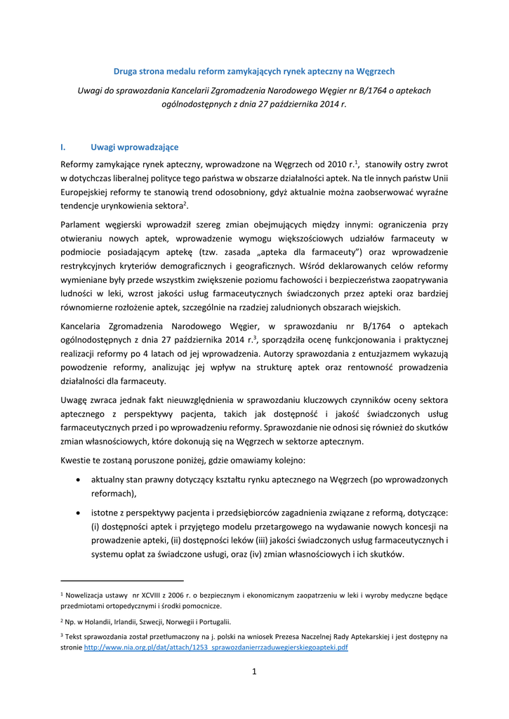 Druga strona medalu reform zamykających rynek apteczny na Węgrzech Uwagi do sprawozdania Kancelarii Zgromadzenia Narodowego Węgier nr B/1764 o aptekach ogólnodostępnych z dnia 27 października 2014 r. I. Uwagi wprowadzające Reformy zamykające rynek apteczny, wprowadzone na Węgrzech od 2010 r.1, stanowiły ostry zwrot w dotychczas liberalnej polityce tego państwa w obszarze działalności aptek. Na tle innych państw Unii Europejskiej reformy te stanowią trend odosobniony, gdyż aktualnie można zaobserwować wyraźne tendencje urynkowienia sektora2. Parlament węgierski wprowadził szereg zmian obejmujących między innymi: ograniczenia przy otwieraniu nowych aptek, wprowadzenie wymogu większościowych udziałów farmaceuty w podmiocie posiadającym aptekę (tzw. zasada „apteka dla farmaceuty”) oraz wprowadzenie restrykcyjnych kryteriów demograficznych i geograficznych. Wśród deklarowanych celów reformy wymieniane były przede wszystkim zwiększenie poziomu fachowości i bezpieczeństwa zaopatrywania ludności w leki, wzrost jakości usług farmaceutycznych świadczonych przez apteki oraz bardziej równomierne rozłożenie aptek, szczególnie na rzadziej zaludnionych obszarach wiejskich. Kancelaria Zgromadzenia Narodowego Węgier, w sprawozdaniu nr B/1764 o aptekach ogólnodostępnych z dnia 27 października 2014 r.3, sporządziła ocenę funkcjonowania i praktycznej realizacji reformy po 4 latach od jej wprowadzenia. Autorzy sprawozdania z entuzjazmem wykazują powodzenie reformy, analizując jej wpływ na strukturę aptek oraz rentowność prowadzenia działalności dla farmaceuty. Uwagę zwraca jednak fakt nieuwzględnienia w sprawozdaniu kluczowych czynników oceny sektora aptecznego z perspektywy pacjenta, takich jak dostępność i jakość świadczonych usług farmaceutycznych przed i po wprowadzeniu reformy. Sprawozdanie nie odnosi się również do skutków zmian własnościowych, które dokonują się na Węgrzech w sektorze aptecznym. Kwestie te zostaną poruszone poniżej, gdzie omawiamy kolejno: aktualny stan prawny dotyczący kształtu rynku aptecznego na Węgrzech (po wprowadzonych reformach), istotne z perspektywy pacjenta i przedsiębiorców zagadnienia związane z reformą, dotyczące: (i) dostępności aptek i przyjętego modelu przetargowego na wydawanie nowych koncesji na prowadzenie apteki, (ii) dostępności leków (iii) jakości świadczonych usług farmaceutycznych i systemu opłat za świadczone usługi, oraz (iv) zmian własnościowych i ich skutków. 1 Nowelizacja ustawy nr XCVIII z 2006 r. o bezpiecznym i ekonomicznym zaopatrzeniu w leki i wyroby medyczne będące przedmiotami ortopedycznymi i środki pomocnicze. 2 Np. w Holandii, Irlandii, Szwecji, Norwegii i Portugalii. 3 Tekst sprawozdania został przetłumaczony na j. polski na wniosek Prezesa Naczelnej Rady Aptekarskiej i jest dostępny na stronie http://www.nia.org.pl/dat/attach/1253_sprawozdanierrzaduwegierskiegoapteki.pdf 1 II. Aktualny stan prawny na Węgrzech Prowadzenie aptek na Węgrzech zostało uregulowane w prawie o produktach medycznych i dystrybucji leków z 2006 r. (Törvény a biztonságos és gazdaságos gyógyszer- és gyógyászatisegédeszköz-ellátás, valamint a gyógyszerforgalmazás általános szabályairól). Obecny stan prawny jest rezultatem reform zamykających rynek apteczny, podjętych od roku 2010. W poprzednim stanie prawnym, obowiązującym w latach 2007-2010, otwieranie i prowadzenie aptek było dozwolone także nie-farmaceutom, w tym spółkom. Reforma liberalizacyjna z 2007 r. była odpowiedzią na zastój na rynku – przykładowo w latach 1995-2001 przybyło zaledwie 25 aptek, przy stałym wzroście liczby farmaceutów. Zliberalizowano również obowiązujące w latach 1994-2007 ograniczenia demograficzne (1 apteka na 5.000 mieszkańców) i geograficzne (odległość miedzy aptekami 250-300 m), w ten sposób, że dozwolono na otwieranie nowych aptek niezależnie od tych kryteriów, jeżeli gwarantowały one podwyższony poziom usług farmaceutycznych (całodobowa obsługa, wydłużone godziny pracy w tygodniu, dyżur, dostawa leków do domu, realizacja zamówień składanych przez Internet). W 2010 r. trend regulacyjny uległ odwróceniu. W pierwszym kroku wprowadzono moratorium na otwieranie nowych aptek i przekształcenia własnościowe, w celu przygotowania właściwej reformy. W 2011 r. weszły w życie nowe zasady dotyczące zakładania nowych aptek i posiadania aptek już istniejących. W nowym stanie prawnym właścicielem apteki może być farmaceuta lub spółka z większościowym udziałem farmaceuty / farmaceutów. Przepisy przejściowe przewidują, że udział farmaceutów w spółkach prowadzących apteki powinien był osiągnąć poziom przekraczający 25 % udziałów w aptece do końca 2014 r., a poziom większości udziałów ma zostać zapewniony do końca 2017 r. Przy obliczaniu udziału farmaceutów w spółce uwzględnia się: a) farmaceutów, którzy mają prawo wykonywania zawodu, będących udziałowcami lub akcjonariuszami; b) pracowników farmaceutów zatrudnionych w aptece; c) studentów farmacji, którzy nabyli udziały w aptece na zasadzie dziedziczenia. Podmioty nie będące farmaceutami, które były właścicielami aptek do 31 maja 2011 r., mogą zatrzymać mniejszościowy pakiet udziałów. Jednocześnie przewidziano regulację dotyczącą wykupu udziałów w aptekach będących własnością nie-farmaceutów. Daje ona prawo pierwokupu udziałów w aptece następującym kategoriom osób według następującej kolejności: a) farmaceutom będącym dotychczasowymi udziałowcami spółki, b) farmaceutom zatrudnionym w aptece, 3) innym farmaceutom, 4) państwu węgierskiemu. Prawo pierwokupu powinno być wykonane w terminie 30 dni od wezwania do jego wykonania. Prawo pierwokupu nie obowiązuje w przypadku, gdy sprzedaż udziałów następuje między osobami spokrewnionymi. W celu ułatwienia wykupu udziałów przez farma