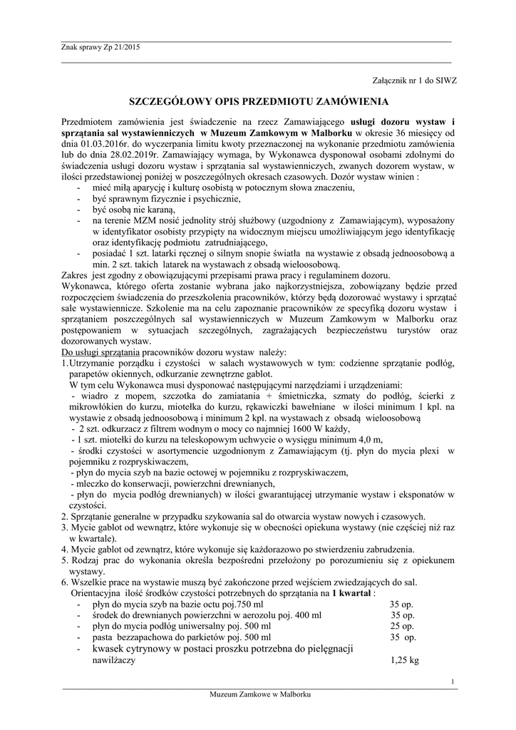 ___________________________________________________________________________ Znak sprawy Zp 21/2015 ___________________________________________________________________________ Załącznik nr 1 do SIWZ SZCZEGÓŁOWY OPIS PRZEDMIOTU ZAMÓWIENIA Przedmiotem zamówienia jest świadczenie na rzecz Zamawiającego usługi dozoru wystaw i sprzątania sal wystawienniczych w Muzeum Zamkowym w Malborku w okresie 36 miesięcy od dnia 01.03.2016r. do wyczerpania limitu kwoty przeznaczonej na wykonanie przedmiotu zamówienia lub do dnia 28.02.2019r. Zamawiający wymaga, by Wykonawca dysponował osobami zdolnymi do świadczenia usługi dozoru wystaw i sprzątania sal wystawienniczych, zwanych dozorem wystaw, w ilości przedstawionej poniżej w poszczególnych okresach czasowych. Dozór wystaw winien : - mieć miłą aparycję i kulturę osobistą w potocznym słowa znaczeniu, - być sprawnym fizycznie i psychicznie, - być osobą nie karaną, - na terenie MZM nosić jednolity strój służbowy (uzgodniony z Zamawiającym), wyposażony w identyfikator osobisty przypięty na widocznym miejscu umożliwiającym jego identyfikację oraz identyfikację podmiotu zatrudniającego, - posiadać 1 szt. latarki ręcznej o silnym snopie światła na wystawie z obsadą jednoosobową a min. 2 szt. takich latarek na wystawach z obsadą wieloosobową. Zakres jest zgodny z obowiązującymi przepisami prawa pracy i regulaminem dozoru. Wykonawca, którego oferta zostanie wybrana jako najkorzystniejsza, zobowiązany będzie przed rozpoczęciem świadczenia do przeszkolenia pracowników, którzy będą dozorować wystawy i sprzątać sale wystawiennicze. Szkolenie ma na celu zapoznanie pracowników ze specyfiką dozoru wystaw i sprzątaniem poszczególnych sal wystawienniczych w Muzeum Zamkowym w Malborku oraz postępowaniem w sytuacjach szczególnych, zagrażających bezpieczeństwu turystów oraz dozorowanych wystaw. Do usługi sprzątania pracowników dozoru wystaw należy: 1. Utrzymanie porządku i czystości w salach wystawowych w tym: codzienne sprzątanie podłóg, parapetów okiennych, odkurzanie zewnętrzne gablot. W tym celu Wykonawca musi dysponować następującymi narzędziami i urządzeniami: - wiadro z mopem, szczotka do zamiatania + śmietniczka, szmaty do podłóg, ścierki z mikrowłókien do kurzu, miotełka do kurzu, rękawiczki bawełniane w ilości minimum 1 kpl. na wystawie z obsadą jednoosobową i minimum 2 kpl. na wystawach z obsadą wieloosobową - 2 szt. odkurzacz z filtrem wodnym o mocy co najmniej 1600 W każdy, - 1 szt. miotełki do kurzu na teleskopowym uchwycie o wysięgu minimum 4,0 m, - środki czystości w asortymencie uzgodnionym z Zamawiającym (tj. płyn do mycia plexi w pojemniku z rozpryskiwaczem, - płyn do mycia szyb na bazie octowej w pojemniku z rozpryskiwaczem, - mleczko do konserwacji, powierzchni drewnianych, - płyn do mycia podłóg drewnianych) w ilości gwarantującej utrzymanie wystaw i eksponatów w czystości. 2. Sprzątanie generalne w przypadku szykowania sal do otwarcia wystaw nowych i czasowych. 3. Mycie gablot od wewnątrz, które wykonuje się w obecności opiekuna wystawy (nie częściej niż raz w kwartale). 4. Mycie gablot od zewnątrz, które wykonuje się każdorazowo po stwierdzeniu zabrudzenia. 5. Rodzaj prac do wykonania określa bezpośredni przełożony po porozumieniu się z opiekunem wystawy. 6. Wszelkie prace na wystawie muszą być zakończone przed wejściem zwiedzających do sal. Orientacyjna ilość środków czystości potrzebnych do sprzątania na 1 kwartał : - płyn do mycia szyb na bazie octu poj.750 ml 35 op. - środek do drewnianych powierzchni w aerozolu poj. 400 ml 35 op. - płyn do mycia podłóg uniwersalny poj. 500 ml 25 op. - pasta bezzapachowa do parkietów poj. 500 ml 35 op. - kwasek cytrynowy w postaci proszku potrzebna do pielęgnacji nawilżaczy 1,25 kg 1 ____________________________________________________________________________ Muzeum Zamkowe w Malborku ___________________________________________________________________________ Znak sprawy Zp 21/2015 ___________________________________________________________________________ 7. Każdemu pracownikowi dozoru zostaje przydzielona codziennie do pilnowania wystawa, za którą przyjmuje i ponosi odpowiedzialność. 8. Po przejściu na wyznaczone miejsce dozoru, pracownik ma obowiązek sprawdzić czy eksponaty znajdują się na swoich miejscach i czy nie widać na nich śladów uszkodzeń. W przypadku zauważenia jakichkolwiek zmian należy powiadomić swojego bezpośredniego przełożonego. 9. Po wejściu zwiedzających na wystawę zadaniem pracownika dozoru jest: a/ pilnowanie przydzielonej mu wystawy, b/ zwracanie uwagi, aby zwiedzający nie dotykali eksponatów lub nie przekraczali strefy bezpieczeństwa wyznaczonej linią na podłodze lub barierkami, c/ stałe kontrolowanie stanu eksponatów, d/obsługa sprzętu do regulowania warunków wilgotnościowych na wystawach, tj. nawilżaczy osuszaczy: • sukcesywne uzupełnianie wody w nawilżaczach – szczególnie należy uważać aby nie rozlewać wody poza otwór wlewu i nie zalewać panelu sterowania elektronicznego, do tego celu należy używać specjalnie do tego przeznaczonych konewek, w które wyposażone są wystawy, • wymiana filtrów w nawilżaczach – szczególnie należy zwrócić uwagę na precyzyjne zamontowanie wszystkich elementów przed uruchomieniem sprzętu; przy montażu nie należy używać nadmiernej siły, aby nie uszkodzić plastikowych części, • mycie w czystej wodzie wewnętrznych plastikowych części nawilżaczy oraz miedzianych czujników wody mających bezpośredni kontakt z wodą, w częstotliwości 2-3 tygodniowej w przypadku ciągłego lub okresowego funkcjonowania nawilżaczy; usunięcie osadów z użyciem delikatnych środków wyłącznie na bazie kwasku cytrynowego rozpuszczonego w wodzie w stężeniu do 5% w razie stwierdzenia zakamieniania; • czyszczenie części stalowych malowanych i o