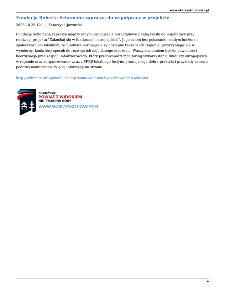 www.skarzysko.powiat.pl Fundacja Roberta Schumana zaprasza do współpracy w projekcie 2008-10-28 12:11, Katarzyna Jaworska Fundacja Schumana zaprasza między innymi organizacje pozarządowe z całej Polski do współpracy przy realizacji projektu "Zakochaj się w funduszach europejskich". Jego celem jest pokazanie młodym ludziom i społecznościom lokalnym, że fundusze europejskie są dostępne także w ich regionie, przyczyniając się w wymierny, konkretny sposób do rozwoju ich najbliższego otoczenia. Waszym zadaniem będzie powołanie i koordynacja prac zespołu młodzieżowego, który przeprowadzi monitoring wykorzystania funduszy europejskich w regionie oraz zorganizowanie wraz z PFRS lokalnego festynu promującego dobre praktyki i przykłady zebrane podczas monitoringu. Więcej informacji na stronie: http://schuman.org.pl/modules.php?name=Content&pa=showpage&pid=684 1