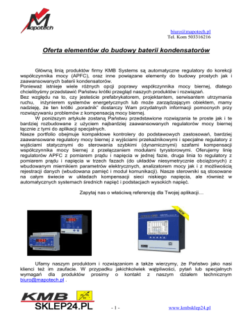 [email protected] Tel. Kom 503316216 Oferta elementów do budowy baterii kondensatorów Główną linią produktów firmy KMB Systems są automatyczne regulatory do korekcji współczynnika mocy (APFC), oraz inne powiązane elementy do budowy prostych jak i zaawansowanych baterii kondensatorów. Ponieważ istnieje wiele różnych opcji poprawy współczynnika mocy biernej, dlatego chcielibyśmy przedstawić Państwu krótki przegląd naszych produktów i rozwiązań. Bez względu na to, czy jesteście prefabrykatorem, projektantem, serwisantem utrzymania ruchu, inżynierem systemów energetycznych lub może zarządzającym obiektem, mamy nadzieję, że ten krótki „poradnik” dostarczy Wam przydatnych informacji pomocnych przy rozwiązywaniu problemów z kompensacją mocy biernej. W poniższym artykule zostaną Państwu przedstawione rozwiązania te proste jak i te bardziej rozbudowane z użyciem najbardziej zaawansowanych regulatorów mocy biernej łącznie z tymi do aplikacji specjalnych. Nasze portfolio obejmuje kompaktowe kontrolery do podstawowych zastosowań, bardziej zaawansowane regulatory mocy biernej z wyjściami przekaźnikowymi i specjalne regulatory z wyjściami statycznymi do sterowania szybkimi (dynamicznymi) szafami kompensacji współczynnika mocy biernej z przełączaniem modułami tyrystorowymi. Oferujemy linię regulatorów APFC z pomiarem prądu i napięcia w jednej fazie, druga linia to regulatory z pomiarem prądu i napięcia w trzech fazach (do układów niesymetrycznie obciążonych) z wbudowanym miernikiem parametrów elektrycznych, analizatorem mocy jak i z możliwością rejestracji danych (wbudowana pamięć i moduł komunikacji). Nasze sterowniki są stosowane na całym świecie w układach kompensacji sieci niskiego napięcia, ale również w automatycznych systemach średnich napięć i podstacjach wysokich napięć. Zapytaj nas o właściwą referencję dla Twojej aplikacji… Ufamy naszym produktom i rozwiązaniom a także wierzymy, że Państwo jako nasi klienci też im zaufacie. W przypadku jakichkolwiek wątpliwości, pytań lub specjalnych wymagań dla produktów prosimy o kontakt z naszym działem technicznym [email protected] . -1- www.kmbsklep24.pl [email protected] Tel. Kom 503316216 Funkcje i cechy wspólne regulatorów NOVAR.. Wszystkie nasze regulatory mają wiele cech wspólnych dla kontrolerów tych z linii najbardziej zaawansowanych. Naszą filozofią jest zapewnienie prostej instalacji, stałego monitorowania i ochrony całego systemu kompensacji, oraz podjęcie wszelkich możliwych działań aby zwiększyć trwałość, niezawodność układu i ewentualnie dostarczenie wszystkich ważnych danych z monitoringu na prostą integrację w ramach zdalnego sterowania i systemu SCADA, OPC itp. Specyfikacja techniczna: Zasady pomiaru – precyzyjne i poprawne. precyzyjny pomiar prądu i współczynnika mocy, precyzyjny pomiar i sterowanie w trudnych warunkach (sieci odkształcone), ocena poziomu zniekształceń harmonicznych (THD), ocena aktualnego przeciążenia harmonicznego kondensatorów (CHL), pomiar temperatury wbudowanym czujnikiem i sterowanie wentylatorami, kompensacja indukcyjna i pojemnościowa rozproszonych układów w tym samym czasie. Zasady kontroli – dbanie o jak najdłuższą trwałość układu. oddzielne programowanie czasu reakcji dla załączenia i wyłączenia stopnia, czas reakcji skraca się proporcjonalnie do zmian zapotrzebowania na moc bierną, inteligentne ograniczenie całkowitej ilości ingerencji (załączeń/wyłączeń stopni), opcja regulacji przekompensowanej sieci (regulacja mocy biernej pojemnościowej), funkcja drugiej taryfy uruchamiana przepływem energii lub opcjonalnym wejściem, każdy stopień może być ustawiony jako wyjście automatycznie kontrolowane, wyjście stałe lub wyjście alarmowe, wyjścia mogą sterować urządzeniami chłodzącymi lub grzejnymi. Skuteczne działanie – prosta i szybka instalacja. obsługiwanie wszystkich kombinacji napięć i prądów pomiarowych, automatyczna detekcja podłączenia napięcia znamionowego, sekcja automatycznego rozpoznawania, podczas instalacji regulator automatycznie rozpoznaje moc każdego stopnia, obsługuje wszystkie typy i każdą moc na wyjściach sterujących (na każdym stopniu indywidualnie wprowadzamy wartość mocy pojemnościowej lub indukcyjnej), podczas procesu regulacji ciągła kontrola wyjść, uszkodzone wyjścia są automatycznie wycofywane z procesu regulacji i oznaczane alarmem, automatyczne ponowne podłączenie uszkodzonych wyjść po zakończonym procesie naprawy, niezależne konfigurowanie przekaźników wyjściowych dla funkcji wyświetlania alarmu lub reakcji. -2- www.kmbsklep24.pl [email protected] Tel. Kom 503316216 Tab.1. Tabela porównawcza oferowanych regulatorów: Podstawowy automatyczny model do kompensacji mocy biernej: W tej kategorii – funkcjonalna prostota, kompaktowe wymiary i bardzo dobra cena jest zawsze naszym atutem. Ta kategoria oferuje podstawowe regulatory z pomiarem prądu na poziomie 20mA (przy nominalnej wartości 5A), 6 lub 8 kontrolowanych wyjść przekaźnikowych. Mamy do wyboru dwa modele, jeden do montażu tablicowego drugi do montażu na szynie DIN. NOVAR1005/1007 – montaż tablicowy 96x96. Sterowniki te przeznaczone są do małych układów kompensacji, mniej wymagających aplikacji z ograniczeniami budżetowymi. Oba są w pełni zautomatyzowane i nie wymagają żadnej konfiguracji w typowym układzie (proces odbywa się automatycznie). Pomiar w jednej fazie, kontrola i automatyczne sterowanie stopniami odbywa się inteligentnie, aby zwiększyć całkowitą żywotność układu kompensacji. NOVAR1007 posiada 8 wyjść przekaźnikowych. W obu modelach funkcja kontroli temperatury może być stosowana dla jednego przekaźnika wyjściowego aby zapewnić chłodzenie w obudowie baterii kondensatorów. NOVAR1005D/1007D – montaż na szynie DIN. Dzieli te same wszystkie funkcje i parametry co popr