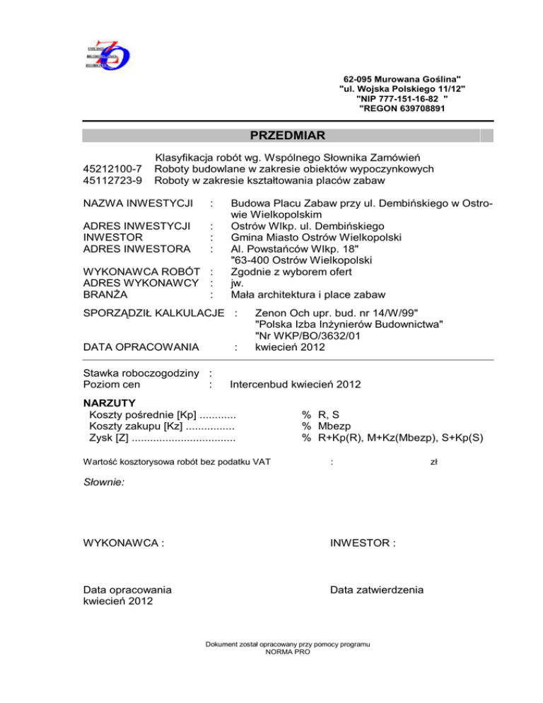 62-095 Murowana Goślina" "ul. Wojska Polskiego 11/12" "NIP 777-151-16-82 " "REGON 639708891 PRZEDMIAR 45212100-7 45112723-9 Klasyfikacja robót wg. Wspólnego Słownika Zamówień Roboty budowlane w zakresie obiektów wypoczynkowych Roboty w zakresie kształtowania placów zabaw NAZWA INWESTYCJI : ADRES INWESTYCJI INWESTOR ADRES INWESTORA : : : WYKONAWCA ROBÓT : ADRES WYKONAWCY : BRANŻA : Budowa Placu Zabaw przy ul. Dembińskiego w Ostrowie Wielkopolskim Ostrów Wlkp. ul. Dembińskiego Gmina Miasto Ostrów Wielkopolski Al. Powstańców Wlkp. 18" "63-400 Ostrów Wielkopolski Zgodnie z wyborem ofert jw. Mała architektura i place zabaw SPORZĄDZIŁ KALKULACJE : DATA OPRACOWANIA : Stawka roboczogodziny : Poziom cen : Zenon Och upr. bud. nr 14/W/99" "Polska Izba Inżynierów Budownictwa" "Nr WKP/BO/3632/01 kwiecień 2012 Intercenbud kwiecień 2012 NARZUTY Koszty pośrednie [Kp] ............ Koszty zakupu [Kz] ................ Zysk [Z] .................................. Wartość kosztorysowa robót bez podatku VAT % R, S % Mbezp % R+Kp(R), M+Kz(Mbezp), S+Kp(S) : Słownie: WYKONAWCA : INWESTOR : Data opracowania kwiecień 2012 Data zatwierdzenia Dokument został opracowany przy pomocy programu NORMA PRO zł OBMIAR Lp. Podstawa Opis i wyliczenia Budowa placu zabaw - ul. Dembińskiego 1 Roboty ziemne 1 KNR-W 2-01 Roboty pomiarowe przy powierzchniowych robotach ziemnych d.1 0114-02 koryta pod nawierzchnie placów 0,27147 j.m. 4 KNR 2-31 d.1 0401-03 5 KNR 2-31 d.1 0402-01 6 KNR 2-31 d.1 0407-05 analogia 2 2.1 7 KNNR 6 d.2.1 0103-01 8 KNNR 6 d.2.1 0104-03 9 KNR 2-21 d.2.1 0606-07 analogia 2.2 10 KNNR 1 d.2.2 0526-01 ha 11 KNNR 1 d.2.2 0502-01 12 KNR 2-23 d.2.2 0208-02 13 KNR 2-23 d.2.2 0207-01 14 KNR 2-23 d.2.2 0209-02 3 15 kalk. własna d.3 m2 m Ława pod krawężniki z pospółki m3 32,00*0,20*0,20 m3 Obrzeża gumowe (poliuretanowe) o wymiarach 100x25x4 cm na podsypce cementowo-piaskowej z wypełnieniem spoin klejem m 32,00 m m Roboty nawierzchniowe Bezpieczna nawierzchnia żwirowa Profilowanie i zagęszczanie podłoża wykonywane ręcznie w grun- m2 cie kat. II-IV pod warstwy konstrukcyjne nawierzchni 160,50 m2 Warstwy odsączające wykonane i zagęszczane mechanicznie o gr.10 cm poz.7 m2 Plac zabaw nawierzchnia bezpieczna - wypełnienie piaskiem m3 poz.7*0,30 m3 m2 m3 Jednokrotne zagęszczanie podłoża lub warstwy wegetacyjnej wal- ha cem gładkim 0,0746 ha Wysiew nawozów mineralnych granulowanych ręcznie ha poz.12 ha Ręczne wykonywanie nawierzchni trawiastej siewem z przykryciem nasion po wysiewie walcem kolczatką poz.11 m2 m2 Wyposażenie placów zabaw Dostawa i montaż wraz z fundamentowaniem kpl. Zestaw sprawnościowy 5318 1 kpl. Norma PRO Wersja 4.37 Nr seryjny: 2226 Użytkownik: Zenon Och 0,271 235,100 RAZEM 235,100 235,100 RAZEM 235,100 32,000 RAZEM 32,000 1,280 RAZEM 1,280 32,000 RAZEM 32,000 160,500 RAZEM 160,500 160,500 RAZEM 160,500 48,150 RAZEM 48,150 70,530 RAZEM 70,530 74,600 RAZEM 74,600 0,075 RAZEM 0,075 0,075 RAZEM 0,075 74,600 RAZEM 74,600 1,000 RAZEM 1,000 m3 Mechaniczne plantowanie powierzchni gruntu rodzimego równiar- m2 ką; grunt kat.I-III 74,60 m2 2 0,271 RAZEM m2 Rowki pod krawężniki i ławy krawężnikowe o wymiarach 30x30 cm w gruncie kat.I-II 32,00 Nawierzchnia trawiasta Rozścielenie ziemi urodzajnej (humusu) spycharką na terenie płaskim <z korytowania>poz.2*0,30 Razem ha 2 KNR-W 2-01 Usunięcie warstwy ziemi urodzajnej (humusu) o grub.do 15 cm za m2 d.1 0119-01 pomocą spycharek 235,10 m2 3 KNR-W 2-01 Usunięcie warstwy ziemi urodzajnej (humusu) za pomocą spyd.1 0119-02 charek - dodatek za każde dalsze 5 cm grubości Krotność = 3 poz.2 Poszcz OBMIAR Lp. Podstawa 16 kalk. własna d.3 17 kalk. własna d.3 18 kalk. własna d.3 19 kalk. własna d.3 20 kalk. własna d.3 21 kalk. własna d.3 22 kalk. własna d.3 Opis i wyliczenia Dostawa i montaż wraz z fundamentowaniem j.m. kpl. Huśtawka wahadłowa 2 osobowa 4142 1 kpl. Dostawa i montaż wraz z fundamentowaniem kpl. Huśtawka wahadłowa 2 osobowa 4142 1 kpl. Dostawa i montaż wraz z fundamentowaniem kpl. Huśtawka kiwak "Samolot" 1 kpl. Dostawa i montaż wraz z fundamentowaniem kpl. Huśtawka kiwak "Superbike" 1 kpl. Dostawa i montaż wraz z fundamentowaniem kpl. Tablica z regulaminem 1 kpl. Dostawa i montaż wraz z fundamentowaniem kpl. ławka z oparciem 2 kpl. Dostawa i montaż wraz z fundamentowaniem kpl. Koszna śmieci 1 kpl. 4 45340000-2 OGRODZENIE 23 Podmurówka systemowa z prefabrykatów betonowych d.4 analiza indywidualna 67,50 m m 25 Systemowe ogrodzenie placu zabaw - furtka d.4 analiza indywidualna 1 szt Norma PRO Wersja 4.37 Nr seryjny: 2226 Użytkownik: Zenon Och Razem 1,000 RAZEM 1,000 1,000 RAZEM 1,000 1,000 RAZEM 1,000 1,000 RAZEM 1,000 1,000 RAZEM 1,000 2,000 RAZEM 2,000 1,000 RAZEM 1,000 67,500 RAZEM 67,500 67,500 RAZEM 67,500 1,000 RAZEM 1,000 m 24 Systemowe ogrodzenie placu zabaw - panele d.4 analiza indywidualna 67,50 3 Poszcz m szt OFERTA Lp. Podstawa wyceny Opis 1 2 3 Budowa placu zabaw - ul. Dembińskiego 1 Roboty ziemne 1 KNR-W 2-01 Roboty pomiarowe przy powierzchniowych robotach d.1 0114-02 ziemnych - koryta pod nawierzchnie placów 2 KNR-W 2-01 Usunięcie warstwy ziemi urodzajnej (humusu) o grub. d.1 0119-01 do 15 cm za pomocą spycharek 3 KNR-W 2-01 Usunięcie warstwy ziemi urodzajnej (humusu) za pod.1 0119-02 mocą spycharek - dodatek za każde dalsze 5 cm grubości Krotność = 3 4 KNR 2-31 Rowki pod krawężniki i ławy krawężnikowe o wymiad.1 0401-03 rach 30x30 cm w gruncie kat.I-II 5 KNR 2-31 Ława pod krawężniki z pospółki d.1 0402-01 6 KNR 2-31 Obrzeża gumowe (poliuretanowe) o wymiarach d.1 0407-05 100x25x4 cm na podsypce cementowo-piaskowej z analogia wypełnieniem spoin klejem 2 Roboty nawierzchniowe 2.1 Bezpieczna nawierzchnia żwirowa 7 KNNR 6 0103- Profilowanie i zagęszczanie podłoża wykonywane d.2. 01 ręcznie w gruncie kat. II-IV pod warstwy konstrukcyjne 1 nawierzchni 8 KNNR 6 0104- Warstwy odsączające wykonane i zagęszczane med.2. 03 chanicznie 