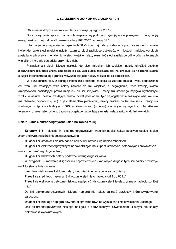 OBJAŚNIENIA DO FORMULARZA G-10.5 Objaśnienia dotyczą wzoru formularza obowiązującego za 2011 r. Do sporządzania sprawozdania zobowiązane są podmioty zajmujące się przesyłem i dystrybucją energii elektrycznej, zaklasyfikowane według PKD 2007 do grupy 35.1. Informacje dotyczące sieci o napięciach 30 kV i poniŜej naleŜy podawać w podziale na sieci miejskie i wiejskie. Jako sieci miejskie naleŜy rozumieć sieci zasilające odbiorców w miastach i miejscowościach posiadających prawa miejskie. Jako sieci wiejskie naleŜy rozumieć sieci zasilające odbiorców na terenach wiejskich, które nie posiadają praw miejskich. PrzynaleŜność sieci niskiego napięcia do sieci miejskich lub wiejskich naleŜy określać zgodnie z przynaleŜnością stacji SN/nN zasilającej tę sieć. Jeśli stacja zasilająca sieć nN znajduje się na terenie miasta a część linii przekracza jego granice, wówczas całą sieć naleŜy zaliczać do sieci miejskich. W przypadkach kiedy z jednego trzonu linii średniego napięcia są zasilane miasta i wsie, odgałęzienia od trzonu linii zasilające wsie naleŜy zaliczać do linii wiejskich, a odgałęzienia, które zasilają miasta (miejscowości posiadające prawa miejskie), do linii miejskich. Trzony linii średniego napięcia wychodzące z GPZ w kierunku miasta i zasilające miasto, nawet jeŜeli od linii tych są odgałęzienia zasilające wsie, ale linia ma charakter typowo miejski (np. jest elementem pierścienia), naleŜy zaliczać do linii miejskich. Trzony linii średniego napięcia wychodzące z GPZ w kierunku wsi (w teren), cechujące się wyraźnym charakterem terenowym, nawet jeŜeli od tego trzonu są odgałęzienia zasilające miasta, naleŜy zaliczać do linii wiejskich. Dział 1. Linie elektroenergetyczne (stan na koniec roku) Kolumny 1–5 – długość linii elektroenergetycznych wysokich napięć naleŜy podawać według napięć znamionowych, na które linia została zbudowana. Długość linii średnich i niskich napięć naleŜy wykazywać wg napięć roboczych. Długość linii elektroenergetycznych napowietrznych na słupach stalowych, betonowych i drewnianych naleŜy podawać wg długości trasy. Długość linii kablowych naleŜy podawać według długości kabla. W przypadku sumowania długości linii napowietrznych i kablowych długość tych linii naleŜy przeliczyć na 1 tor (takŜe linie 4-torowe). Jako linie wielotorowe kablowe naleŜy rozumieć linie łączące te same obiekty. Przez linie średniego napięcia (SN) rozumie się linie o napięciu od 1 do 60 kV. Przez linie elektroenergetyczne niskiego napięcia (nN) rozumie się linie elektryczne o napięciu poniŜej 1 kV. Do linii elektroenergetycznych niskiego napięcia nie naleŜy zaliczać przyłączy, które wykazywane są osobno. Długość linii niskiego napięcia powinna obejmować równieŜ wydzielone linie oświetlenia ulicznego. Linii elektroenergetycznych niskiego napięcia z podwieszonym oświetleniem ulicznym nie naleŜy traktować jako dwutorowych. Dział 2. Stacje elektroenergetyczne (stan na koniec roku) Kolumny 1 - 3 – przez stację elektroenergetyczną rozumie się obiekt, którego cechą charakterystyczną jest wyposaŜenie w co najmniej jeden transformator lub aparaturę rozdzielczą lub w jedno i drugie. Moc stacji określana jest przez moc transformatorów zainstalowanych na stacji. O przynaleŜności stacji do określonego napięcia decyduje najwyŜsze napięcie sieci, z jakim współpracuje stacja elektroenergetyczna. Przy określaniu mocy stacji naleŜy przyjmować moc pozorną transformatorów czynnych, do których zaliczamy transformatory: a) współpracujące z szynami stacji, siecią lub urządzeniami elektrowni względnie szynami elektrowni, b) pozostające w rezerwie, jeŜeli mają własne stanowiska i połączone są z urządzeniami czynnymi, c) niezdemontowane ze stanowiska, jeśli stanowią majątek operatora systemu dystrybucyjnego (OSD). Przez stacje napowietrzno−wnętrzowe naleŜy rozumieć stacje, których część jest napowietrzna (np. rozdzielnia wysokiego napięcia) a część wnętrzowa (np. rozdzielnia średniego napięcia). Przez wartość początkową linii lub stacji rozumie się wartość księgową zaktualizowaną według ogólnie przyjętych zasad przewartościowania majątku trwałego. Przez wartość stacji naleŜy rozumieć wartość urządzeń, gruntu oraz budynków. Wartość netto jest to wartość początkowa pomniejszona o umorzenie. Kolumny dotyczące wartości początkowej i wartości netto naleŜy wypełnić tylko dla elementów sieci, które są własnością OSD i operatora systemu przesyłowego (OSP). W wierszach 04, 06 i 20 naleŜy podać liczbę i moc stacji będących własnością odbiorców zasilanych bezpośrednio z sieci operatora systemu elektroenergetycznego. W wierszach tych nie naleŜy podawać wartości początkowych i wartości netto. Dział 3. Transformatory sieciowe OSP i OSD (stan na koniec roku) NaleŜy podać liczbę, moc pozorną oraz wartość początkową transformatorów sieciowych, tj. transformatorów na potrzeby przesyłu i rozdziału mocy, wraz z transformatorami potrzeb własnych w stacjach. W dziale tym naleŜy uwzględnić transformatory będące własnością OSP i OSD. W kaŜdej grupie napięciowej naleŜy podać liczbę, moc i wartość transformatorów pracujących oraz liczbę, moc i wartość transformatorów będących w rezerwie magazynowej. Transformatory naleŜy uszeregować według napięcia znamionowego sieci, do której transformator jest przyłączony. Transformatory stanowiące zespół naleŜy podawać jako jeden transformator (np. trzy transformatory jednofazowe). Dział 4. Środki trwałe według klasyfikacji rodzajowej oraz nakłady na środki trwałe, w tys. zł NaleŜy podać wartość środków trwałych przedsiębiorstwa zaangaŜowanych do dystrybucji energii elektrycznej według klasyfikacji rodzajowej GUS. W wierszu 16 naleŜy wykazać wartoś