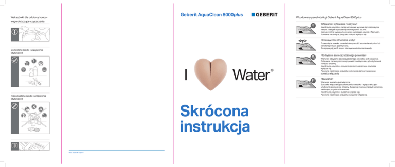 Geberit AquaClean 8000plus Wskazówki dla odbiorcy końcowego dotyczące czyszczenia Wbudowany panel obsługi Geberit AquaClean 8000plus Włączanie i wyłączanie <natrysku> Naciśnięcie przycisku: ramię natryskowe wysuwa się i rozpoczyna natrysk. Natrysk wyłącza się automatycznie po 20°s. Natrysk można wyłączyć wcześniej, naciskając przycisk <Natrysk>. Ponowne naciśnięcie przycisku: natrysk wyłącza się. <Intensywność strumienia wody> Przesunięcie suwaka zmienia intensywność strumienia natrysku lub perlatora podczas podmywania. Do dyspozycji jest 7 stopni intensywności strumienia wody. Dozwolone środki i urządzenia czyszczące <Odsysanie zanieczyszczonego powietrza> Warunek: odsysanie zanieczyszczonego powietrza jest włączone. Odsysanie zanieczyszczonego powietrza włącza się, gdy użytkownik korzysta z toalety. Naciśnięcie przycisku: odsysanie zanieczyszczonego powietrza wyłącza się. Ponowne naciśnięcie przycisku: odsysanie zanieczyszczonego powietrza włącza się. <Suszarka> Warunek: suszarka jest włączona. Suszarka włącza się po zakończeniu natrysku i wyłącza się, gdy użytkownik podnosi się z toalety. Suszarkę można wyłączyć wcześniej, naciskając przycisk <Suszarka>. Naciśnięcie przycisku: suszarka wyłącza się. Ponowne naciśnięcie przycisku: suszarka włącza się. Niedozwolone środki i urządzenia czyszczące Skrócona instrukcja 965.356.00.0 (01) Pilot zdalnej obsługi Geberit AquaClean 8000plus Funkcje dodatkowe pilota zdalnej obsługi Geberit AquaClean 8000plus Przy pomocy pilota zdalnej obsługi można aktywować wszystkie funkcje dodatkowe lub dokonać indywidualnych ustawień oraz zapisywać je. Pilot zdalnej obsługi uruchamiany jest przez naciśnięcie dowolnego przycisku. Wyświetlacz włącza się. Po upływie 10 minut od użycia wyświetlacz wyłącza się samoczynnie. Wyświetlacz D1 D2 D3 D4 D5 D6 D7 D8 D9 D10 D11 D12 D13 D14 Wskaźnik temperatury wody w natrysku/ powietrza z suszarki Temperatura powietrza z suszarki Wskaźnik serwisu Wskaźnik statusu podgrzewania wody w zbiorniku Wskaźnik poziomu środka do dezynfekcji dyszy Wskaźnik wymiany filtra Odsysanie zanieczyszczonego powietrza Suszarka Pozycja ramienia natryskowego Natrysk oscylacyjny Masaż strumieniem wody Intensywność strumienia wody Wskaźnik usterki Aktywny profil użytkownika I/II/III/IIII D1 D3 8 9 10 11 12 13 Włączanie i wyłączanie <natrysku> Zmniejszanie <intensywności strumienia wody –> Zwiększanie <intensywności strumienia wody +> <Odsysanie zanieczyszczonego powietrza> <Suszarka> Włączanie i wyłączanie <natrysku oscylacyjnego> <Pozycja ramienia natryskowego> do przodu i do tyłu <Serwis> <Temperatura wody w natrysku/ powietrza z suszarki> <Podgrzewanie wody w zbiorniku> ON/tryb oszczędzania energii/OFF Włączanie i wyłączanie <masażu strumieniem wody> <Profile użytkowników I/II/III/IIII> wł. i wył. <Perlator> Naciśnięcie przycisku: uruchamia spłukiwanie całą ilością wody, znajdującą się w spłuczce (Geberit AquaClean 8000plus z niezabudowaną spłuczką). <Profil użytkownika> D12 D4 D5 D6 D11 D7 <Masaż strumieniem wody> D10 D9 Naciśnięcie przycisku: profil użytkownika z zapisanymi ustawieniami zostaje aktywowany. Pulsujący masaż strumieniem wody jest przyjemny i odprężający. Naciśnięcie przycisku: masaż strumieniem wody zostaje włączony. Funkcję tę można włączyć przed lub podczas działania natrysku. Ponowne naciśnięcie przycisku: masaż strumieniem wody zostaje wyłączony. D8 <Pozycja ramienia natryskowego> Odpowiednio do przycisku ze strzałką i w zależności od pozycji siedzącej można przesunąć ramię natryskowe na jedną z 7 pozycji do przodu lub do tyłu. Naciśnięcie przycisku: ustawienie pozycji ramienia natryskowego. Geberit AquaClean 8000plus jest wysokowartościowym produktem, niezwykle łatwym do pielęgnacji. Miska ustępowa ma specjalną powłokę. Dzięki tej powłoce krople wody przyciągają się, tworząc kuliste formy i dobrze ściekają. Pozostałości takie jak kamień i zanieczyszczenia są zamykane w kroplach wody i po prostu spłukiwane wraz z nią. Efekt ten jest szczególnie przyjazny dla środowiska, ponieważ nie są już potrzebne agresywne środki do czyszczenia toalety. Dozwolone środki i urządzenia czyszczące Środek czyszczący może być lekko kwaśny, np. kwas cytrynowy Środek czyszczący najlepiej rozcieńczyć z wodą Środek czyszczący musi być płynny Środek czyszczący musi być łagodny dla skóry Środek czyszczący może się pienić <Natrysk oscylacyjny> Przyciski 1 2 3 4 5 6 7 Delikatny strumień wody podmywa wyjątkowo łagodnie i przyjemnie. Naciśnięcie przycisku: ramię natryskowe wysuwa się i rozpoczyna natrysk. Natrysk wyłącza się po 20 s. Natrysk można wyłączyć wcześniej, naciskając przycisk <Natrysk>. <Spłukiwanie toalety> D2 D14 D13 <Perlator> Pielęgnacja i czyszczenie 2 3 1 13 4 5 12 11 10 9 W toalecie Geberit AquaClean 8000plus dla spłuczek niezabudowanych można ustawić jeden z trzech profili użytkownika. Wersja ta posiada dodatkowo przycisk <spłukiwania toalety>, służący do uruchamiania spłukiwania. 6 7 8 Natrysk oscylacyjny zwiększa efektywność podmywania. Naciśnięcie przycisku: natrysk oscylacyjny zostaje włączony. Funkcję tę można włączyć przed lub podczas działania natrysku. Ramię natryskowe przesuwa się w przód i w tył. Ponowne naciśnięcie przycisku: natrysk oscylacyjny wyłącza się. <Podgrzewanie wody w zbiorniku> Naciśnięcie przycisku: • Wskaźnik : podgrzewanie jest włączone. Temperatura wody jest ustawiona wstępnie na 37°. : tryb oszczędzania energii (ustawienie fabryczne). • Wskaźnik Podgrzewanie włącza się dopiero po zadziałaniu wykrywania użytkownika. Czas podgrzewu wynosi od 3 do 4 min. : podgrzewanie jest wyłączone. • Wskaźnik <Temperatura natrysku> Ustawianie żądanej temperatury natrysku. Naciśnięcie przycisku: podniesienie