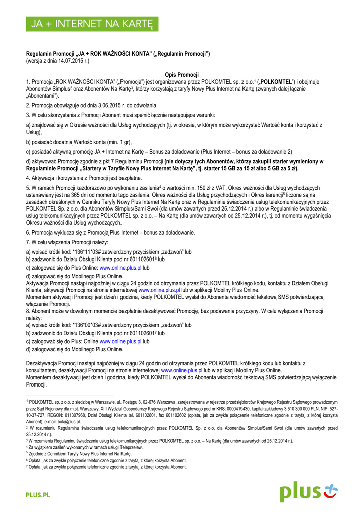 Regulamin Promocji „JA + ROK WAŻNOŚCI KONTA” („Regulamin Promocji”) (wersja z dnia 14.07.2015 r.) Opis Promocji 1. Promocja „ROK WAŻNOŚCI KONTA” („Promocja”) jest organizowana przez POLKOMTEL sp. z o.o.1 („POLKOMTEL”) i obejmuje Abonentów Simplus2 oraz Abonentów Na Kartę3, którzy korzystają z taryfy Nowy Plus Internet na Kartę (zwanych dalej łącznie „Abonentami”). 2. Promocja obowiązuje od dnia 3.06.2015 r. do odwołania. 3. W celu skorzystania z Promocji Abonent musi spełnić łącznie następujące warunki: a) znajdować się w Okresie ważności dla Usług wychodzących (tj. w okresie, w którym może wykorzystać Wartość konta i korzystać z Usług), b) posiadać dodatnią Wartość konta (min. 1 gr), c) posiadać aktywną promocję JA + Internet na Kartę – Bonus za doładowanie (Plus Internet – bonus za doładowanie 2) d) aktywować Promocję zgodnie z pkt 7 Regulaminu Promocji (nie dotyczy tych Abonentów, którzy zakupili starter wymieniony w Regulaminie Promocji „Startery w Taryfie Nowy Plus Internet Na Kartę”, tj. starter 15 GB za 15 zł albo 5 GB za 5 zł). 4. Aktywacja i korzystanie z Promocji jest bezpłatne. 5. W ramach Promocji każdorazowo po wykonaniu zasilenia 4 o wartości min. 150 zł z VAT, Okres ważności dla Usług wychodzących ustanawiany jest na 365 dni od momentu tego zasilenia. Okres ważności dla Usług przychodzących i Okres karencji5 liczone są na zasadach określonych w Cenniku Taryfy Nowy Plus Internet Na Kartę oraz w Regulaminie świadczenia usług telekomunikacyjnych przez POLKOMTEL Sp. z o.o. dla Abonentów Simplus/Sami Swoi (dla umów zawartych przed 25.12.2014 r.) albo w Regulaminie świadczenia usług telekomunikacyjnych przez POLKOMTEL sp. z o.o. – Na Kartę (dla umów zawartych od 25.12.2014 r.), tj. od momentu wygaśnięcia Okresu ważności dla Usług wychodzących. 6. Promocja wyklucza się z Promocją Plus Internet – bonus za doładowanie. 7. W celu włączenia Promocji należy: a) wpisać krótki kod: *136*11*03# zatwierdzony przyciskiem „zadzwoń” lub b) zadzwonić do Działu Obsługi Klienta pod nr 6011026016 lub c) zalogować się do Plus Online: www.online.plus.pl lub d) zalogować się do Mobilnego Plus Online. Aktywacja Promocji nastąpi najpóźniej w ciągu 24 godzin od otrzymania przez POLKOMTEL krótkiego kodu, kontaktu z Działem Obsługi Klienta, aktywacji Promocji na stronie internetowej www.online.plus.pl lub w aplikacji Mobilny Plus Online. Momentem aktywacji Promocji jest dzień i godzina, kiedy POLKOMTEL wysłał do Abonenta wiadomość tekstową SMS potwierdzającą włączenie Promocji. 8. Abonent może w dowolnym momencie bezpłatnie dezaktywować Promocję, bez podawania przyczyny. W celu wyłączenia Promocji należy: a) wpisać krótki kod: *136*00*03# zatwierdzony przyciskiem „zadzwoń” lub b) zadzwonić do Działu Obsługi Klienta pod nr 6011026017 lub c) zalogować się do Plus: Online www.online.plus.pl lub d) zalogować się do Mobilnego Plus Online. Dezaktywacja Promocji nastąpi najpóźniej w ciągu 24 godzin od otrzymania przez POLKOMTEL krótkiego kodu lub kontaktu z konsultantem, dezaktywacji Promocji na stronie internetowej www.online.plus.pl lub w aplikacji Mobilny Plus Online. Momentem dezaktywacji jest dzień i godzina, kiedy POLKOMTEL wysłał do Abonenta wiadomość tekstową SMS potwierdzającą wyłączenie Promocji. 1 POLKOMTEL sp. z o.o. z siedzibą w Warszawie, ul. Postępu 3, 02-676 Warszawa, zarejestrowana w rejestrze przedsiębiorców Krajowego Rejestru Sądowego prowadzonym przez Sąd Rejonowy dla m.st. Warszawy, XIII Wydział Gospodarczy Krajowego Rejestru Sądowego pod nr KRS: 0000419430, kapitał zakładowy 3 510 300 000 PLN, NIP: 52710-37-727, REGON: 011307968, Dział Obsługi Klienta tel. 601102601, fax 601102602 (opłata, jak za zwykłe połączenie telefoniczne zgodnie z taryfą, z której korzysta Abonent), e-mail: [email protected]. 2 W rozumieniu Regulaminu świadczenia usług telekomunikacyjnych przez POLKOMTEL Sp. z o.o. dla Abonentów Simplus/Sami Swoi (dla umów zawartych przed 25.12.2014 r.). 3 W rozumieniu Regulaminu świadczenia usług telekomunikacyjnych przez POLKOMTEL sp. z o.o. – Na Kartę (dla umów zawartych od 25.12.2014 r.). 4 Za wyjątkiem zasileń wykonanych w ramach usługi Teleprzelew. 5 Zgodnie z Cennikiem Taryfy Nowy Plus Internet Na Kartę. 6 Opłata, jak za zwykłe połączenie telefoniczne zgodnie z taryfą, z której korzysta Abonent. 7 Opłata, jak za zwykłe połączenie telefoniczne zgodnie z taryfą, z której korzysta Abonent. 9. Po dezaktywacji Promocji Okres ważności dla Usług wychodzących będzie rozliczany zgodnie z Regulaminem świadczenia usług telekomunikacyjnych przez POLKOMTEL Sp. z o.o. dla Abonentów Simplus/Sami Swoi (dla umów zawartych przed 25.12.2014 r.) albo Regulaminem świadczenia usług telekomunikacyjnych przez POLKOMTEL sp. z o.o. – Na Kartę (dla umów zawartych od 25.12.2014 r.) oraz z Cennikiem Taryfy Nowy Plus Internet na Kartę. 10. Abonent może sprawdzić aktywne promocje na swoim koncie za pomocą krótkiego kodu: *136# zatwierdzonego przyciskiem „zadzwoń” lub po zalogowaniu się do Plus Online: www.online.plus.pl. Informacje końcowe: 11. POLKOMTEL może zakończyć świadczenie usług w ramach aktywowanej Promocji lub dokonać zmiany warunków Promocji na podstawie wypowiedzenia dokonanego na 30 dni przed zakończeniem Promocji lub wejściem w życie nowych warunków Promocji. Wypowiedzenie nastąpi SMS-em wysłanym na numer telefonu, na którym jest aktywna Promocja. 12. W kwestiach nieuregulowanych Regulaminem Promocji zastosowanie mają postanowienia Regulaminu świadczenia usług telekomunikacyjnych przez POLKOMTEL Sp. z o.o. dla Abonentów Simplus/Sami Swoi (dla umów zawartych przed 25.12.2014r.) albo Regulaminu świadczenia usług telekomunikacyjnych przez POLKOMTEL sp. z o.o. – Na Kartę (dla umów zawartych od 25.12.2014 r.) oraz Cenn