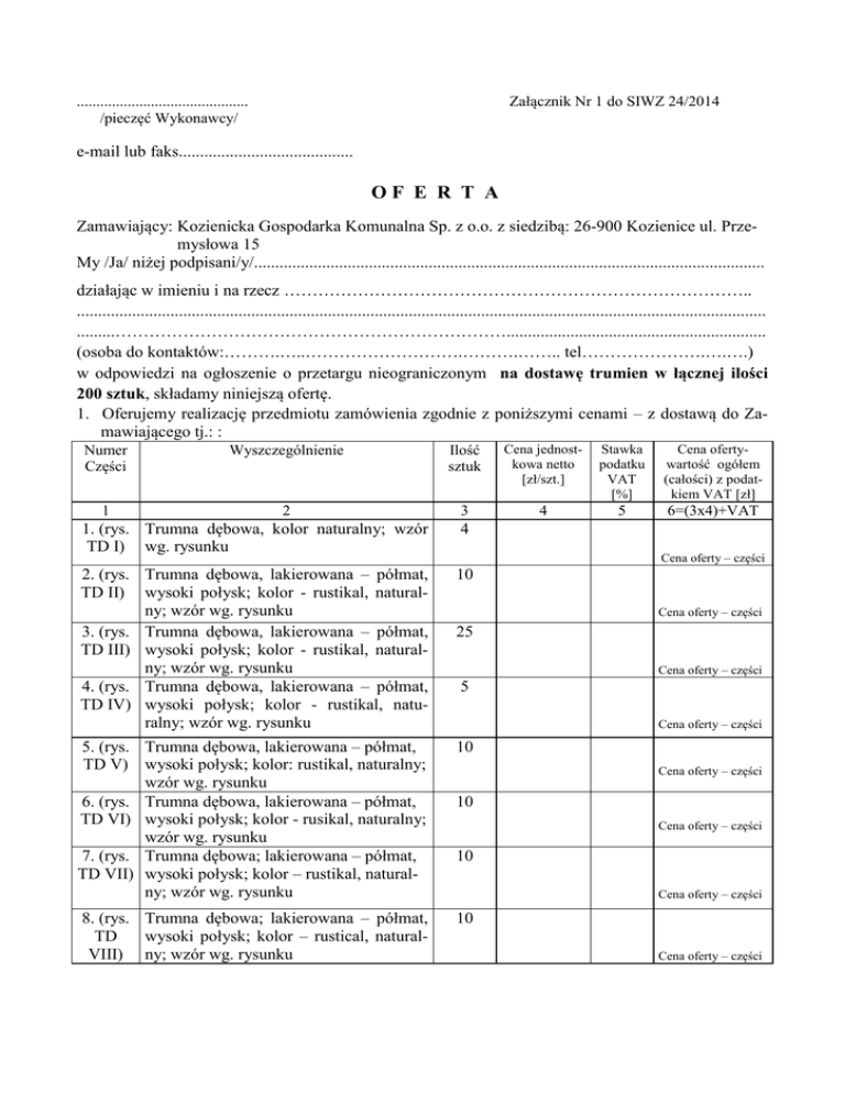 ............................................ /pieczęć Wykonawcy/ Załącznik Nr 1 do SIWZ 24/2014 e-mail lub faks......................................... OF E R T A Zamawiający: Kozienicka Gospodarka Komunalna Sp. z o.o. z siedzibą: 26-900 Kozienice ul. Przemysłowa 15 My /Ja/ niżej podpisani/y/........................................................................................................................ działając w imieniu i na rzecz ……………………………………………………………………….. .................................................................................................................................................................. .........……………………………………………………………............................................................. (osoba do kontaktów:……….…..……………………….……….…….. tel………………….….….) w odpowiedzi na ogłoszenie o przetargu nieograniczonym na dostawę trumien w łącznej ilości 200 sztuk, składamy niniejszą ofertę. 1. Oferujemy realizację przedmiotu zamówienia zgodnie z poniższymi cenami – z dostawą do Zamawiającego tj.: : Numer Części Wyszczególnienie 1 2 Ilość sztuk Cena jednostkowa netto [zł/szt.] Stawka podatku VAT [%] Cena ofertywartość ogółem (całości) z podatkiem VAT [zł] 3 4 5 6=(3x4)+VAT 1. (rys. Trumna dębowa, kolor naturalny; wzór TD I) wg. rysunku 4 2. (rys. Trumna dębowa, lakierowana – półmat, TD II) wysoki połysk; kolor - rustikal, naturalny; wzór wg. rysunku 3. (rys. Trumna dębowa, lakierowana – półmat, TD III) wysoki połysk; kolor - rustikal, naturalny; wzór wg. rysunku 4. (rys. Trumna dębowa, lakierowana – półmat, TD IV) wysoki połysk; kolor - rustikal, naturalny; wzór wg. rysunku 10 5. (rys. Trumna dębowa, lakierowana – półmat, TD V) wysoki połysk; kolor: rustikal, naturalny; wzór wg. rysunku 6. (rys. Trumna dębowa, lakierowana – półmat, TD VI) wysoki połysk; kolor - rusikal, naturalny; wzór wg. rysunku 7. (rys. Trumna dębowa; lakierowana – półmat, TD VII) wysoki połysk; kolor – rustikal, naturalny; wzór wg. rysunku 10 8. (rys. Trumna dębowa; lakierowana – półmat, TD wysoki połysk; kolor – rustical, naturalVIII) ny; wzór wg. rysunku 10 Cena oferty – części Cena oferty – części 25 Cena oferty – części 5 Cena oferty – części Cena oferty – części 10 Cena oferty – części 10 Cena oferty – części Cena oferty – części 2 9. (rys. TD IX) 10. (rys. TD X) 11. (rys. TD XI) 12. (rys. TDz) 13. (rys. TE) 14. (rys. TK) 15. (rys. TS I) 16. (rys. TS II) 17. (rys. TS III) 18. (rys. TJ I) 19. (rys. TO I) Trumna dębowa; lakierowana – półmat, wysoki połysk; kolor: rustical, naturalny; wzór wg. rysunku Trumna dębowa; lakierowana – półmat, wysoki połysk; kolor: rustical, naturalny 15 Trumna dębowa; lakierowana – półmat, wysoki połysk; kolor: rustical, naturalny 10 Cena oferty – części 20 Cena oferty – części Cena oferty – części Trumna dziecinna, biała - 60, 70, 80 cm 3 Trumna ekshumacyjna – nie lakierowana. 5 Cena oferty – części Cena oferty – części Trumna kremacyjna 3 Trumna sosnowa; lakierowana – półmat, wysoki połysk; kolor: rustical, naturalny 15 Cena oferty – części Cena oferty – części Trumna sosnowa; lakierowana – półmat, wysoki połysk; kolor: rustical, naturalny 15 Trumna sosnowa; lakierowana – półmat, wysoki połysk; kolor: rustical, naturalny 5 Cena oferty – części Cena oferty – części Trumna jesionowa; lakierowana – półmat, wysoki połysk; kolor: rustical, naturalny Trumna z drzewa sosnowego, okleina dąb 10 Cena oferty – części 15 Cena oferty – części CZĘŚĆ 1 Cena oferty (wartość ogółem z podatkiem VAT) słownie: ……………………….…………………………... ………………………………………………………………………………………………..………………… CZĘŚĆ 2 Cena oferty (wartość ogółem z podatkiem VAT) słownie: ……………………….…………………………... ………………………………………………………………………………………………..………………… CZĘŚĆ 3 Cena oferty (wartość ogółem z podatkiem VAT) słownie: ……………………….…………………………... ………………………………………………………………………………………………..………………… CZĘŚĆ 4 Cena oferty (wartość ogółem z podatkiem VAT) słownie: ……………………….…………………………... ………………………………………………………………………………………………..………………… CZĘŚĆ 5 Cena oferty (wartość ogółem z podatkiem VAT) słownie: ……………………….…………………………... 2 3 ………………………………………………………………………………………………..………………… CZĘŚĆ 6 Cena oferty (wartość ogółem z podatkiem VAT) słownie: ……………………….…………………………... ………………………………………………………………………………………………..………………… CZĘŚĆ 7 Cena oferty (wartość ogółem z podatkiem VAT) słownie: ……………………….…………………………... ………………………………………………………………………………………………..………………… CZĘŚĆ 8 Cena oferty (wartość ogółem z podatkiem VAT) słownie: ……………………….…………………………... ………………………………………………………………………………………………..………………… CZĘŚĆ 9 Cena oferty (wartość ogółem z podatkiem VAT) słownie: ……………………….…