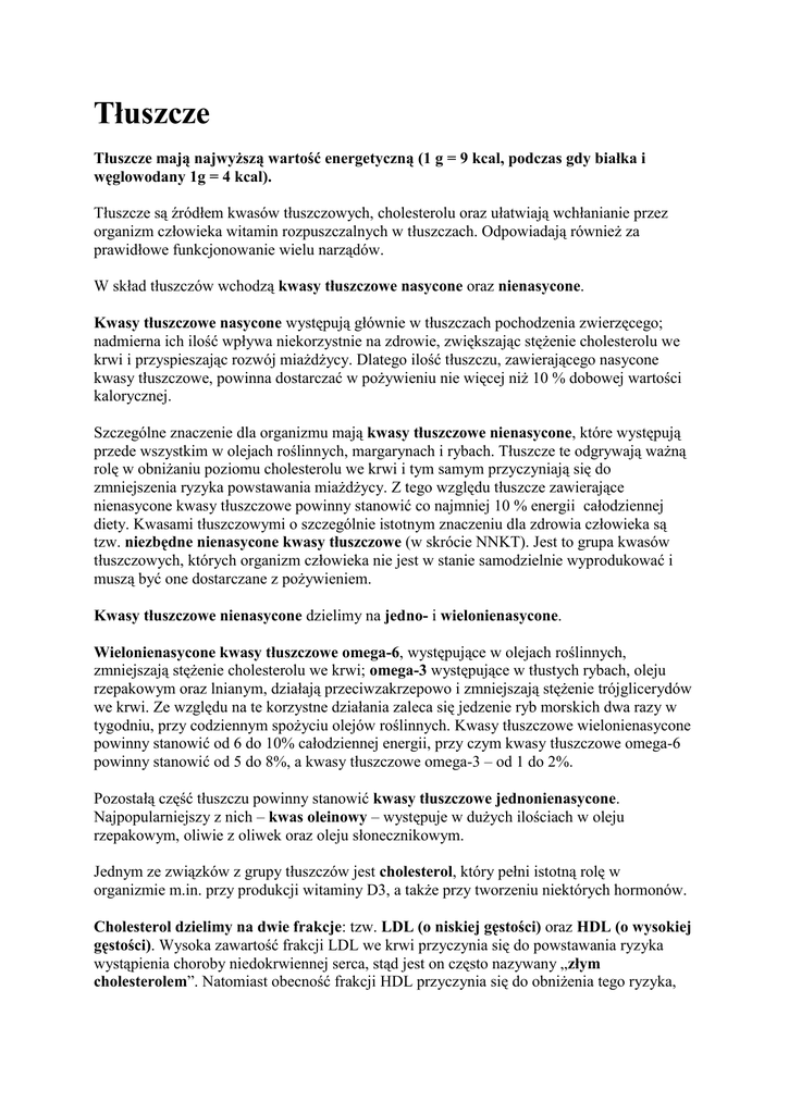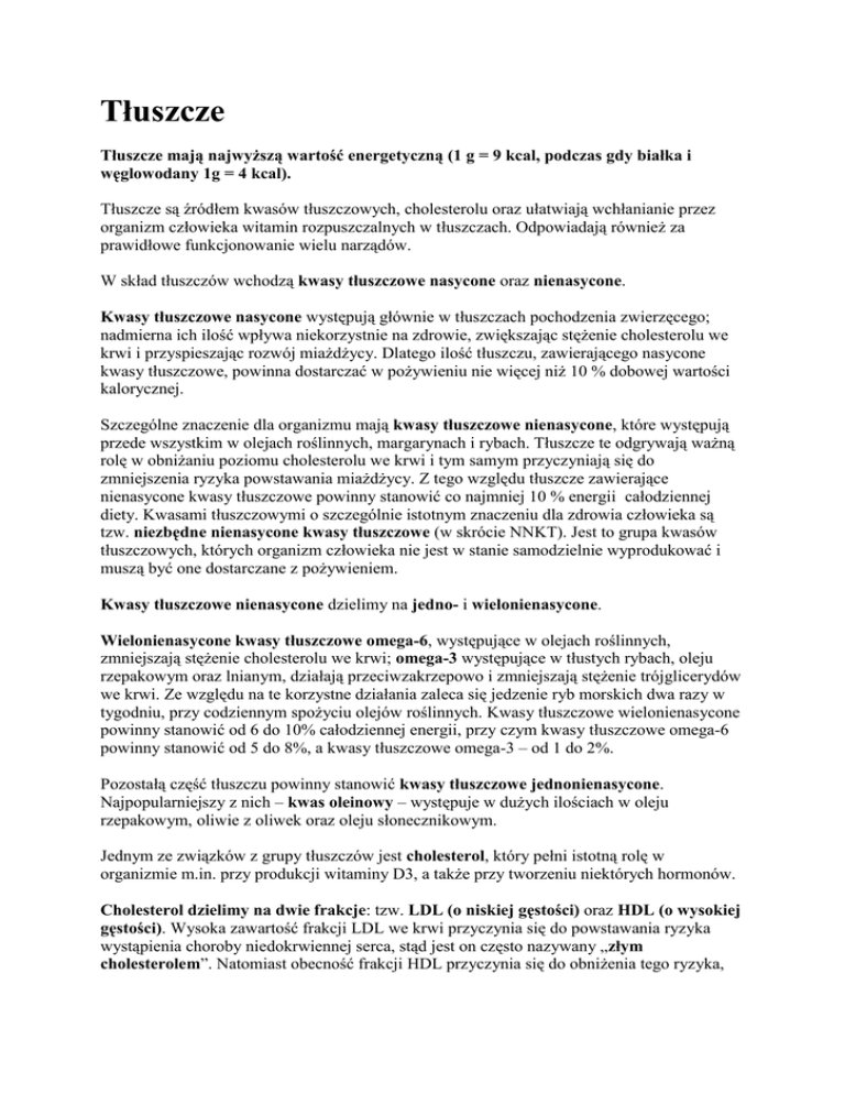 Tłuszcze Tłuszcze mają najwyższą wartość energetyczną (1 g = 9 kcal, podczas gdy białka i węglowodany 1g = 4 kcal). Tłuszcze są źródłem kwasów tłuszczowych, cholesterolu oraz ułatwiają wchłanianie przez organizm człowieka witamin rozpuszczalnych w tłuszczach. Odpowiadają również za prawidłowe funkcjonowanie wielu narządów. W skład tłuszczów wchodzą kwasy tłuszczowe nasycone oraz nienasycone. Kwasy tłuszczowe nasycone występują głównie w tłuszczach pochodzenia zwierzęcego; nadmierna ich ilość wpływa niekorzystnie na zdrowie, zwiększając stężenie cholesterolu we krwi i przyspieszając rozwój miażdżycy. Dlatego ilość tłuszczu, zawierającego nasycone kwasy tłuszczowe, powinna dostarczać w pożywieniu nie więcej niż 10 % dobowej wartości kalorycznej. Szczególne znaczenie dla organizmu mają kwasy tłuszczowe nienasycone, które występują przede wszystkim w olejach roślinnych, margarynach i rybach. Tłuszcze te odgrywają ważną rolę w obniżaniu poziomu cholesterolu we krwi i tym samym przyczyniają się do zmniejszenia ryzyka powstawania miażdżycy. Z tego względu tłuszcze zawierające nienasycone kwasy tłuszczowe powinny stanowić co najmniej 10 % energii całodziennej diety. Kwasami tłuszczowymi o szczególnie istotnym znaczeniu dla zdrowia człowieka są tzw. niezbędne nienasycone kwasy tłuszczowe (w skrócie NNKT). Jest to grupa kwasów tłuszczowych, których organizm człowieka nie jest w stanie samodzielnie wyprodukować i muszą być one dostarczane z pożywieniem. Kwasy tłuszczowe nienasycone dzielimy na jedno- i wielonienasycone. Wielonienasycone kwasy tłuszczowe omega-6, występujące w olejach roślinnych, zmniejszają stężenie cholesterolu we krwi; omega-3 występujące w tłustych rybach, oleju rzepakowym oraz lnianym, działają przeciwzakrzepowo i zmniejszają stężenie trójglicerydów we krwi. Ze względu na te korzystne działania zaleca się jedzenie ryb morskich dwa razy w tygodniu, przy codziennym spożyciu olejów roślinnych. Kwasy tłuszczowe wielonienasycone powinny stanowić od 6 do 10% całodziennej energii, przy czym kwasy tłuszczowe omega-6 powinny stanowić od 5 do 8%, a kwasy tłuszczowe omega-3 – od 1 do 2%. Pozostałą część tłuszczu powinny stanowić kwasy tłuszczowe jednonienasycone. Najpopularniejszy z nich – kwas oleinowy – występuje w dużych ilościach w oleju rzepakowym, oliwie z oliwek oraz oleju słonecznikowym. Jednym ze związków z grupy tłuszczów jest cholesterol, który pełni istotną rolę w organizmie m.in. przy produkcji witaminy D3, a także przy tworzeniu niektórych hormonów. Cholesterol dzielimy na dwie frakcje: tzw. LDL (o niskiej gęstości) oraz HDL (o wysokiej gęstości). Wysoka zawartość frakcji LDL we krwi przyczynia się do powstawania ryzyka wystąpienia choroby niedokrwiennej serca, stąd jest on często nazywany „złym cholesterolem”. Natomiast obecność frakcji HDL przyczynia się do obniżenia tego ryzyka, stąd powszechna nazwa „dobry cholesterol”. Dzienne spożycie cholesterolu nie powinno przekraczać 300 mg. Cholesterol znajduje się w produktach pochodzenia zwierzęcego; więcej cholesterolu występuje w produktach o wyższej zawartości tłuszczu. Organizm człowieka ma również zdolność wytwarzania tego składnika. W produktach roślinnych występują związki o podobnej budowie do cholesterolu, które nazywane są fitosterolami. Obecność fitosteroli w diecie przyczynia się do obniżenia wchłaniania cholesterolu, a w konsekwencji do obniżenia stężenia cholesterolu ogółem oraz frakcji LDL we krwi. Fitosterole naturalnie występują w olejach roślinnych, margarynach miękkich, roślinach strączkowych oraz nasionach.