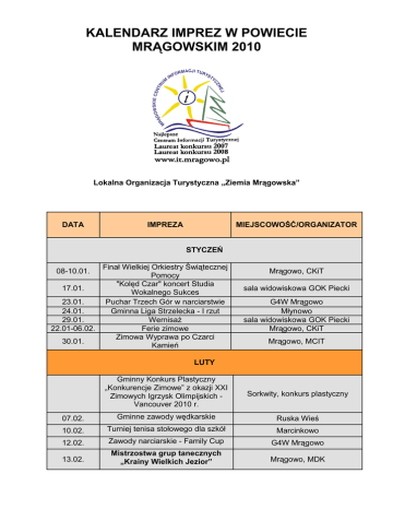 KALENDARZ IMPREZ W POWIECIE MRĄGOWSKIM 2010 Lokalna Organizacja Turystyczna „Ziemia Mrągowska” DATA IMPREZA MIEJSCOWOŚĆ/ORGANIZATOR STYCZEŃ Finał Wielkiej Orkiestry Świątecznej Pomocy "Kolęd Czar" koncert Studia 17.01. Wokalnego Sukces 23.01. Puchar Trzech Gór w narciarstwie 24.01. Gminna Liga Strzelecka - I rzut 29.01. Wernisaż 22.01-06.02. Ferie zimowe Zimowa Wyprawa po Czarci 30.01. Kamień 08-10.01. Mrągowo, CKiT sala widowiskowa GOK Piecki G4W Mrągowo Młynowo sala widowiskowa GOK Piecki Mrągowo, CKiT Mrągowo, MCIT LUTY Gminny Konkurs Plastyczny „Konkurencje Zimowe” z okazji XXI Zimowych Igrzysk Olimpijskich Vancouver 2010 r. Sorkwity, konkurs plastyczny 07.02. Gminne zawody wędkarskie Ruska Wieś 10.02. Turniej tenisa stołowego dla szkół Marcinkowo 12.02. Zawody narciarskie - Family Cup G4W Mrągowo 13.02. Mistrzostwa grup tanecznych „Krainy Wielkich Jezior” Mrągowo, MDK 13.02. VI Gminny Turniej Halowej Piłki Nożnej - juniorów 13.02. Walentynki 14.02 Walentynki Sorkwity - sala sportowa, Urząd Gminy Miasteczko Westernowe Mrongoville Mrągowo, CKiT 18.02. VII Gminny turniej warcabowy dla szkół Szestno 20.02. 20.02. 26.02. 27.02. 28.02. Puchar Wójta w narciarstwie Dzień Otwarty Domu Kultury prezentacja działalności z udziałem Instruktorów prowadzących zajęcia Wernisaż Puchar G4W w narciarstwie Światowy Dzień Przewodnictwa Turystycznego G4W Mrągowo sala wystawowa/taneczna GOK Piecki sala widowiskowa GOK Piecki G4W Mrągowo Mrągowo, MCIT MARZEC 06.03. Wielki Konkurs na Palmy i Pisanki Wielkanocne „Życie i Twórczość Fryderyka Chopina” w 200 Rocznicę Urodzin Najwybitniejszego Polskiego Kompozytora Spotkania z Poezją Koncert inauguracyjny rok Chopinowski „Na Kaziuka...” 06.03. Dzień kobiet - Chippendales show 08.03. Dzień Kobiet Mistrzostwa Pracowników Samorządowych w Halowej Piłce Nożnej IV Halowe Igrzyska wsi VI Gminny Turniej Halowej Piłki Nożnej - seniorów Spotkanie autorskie dla dzieci „Nuta Chopina” z Izabelą Klebańską Pierwszy Dzień Wiosny - Dzień Wagarowicza 01.03. 12-14.03. 14.03. 14.03. 18.03. 19.03. 19.03. Powitanie Wiosny 20.03. 17.03. Koncert wiosenny Liga strzelecka szkół Mrągowska Scena Teatralna operetka „Księżniczka Czardasza” Konkurs recytatorski „II Noc z Andersenem” Wernisaż 21.03. 26.03. 26.03. 26.03. Sorkwity Sorkwity, konkurs Sorkwity Mrągowo, CKiT Mrągowo, CKiT Miasteczko Westernowe Mrongoville teren gminy Sorkwity Mrągowo, CKiT Marcinkowo Sorkwity - sala sportowa, Urząd Gminy Biblioteka Miejska w Mrągowie Sorkwity Miasteczko Westernowe Mrongoville Mrągowo, CKiT Młynowo Mrągowo, CKiT sala taneczna GOK Piecki Sorkwity sala wystawowa GOK Piecki 27.03. „Być dla innych” Mrągowo, MDK KWIECIEŃ Przegląd Powiatowy Ogólnopolskiego Konkursu Recytatorskiego Mrągowo, CKiT Przegląd Rejonowy Konkursu „Spotkania z poezją” Mrągowo, CKiT Akcja Wiosna teren gminy Sorkwity IV Światowe Dni Bajki teren gminy Sorkwity 02.04. Wystawa 5. rocznica śmierci Jana Pawła II Biblioteka Miejska w Mrągowie 02.04. Książka dla Dzieci Biblioteki Gminy Sorkwity 17.04. XXXI Wojewódzki Rajd Pieszy Młynowo 17.04. Wybory Miss Polonia Ziemi Mrągowskiej oraz Najładniejszej Nastolatki Ziemi Mrągowskiej Mrągowo, CKiT 18.04. Konkurs Piosenki Zagranicznej sala widowiskowa GOK Piecki 22.04. Dzień Ziemi Mrągowo, CKiT 22.04. Dzień Ziemi teren gminy Sorkwity 23.04. Wystawa Światowy Dzień Książki Biblioteka Miejska w Mrągowie 23-25.04. Prezentacje tańca współczesnego „Młode Formy 1” Mrągowo, CKiT 30.04. Wernisaż sala wystawowa GOK Piecki 30.04.-03.05. Muzyczna Majówka z Wioską Żeglarską Wioska Żeglarska w Mikołajkach MAJ Majówka Rodzinna - Dni Rodziny teren gminy Sorkwity Tydzień Bibliotek Weekend w siodle Biblioteki Gminy Sorkwity Miasteczko Westernowe Mrongoville 01.05. VII Rok w Unii Europejskiej przedstawienie teatralne sala widowiskowa GOK Piecki 01.05. Majówka w Siodle, Zawody Jeździeckie CK „Kłobuk” w Mikołajkach 01.05. III Turniej Piłki Nożnej o Puchar Wójta Gminy Sorkwity Sorkwity 01.05. Zabawa Taneczna teren gminy Sorkwity 01-02.05. Inauguracja Żeglarskiego Grand Prix Mikołajek Wioska Żeglarska w Mikołajkach 02.05. IV Gminny Majowy Rajd Pieszy Sorkwity 01-3.05. „Majówka" z CKiT. Obchody Rocznicy Uchwalenia Konstytucji 3 Maja Mrągowo, CKiT 01.05. „Podchody w Mrągowie” Mrągowo, MCIT 03.05. 3 Maja Zawody Strzeleckie Sorkwity 09.05. Turniej piłki nożnej OSP Wierzbowo 18.05. Wystawa 100. rocznica śmierci Elizy Orzeszkowej Biblioteka Miejska w Mrągowie 21.05. Międzyszkolny Konkurs Plastyczny Mrągowo, MDK 26.05. 28.05. Dzień Matki teren gminy Sorkwity sala wystawowa GOK Piecki 29.05. 29.05. 30.05. 31.05. Wernisaż Piknik Rodzinny z okazji Dnia Dziecka Najciekawsza przebrana postać bajkowa (dzieci z przedszkoli mrągowskich) Majowy Rajd Rowerowy Mrągowo, CKiT Biblioteka Miejska w Mrągowie Mrągowo, MCIT Dzień Dziecka/Prezentacje sala widowiskowa GOK Piecki „Cała Polska czyta Dzieciom” IX Ogólnopolska Akcja Biblioteki Gminy Sorkwity CZERWIEC 01.06. 01.06. Festyn Unijny Spartakiada Dzieci i Młodzieży Niepełnosprawnych Dzień Dziecka Dzień Dziecka 01.06. Dzień Dziecka 03-06.06. 04-06.06. 06.06. 05.06. 06.06. 12.06. 12.06. 13.06. 13.06. 20.06. 25-27.06. 26.06. 26.06. Rajdowa Czerwcówka z Wioską Żeglarską Rajd Polski „Cała Polska czyta Dzieciom” IX Ogólnopolska Akcja Piknik dziecięcy Gminne zawody w strzelaniu z KBKS dla OSP Muntowiada Wybory Miss Polonia Warmii i Mazur II Letnie Igrzyska Wsi Siatkówka Plażowa Turniej piłki nożnej Dni Mikołajek Akcje-Wakacje IV Turniej Sołectw teren gminy Sorkwity Mrągowo, CKiT Krzywe teren gminy Sorkwity Miasteczko Westernowe Mrongoville Wioska Żeglarska w Mikołajkach Mikołajki Biblioteki Gminy Sorkwity Nikutowo Marcinkowo Muntowo Mrągowo, CKiT G4W Mrągowo Sorkwity Grabowo CK „Kłobuk” w Mikołajkach Mrągowo, CKiT Szymanowo 26.06. III Mazurski Festiwal Ry
