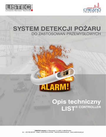 SYSTEM DETEKCJI POŻARU DO ZASTOSOWAŃ PRZEMYSŁOWYCH Opis techniczny ® CONTROLLER LIST CREATIO Industry ul. Różyckiego 1c p.229, 51-608 Wrocław tel.: +48 728 333 612 skype: creatio-biuro-wroclaw [email protected] www.creatioindustry.pl Kontroler LIST ® CONTROLLER LIST® CONTROLLER wyposażony w nowy procesor ARM9 oraz dwa procesory pomocnicze stanowi nową generację urządzeń kontrolno-pomiarowych dla systemów LIST®. Trzyprocesorowy system pozwala na szybkie i dokładne rozpoznawanie, wykrywanie i sygnalizację pożarów. Do kontrolera można podłączyć jedną lub dwie linie pomiarowe – kable sensoryczne łącznie z występującymi na nich rozgałęzieniami i kablami połączeniowymi. Dokładne wartości zmierzonej temperatury, duża czułość pomiaru oraz wyjątkowa jego powtarzalność gwarantowane są przez adresowane i cykliczne odpytywane czujniki znajdujące się w kablu sensorycznym. Sygnalizacja i rozpoznanie pożaru W przypadku wzrostu temperatury (w zaprogramowanym przedziale) sygnalizowane jest rozpoznanie pożaru. Alarm zostaje ogłoszony gdy przekroczone zostaną: progowa wartość różnicowa lub górny próg alarmowy. Oba progi alarmowe są programowane niezależnie dla maksymalnie 254 sekcji alarmowych. System LIST® jest bardzo czuły ponieważ temperatura jest mierzona z rozdzielczością 0,1°C. Sprawdzone algorytmy wykorzystane w oprogramowaniu gwarantują redukcję wpływu temperatur otoczenia na wyniki pomiaru, zapobiegając tym samym powstawaniu fałszywych alarmów. Unikalna technologia pomiarowa LIST® zapewnia niezwykle stabilne wyniki pomiarów uzyskiwane z powtarzalną dokładnością ±1° dla każdego z czujników. Alarm jest sygnalizowany na panelu czołowym urządzenia przy pomocy diod LED oraz tekstowego wyświetlacza ciekłokrystalicznego (LCD). Alarmy sygnalizowane są dodatkowo przez podświetlenie wyświetlacza LCD na czerwono, zaś błędy i pre-alarmy – kolorem pomarańczowym. Sygnalizacja alarmów do urządzeń/systemów nadrzędnych odbywa się z wykorzystaniem przekaźników bezpotencjałowych oraz/lub poprzez interfejs wykorzystujący przemysłowe protokoły komunikacyjne. Kontroler może być zresetowany z panelu czołowego lub też zewnętrznym sygnałem elektrycznym z głównej centralce p.poż poprzez interfejs komunikacyjny. CREATIO Industry 60V091-04/ 05.10.2011 mod ul. Różyckiego 1c p.229, 51-608 Wrocław tel.: +48 728 333 612 skype: creatio-biuro-wroclaw e-mail: [email protected] Zalety urządzenia Rozpoznanie pożaru Protokoły danych • Bardzo szybka analiza danych temperaturowych z wykorzystaniem 3 procesorów • Szerokie możliwości komunikacji przy użyciu różnych interfejsów • Złącze USB dla wygodnej transmisji danych i serwisowania • Czytelny wyświetlacz tekstowy z różnokolorowym podświetleniem • Niski pobór mocy • Modułowa budowa ułatwiająca dozór pracy i ewentualne naprawy • Zgodność z dyrektywą RoHS • Długowieczność wszystkich elementów • Interfejs sieciowy LAN 100Mb/s umożliwiający szybką transmisję danych • Wbudowane mechanizny zapewniające redundancję systemu: Loop-back i RDT Rozpoznanie pożaru jest sygnalizowane gdy przyrastająca temperatura przekroczyła uprzednio zdefiniowane progi alarmowe. Przemysłowe protokoły komunikacyjne umożliwiają połączenie systemu z innymi systemami sterowania: • MODBUS/JBUS • MODBUS TCP • IEC 60870-5-104 • 3964R • do FCP: UGM 2005/2020 EDP Esser Wyświetlacz Zbiorczy wyświetlacz LED sygnalizujący: • Alarm pożarowy w linii pomiarowej A (kablu sensorycznym A) • Alarm pożarowy w linii pomiarowej B (kablu sensorycznym B) • Komunikat błędu w linii A • Komunikat błędu w linii B • Działanie • Pomiar temperatury • Transmisję danych Czytelny wyświetlacz tekstowy Wyświetlacz LCD posiada 3 wiersze po 16 znaków każdy oraz podświetlenie tła w 3 kolorach RGB. Wyświetlacz służy do sygnalizacji komunikatów i danych w różnych językach. Zielone podświetlenie sygnalizujące normalną pracę systemu (niebieskie w systemie z redundancją) zmienia się na czerwone w razie wystąpienia alarmu. Kryteria alarmu Alarmy zostają ogłoszone gdy zostaną przekroczone górny lub różnicowy próg alarmowy. Możliwa jest również sygnalizacja alarmu oblodzenia, gdy temperatura opadnie poniżej dolnego progu alarmowego. Każda sekcja alarmowa posiada własne, indywidualnie zaprogramowane, progi alarmowe. Rozpoznanie usterki Wystąpienie usterki w kablu sensorycznym, np. uszkodzenie punktu pomiarowego, jest rozpoznawane w ciągu 10 s od wystąpienia (wykrywanie pożaru). Wszystkie usterki, włącznie z usterkami samego kontrolera, są zapisywane w wewnętrznym rejestrze komunikatów. Bezpieczeństwo danych Aby dokonać zmian w konfiguracji urządzenia wymagana jest znajomość hasła. Różne grupy użytkowników (np. inspekcja, serwis lub naprawa) mają różny stopień dostępu do ustawień systemu. Programowanie (inspekcja, serwisowanie) Wszystkie parametry, informacje, rejestry oraz dane temperaturowe są dostępne z poziomu przeglądarki internetowej. Parametry są modyfikowalne, dostęp do nich zabezpieczony jest zestawem haseł. Interfejsy COM1: interfejs master/slave dla sieciowych systemów LIST® COM2: interfejs RS232 służący do połączenia z urządzeniami nadrzędnymi, wykorzystujący protokoły (szybkość połączenia do 115200 kb/s). COM3: interfejs RS232 służący do programowania systemu z poziomu pakietu LISTterm (do 115200 kb/s). Ethernet: interfejs służący do szybkiej transmisji danych w sieciach lokalnych (10/100 Mb/s, TCP/IP) Przyciski nawigacyjne 5 przycisków służy do nawigacji w menu urządzenia oraz do wyświetlania komunikatów, parametrów, itp. Sygnał dźwiękowy Kontroler emituje sygnał dźwiękowy w razie wystąpienia niepotwierdzonych alarmów pożarowych lub komunikatów błędu. Funkcja ta może zostać zablokowana przez operatora. Sekcje alarmowe Dołączone opr