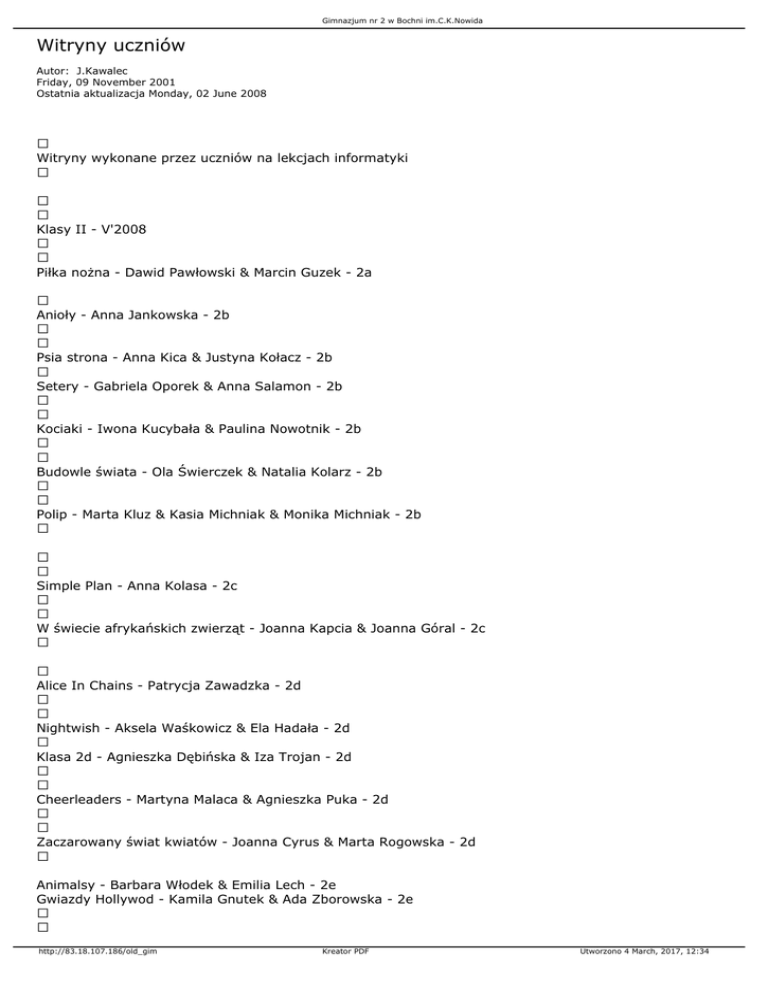 Gimnazjum nr 2 w Bochni im.C.K.Nowida Witryny uczniów Autor: J.Kawalec Friday, 09 November 2001 Ostatnia aktualizacja Monday, 02 June 2008 Witryny wykonane przez uczniów na lekcjach informatyki Klasy II - V'2008 Piłka nożna - Dawid Pawłowski & Marcin Guzek - 2a Anioły - Anna Jankowska - 2b Psia strona - Anna Kica & Justyna Kołacz - 2b Setery - Gabriela Oporek & Anna Salamon - 2b Kociaki - Iwona Kucybała & Paulina Nowotnik - 2b Budowle świata - Ola Świerczek & Natalia Kolarz - 2b Polip - Marta Kluz & Kasia Michniak & Monika Michniak - 2b Simple Plan - Anna Kolasa - 2c W świecie afrykańskich zwierząt - Joanna Kapcia & Joanna Góral - 2c Alice In Chains - Patrycja Zawadzka - 2d Nightwish - Aksela Waśkowicz & Ela Hadała - 2d Klasa 2d - Agnieszka Dębińska & Iza Trojan - 2d Cheerleaders - Martyna Malaca & Agnieszka Puka - 2d Zaczarowany świat kwiatów - Joanna Cyrus & Marta Rogowska - 2d Animalsy - Barbara Włodek & Emilia Lech - 2e Gwiazdy Hollywod - Kamila Gnutek & Ada Zborowska - 2e http://83.18.107.186/old_gim Kreator PDF Utworzono 4 March, 2017, 12:34 Gimnazjum nr 2 w Bochni im.C.K.Nowida Klasy II - V'2007 Prison Break - Damian Wolak & Patryk Nawrocki Ogame - Jakub Jachym Need for Speed - Jakub Słoka & Łukasz Osika Let's dance - Iza Pierz & Zuza Romanek & Ola Pletty Manchester United - Konrad Mosoń & Michał Łapczyński Indie - Karolina Grabias Motyle - Paulina Panna 4 łapy - Karolina Kruk Turbacz - Patrycja Pawłowska & Kinga Struzik Wisła Kraków - Karolina Kruk & Natalia Kolarz Klasy II - V'2006 Polityka - Kacper Kosiarski & Tytus Turczyński Geografia Polski - Kasia Nowotnik & Natalia Wełna Rajdowiec - Maciek Rachalski Reprezentacja Polski - Maciek Litwinowicz & Matcin Zamęta Pory roku - Agnieszka Szymczyk & Dominika Romanek Piłka ręczna - Daniel Satoła Chmury - Wojtek Piś & Mateusz Koczwara FC Barcelona - Kamil Idziak & Kuba Kołodziej Dyscypliny sportowe - Adrian Dziura & Patryk Łachut Klasy II - V'2005 Taniec - Justyna Urban & Judyta Borowiec 2g Judo - Paweł Gonciarz 2g http://83.18.107.186/old_gim Kreator PDF Utworzono 4 March, 2017, 12:34 Gimnazjum nr 2 w Bochni im.C.K.Nowida Klasy III - X'2004 Nightwish - Krystyna Włosińska 3c Stephen King - Olga Sewiłło & Anna Gawęda 3g Lwy i tygrysy - Agnieszka Ziomek, Kasia Chuda 3b Klasy II - IV'2003 Crimson Castle - D.Barnaś - 2c Ochronka - A.Kądziela, M.Kochańska - 2a Zjawiska niewyjaśnione - D.Krupa, Ł.Korta 2e Klasy II - IV'2002 Rajdy - Jerzy Bursztyn 2 A Allen Iverson - Mateusz Krzywda 2A Fascynujące motyle - Alicja Stabrawa 2 A http://83.18.107.186/old_gim Kreator PDF Utworzono 4 March, 2017, 12:34 Gimnazjum nr 2 w Bochni im.C.K.Nowida Chór - Magdalena Ziółkowska, Urszula Golińska 2A Samochody świata - Artur Kochański,, Michał Zając 2A Papużki faliste - A.Włosińska, A.Radecka Klasy III - XI'2001 Akwarystyka - Marcin Ilcewicz kl. 3F Mateusz Gurgul kl. 3A - Świry Impresjonizm - Zuzanna Drożdżak kl. 3E Karolina Gawłowicz kl. 3E - Motyle Porsche - Mariusz Granda kl. 3G Katarzyna Gawłowicz kl. 3E - Pająki Ryby akwariowe - Anna Pietraszko i Magda Litwinowicz kl. 3C Samochody rajdowe - Michał Murzyn, Karol Tworzydło kl. 3A Siatkówka - Grzegorz Grabarz, Kondrat Dudek kl. 3D Reprezentacja Polski - Dariusz Gałązka kl. 3G http://83.18.107.186/old_gim Kreator PDF Utworzono 4 March, 2017, 12:34