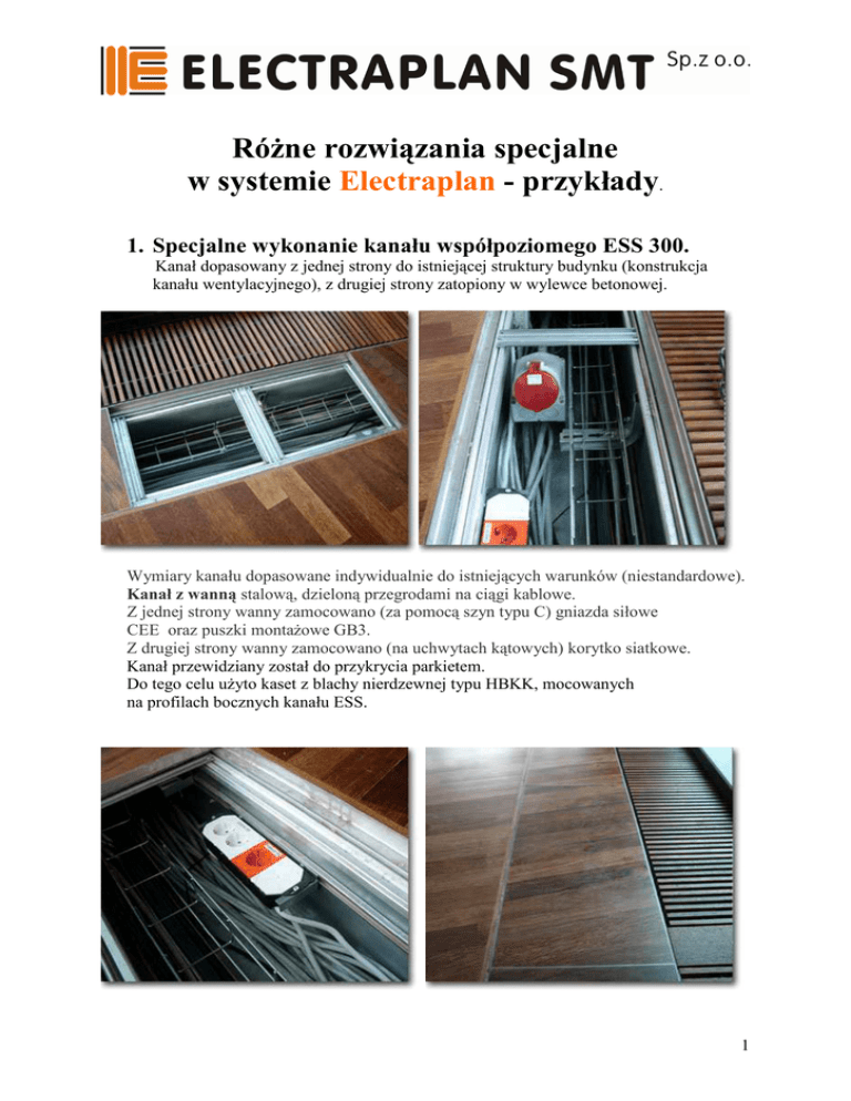 RóŜne rozwiązania specjalne w systemie Electraplan - przykłady. 1. Specjalne wykonanie kanału współpoziomego ESS 300. Kanał dopasowany z jednej strony do istniejącej struktury budynku (konstrukcja kanału wentylacyjnego), z drugiej strony zatopiony w wylewce betonowej. Wymiary kanału dopasowane indywidualnie do istniejących warunków (niestandardowe). Kanał z wanną stalową, dzieloną przegrodami na ciągi kablowe. Z jednej strony wanny zamocowano (za pomocą szyn typu C) gniazda siłowe CEE oraz puszki montaŜowe GB3. Z drugiej strony wanny zamocowano (na uchwytach kątowych) korytko siatkowe. Kanał przewidziany został do przykrycia parkietem. Do tego celu uŜyto kaset z blachy nierdzewnej typu HBKK, mocowanych na profilach bocznych kanału ESS. 1 2. CięŜkie wykonanie kanału współpoziomego. Jest to przemysłowe wykonanie kanału współpoziomego, po którym mogą jeździć n.p. wózki widłowe lub inne pojazdy. ObciąŜalność kanału: 20.000 N. Pokrywa z blachy ryflowanej, zapobiegającej ślizganiu się. Jednostkowa długość pokrywy = 1 mb. Szerokość kanału w świetle = 300 mm. Kanał z wanną stalową o długości jednostkowej = 2 mb. Oparcie pokrywy w wannie wyklejone uszczelką (taśmą) gumową, aby wygłuszyć kanał w trakcie n.p. najazdu pojazdu. Z boku kanału kotwy stabilizujące, aby mocniej związać kanał z wylewką. Całość konstrukcji wykonana z blachy ocynkowanej ogniowo, zgodnie z normą EN ISO 1461. Chodzi o ochronę kanału przed korozją. 2 3.Kasety HBKK Q292 z ramką dociskająca z zewnątrz. Przewidziane do remontowanych pomieszczeń z grubymi wykładzinami twardymi (kamień, parkiet); do zamaskowania nierówności wycięcia w kamieniu lub parkiecie. Ramka z blachy nierdzewnej V2A o szer. 12 mm, grub. 2 mm, maskująca nierówności wycięcia kamienia. Wysokość ramy kasety HBKK zmniejszono o 2 mm (zamiast 29 mm jest 27 mm), aby przyspawać do niej blachę nierdzewną (ramkę dociskającą) o grub. 2 mm. 3 4. Wysoki, specjalny kanał napodłogowy. Kanał napodłogowy o niestandardowej wysokości, z pionowymi krawędziami 90˚. Wysokość wanny kanału = 95 mm, zaś całkowita wysokość kanału = 100 mm. Wykonany był dotychczas w 2 szerokościach: 250 i 350 mm. W kanale moŜliwe wycięcia pod pokrywy uchylne KD1 E2 (lub gniazda natynkowe, montowane na kanale). Kanał był lakierowany na RAL 7021 (moŜe być inny RAL). Poszerzenie kanału o ok. 50 mm, od strony ściany, umoŜliwia zamaskowanie rury wodnej lub rury co. 4 5. Pokrywa R3 (lub Q3) z gniazdem skośnym CEE 16A/400V. W środku pokrywy uchylnej KDR1 R3 (w miejsce środkowej puszki montaŜowej GB3) zamontowano specjalny blaszany uchwyt pod 1 gniazdo siłowe CEE 16A. JednakŜe odbywa się to kosztem zagłębienia pokrywy (kasety). Min. zagłębienie wynosi wtedy 170 mm. WaŜne jest przy tym zabezpieczenie przed poraŜeniem prądem (dotknięciem styków od spodu) specjalna puszką osłonową. Identyczne rozwiązanie moŜliwe jest w pokrywie uchylnej KDR1 Q3 albo w kasecie HBKK Q292 (lub innych kasetach z blachy nierdzewnej n.p. kasetach o zwiększonym obciąŜeniu). 5