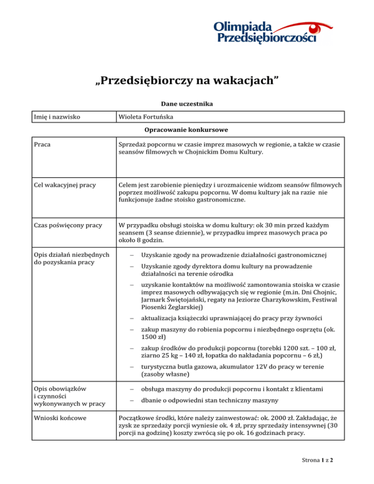 „Przedsiębiorczy na wakacjach” Dane uczestnika Imię i nazwisko Wioleta Fortuńska Opracowanie konkursowe Praca Sprzedaż popcornu w czasie imprez masowych w regionie, a także w czasie seansów filmowych w Chojnickim Domu Kultury. Cel wakacyjnej pracy Celem jest zarobienie pieniędzy i urozmaicenie widzom seansów filmowych poprzez możliwość zakupu popcornu. W domu kultury jak na razie nie funkcjonuje żadne stoisko gastronomiczne. Czas poświęcony pracy W przypadku obsługi stoiska w domu kultury: ok 30 min przed każdym seansem (3 seanse dziennie), w przypadku imprez masowych praca po około 8 godzin. Opis działań niezbędnych do pozyskania pracy Opis obowiązków i czynności wykonywanych w pracy Wnioski końcowe − Uzyskanie zgody na prowadzenie działalności gastronomicznej − Uzyskanie zgody dyrektora domu kultury na prowadzenie działalności na terenie ośrodka − uzyskanie kontaktów na możliwość zamontowania stoiska w czasie imprez masowych odbywających się w regionie (m.in. Dni Chojnic, Jarmark Świętojański, regaty na Jeziorze Charzykowskim, Festiwal Piosenki Żeglarskiej) − aktualizacja książeczki uprawniającej do pracy przy żywności − zakup maszyny do robienia popcornu i niezbędnego osprzętu (ok. 1500 zł) − zakup środków do produkcji popcornu (torebki 1200 szt. – 100 zł, ziarno 25 kg – 140 zł, łopatka do nakładania popcornu – 6 zł,) − turystyczna butla gazowa, akumulator 12V do pracy w terenie (zasoby własne) − obsługa maszyny do produkcji popcornu i kontakt z klientami − dbanie o odpowiedni stan techniczny maszyny Początkowe środki, które należy zainwestować: ok. 2000 zł. Zakładając, że zysk ze sprzedaży porcji wyniesie ok. 4 zł, przy sprzedaży intensywnej (30 porcji na godzinę) koszty zwrócą się po ok. 16 godzinach pracy. Strona 1 z 2 Strona 2 z 2