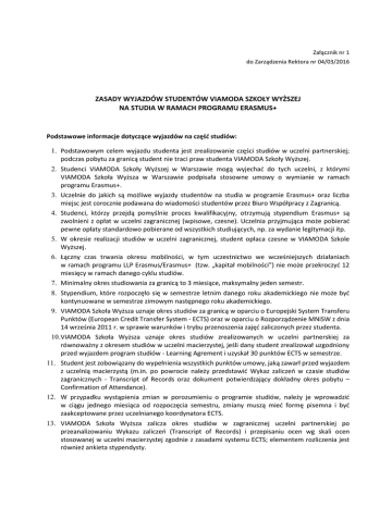 Załącznik nr 1 do Zarządzenia Rektora nr 04/03/2016 ZASADY WYJAZDÓW STUDENTÓW VIAMODA SZKOŁY WYŻSZEJ NA STUDIA W RAMACH PROGRAMU ERASMUS+ Podstawowe informacje dotyczące wyjazdów na część studiów: 1. Podstawowym celem wyjazdu studenta jest zrealizowanie części studiów w uczelni partnerskiej; podczas pobytu za granicą student nie traci praw studenta VIAMODA Szkoły Wyższej. 2. Studenci VIAMODA Szkoły Wyższej w Warszawie mogą wyjechać do tych uczelni, z którymi VIAMODA Szkoła Wyższa w Warszawie podpisała stosowne umowy o wymianie w ramach programu Erasmus+. 3. Uczelnie do jakich są możliwe wyjazdy studentów na studia w programie Erasmus+ oraz liczba miejsc jest corocznie podawana do wiadomości studentów przez Biuro Współpracy z Zagranicą. 4. Studenci, którzy przejdą pomyślnie proces kwalifikacyjny, otrzymują stypendium Erasmus+ są zwolnieni z opłat w uczelni zagranicznej (wpisowe, czesne). Uczelnia przyjmująca może pobierać pewne opłaty standardowo pobierane od wszystkich studiujących, np. za wydanie legitymacji itp. 5. W okresie realizacji studiów w uczelni zagranicznej, student opłaca czesne w VIAMODA Szkole Wyższej. 6. Łączny czas trwania okresu mobilności, w tym uczestnictwo we wcześniejszych działaniach w ramach programu LLP Erasmus/Erasmus+ (tzw. „kapitał mobilności”) nie może przekroczyć 12 miesięcy w ramach danego cyklu studiów. 7. Minimalny okres studiowania za granicą to 3 miesiące, maksymalny jeden semestr. 8. Stypendium, które rozpoczęło się w semestrze letnim danego roku akademickiego nie może być kontynuowane w semestrze zimowym następnego roku akademickiego. 9. VIAMODA Szkoła Wyższa uznaje okres studiów za granicą w oparciu o Europejski System Transferu Punktów (European Credit Transfer System - ECTS) oraz w oparciu o Rozporządzenie MNiSW z dnia 14 września 2011 r. w sprawie warunków i trybu przenoszenia zajęć zaliczonych przez studenta. 10. VIAMODA Szkoła Wyższa uznaje okres studiów zrealizowanych w uczelni partnerskiej za równoważny z okresem studiów w uczelni macierzystej, jeśli dany student zrealizował uzgodniony przed wyjazdem program studiów - Learning Agrement i uzyskał 30 punktów ECTS w semestrze. 11. Student jest zobowiązany do wypełnienia wszystkich punktów umowy, jaką zawarł przed wyjazdem z uczelnią macierzystą (m.in. po powrocie należy przedstawić Wykaz zaliczeń w czasie studiów zagranicznych - Transcript of Records oraz dokument potwierdzający dokładny okres pobytu – Confirmation of Attendance). 12. W przypadku wystąpienia zmian w porozumieniu o programie studiów, należy je wprowadzić w ciągu jednego miesiąca od rozpoczęcia semestru, zmiany muszą mieć formę pisemna i być zaakceptowane przez uczelnianego koordynatora ECTS. 13. VIAMODA Szkoła Wyższa zalicza okres studiów w zagranicznej uczelni partnerskiej po przeanalizowaniu Wykazu zaliczeń (Transcript of Records) i przepisaniu ocen wg skali ocen stosowanej w uczelni macierzystej zgodnie z zasadami systemu ECTS; elementem rozliczenia jest również ankieta stypendysty. 14. Student, który zadeklarował chęć odbycia studiów w uczelni partnerskiej w semestrze zimowym, powinien zamknąć sesję letnią przed wyjazdem i uzyskać wpis na kolejny rok (semestr) studiów; student który zadeklarował chęć odbycia studiów w uczelni partnerskiej w semestrze letnim powinien zamknąć sesję zimową przed wyjazdem i uzyskać wpis na kolejny (letni) semestr studiów. 15. Student jest zobowiązany do posiadania ubezpieczenia zdrowotnego, zapewnionego na podstawie Europejskiej Karty Ubezpieczenia Zdrowotnego. Wysokość stypendium 1. Stypendium Erasmus+, przyznawane studentowi wyjeżdżającemu na okres studiów do uczelni partnerskiej, jest z założenia dofinansowaniem kosztów związanych z podróżą i utrzymaniem za granicą. Kwota grantu nie jest wysoka i zależy od puli środków, jakie uczelnia otrzymała od Narodowej Agencji Programu na dany rok akademicki. Dokładne wysokości stawek stypendiów ustala Polska Narodowa Agencja Programu Erasmus. Stypendium jest zwolnione z podatku dochodowego od osób fizycznych. 2. Student posiadający prawo do otrzymywania „dodatku socjalnego” otrzymuje zarówno „wsparcie indywidualne" jak i „dodatek socjalny” z projektu „Zagraniczna mobilność studentów niepełnosprawnych oraz znajdujących się w trudnej sytuacji materialnej” finansowanego ze środków Programu Operacyjnego Wiedza Edukacja Rozwój (POWER). 3. Student niepełnosprawny otrzymuje zarówno „wsparcie indywidualne" jak i dodatkowe środki przyznane w związku z niepełnosprawnością z projektu „Zagraniczna mobilność studentów niepełnosprawnych oraz znajdujących się w trudnej sytuacji materialnej” finansowanego ze środków Programu Operacyjnego Wiedza Edukacja Rozwój (POWER). 4. Student podpisuje umowę z VIAMODA Szkołą Wyższą i otrzymuje przed wyjazdem stypendium w wysokości 90%. 5. Po złożeniu przez studenta raportu z wyjazdu (ankiety stypendysty) w systemie on-line (on-line EU survey), dostarczeniu wykazu zaliczeń (Transcript of Records) oraz dokumentu potwierdzającego dokładny okres pobytu (Confirmation of Attendance) ustalana i wypłacana jest ostateczna wysokość stypendium (z dokładnością do jednego dnia pobytu na stypendium). Warunki uczestnictwa w wymianie studentów Do wyjazdów do uczelni partnerskiej w ramach programu Erasmus+ uprawnieni są tylko i wyłącznie studenci VIAMODA Szkoły Wyższej (stacjonarni i niestacjonarni), którzy spełniają następujące warunki: 1) w momencie wyjazdu są studentami co najmniej drugiego roku studiów; 2) nie mogą przebywać (w trakcie stypendium) na urlopie dziekańskim; 3) osiągają bardzo dobre wyniki w nauce, posiadają biegłą znajomość języka, w którym będą się odbywały zajęcia w uczelni goszczącej, aktywnie uczestniczą w życiu Uczelni. Kryteria kwalifikacji studentów 1. Kwalifika