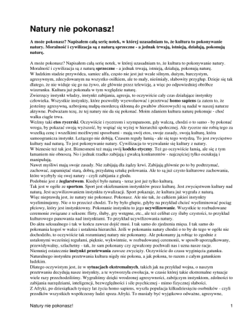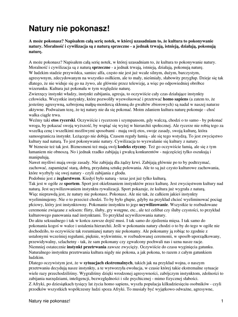 Natury nie pokonasz! A może pokonasz? Napisałem całą serię notek, w której uzasadniam to, że kultura to pokonywanie natury. Moralność i cywilizacja są z naturą sprzeczne - a jednak trwają, istnieją, działają, pokonują naturę. A może pokonasz? Napisałem całą serię notek, w której uzasadniam to, że kultura to pokonywanie natury. Moralność i cywilizacja są z naturą sprzeczne - a jednak trwają, istnieją, działają, pokonują naturę. W ludzkim stadzie przywódca, samiec alfa, często nie jest już wcale silnym, dużym, barczystym, agresywnym, zdecydowanym na wszystko osiłkiem, ale to mały, nieśmiały, słabowity przygłup. Dzieje się tak dlatego, że nie widuje się go na żywo, ale głównie przez telewizję, a więc po odpowiedniej obróbce wizerunku. Kultura już pokonała w tym względzie naturę. Zwierzęcy instynkt władzy, instynkt zabijania, agresja, to oczywiście cały czas działające instynkty człowieka. Wszystkie instynkty, które pozwoliły wyewoluować i przetrwać homo sapiens (a zatem to, że jesteśmy agresywną, uzbrojoną małpą-mordercą skłonną do gwałtów zbiorowych) są nadal w naszej naturze aktywne. Podważam tezę, że tej natury nie da się pokonać. Moim zdaniem kultura naturę pokonuje - choć walka ciągle trwa. Weźmy taki etos rycerski. Oczywiście i rycerzom i szympansom, gdy walczą, chodzi o to samo - by pokonać wroga, by pokazać swoją wyższość, by wspiąć się wyżej w hierarchii społecznej. Ale rycerze nie robią tego za wszelką cenę i wszelkimi możliwymi sposobami - mają swój etos, swoje zasady, swoją kulturę, która samoogranicza instynkt. Leżącego nie dobiją. Czasem reguły łamią - ale się tego wstydzą. To jest zwycięstwo kultury nad naturą. To jest pokonywanie natury. Cywilizacja to wyzwalanie się kultury z natury. W biznesie też tak jest. Biznesmeni też mają swój kodeks etyczny. Też go oczywiście łamią, ale się z tym łamaniem nie obnoszą. No i jednak rzadko zabijają i gwałcą konkurentów - najczęściej tylko oszukują i manipulują. Nawet myśliwi mają swoje zasady. Nie zabijają dla żądzy krwi. Zabijają głównie po to by podtrzymać, zachować, zapamiętać starą, dobrą, przydatną sztukę polowania. Ale to są już czysto kulturowe zachowania, które wyzbyły się swej natury - czyli zabijania z głodu. Podobnie jest z żeglarstwem. Kiedyś było naturą - teraz jest już tylko kulturą. Tak jest w ogóle ze sportem. Sport jest okiełznaniem instynktów przez kulturę. Jest zwycięstwem kultury nad naturą. Jest ucywilizowaniem instynktu rywalizacji. Sport pokazuje, że kultura już wygrała z naturą. Więc nieprawdą jest, że natury nie pokonasz. Pokonasz. Ale nie tak, że całkiem jakieś instynkty wyeliminujemy. Nie o to przecież chodzi. To by było głupie, gdyby na przykład chcieć wyeliminować pociąg płciowy, który jest instynktowny. Pokonanie instynktu to jego ucywilizowanie. Wszystkie te rozbudowane ceremonie związane z seksem: flirty, śluby, gry wstępne, etc., ale też celibat czy śluby czystości, to przykład kulturowego panowania nad instynktami. To przykład ucywilizowania natury. Do aktu seksualnego i tak w końcu zawsze dojść musi. I tak samo do zjedzenia mięsa. I tak samo do pokonania kogoś w walce i ustalenia hierarchii. Jeśli w pokonaniu natury chodzi o to by do tego w ogóle nie dochodziło, to oczywiście tak rozumianej natury nie pokonamy. Ale pokonamy ją robiąc to zgodnie z ustalonymi wcześniej regułami, pięknie, wykwintnie, w rozbudowanej ceremonii, w sposób uporządkowany, przewidywalny, szlachetny - tak, że sam pokonany czy zgwałcony pochwali nas i uzna nasze racje. Niemniej ostatecznie instynkt przetrwania zawsze zwycięży. Oczywiście do czasu wyginięcia gatunku. Naturalnego instynktu przetrwania kultura nigdy nie pokona, a jak pokona, to razem z całym gatunkiem ludzkim. Dlatego oczywistym jest, że w sytuacjach ekstremalnych, takich jak na przykład wojna, o naszym przetrwaniu decydują nasze instynkty, a te wytworzyła ewolucja, w czasie której takie ekstremalne sytuacje wiele razy przechodziliśmy. Wygraliśmy dzięki wrodzonej agresywności, zabójczym instynktom, zdolności to zabijania narzędziami, inteligencji, bezwzględności i sile psychicznej - mimo fizycznej słabości. Z Afryki, po dziesiątkach tysięcy lat życia homo sapiens, wyszła populacja kilkudziesięciu osobników - czyli przodków wszystkich współczesny ludzi spoza Afryki. To musiały być wyjątkowo odważne, agresywne, Natury nie pokonasz! 1 Natury nie pokonasz! zdeterminowane, żądne przygód, ciekawskie, silne, zabójcze bestie. A ich przodkowie też musieli być wyjątkowo morderczy by sobie z gołą skórą, na dwóch nogach, z marnymi zębami, posługując się tylko dzidami, poradzić z lwami i tygrysami. A ich potomkowie wytrzebili większość dużych ssaków Azji i Ameryki. I z gołą skórą przetrwali za kołem podbiegunowym. I w ogóle wybili wszystkie inne gatunki hominidów, czyli podobnych konkurentów - dokonali totalnej eksterminacji na przykład pitekantropa w Azji (który znał ogień już milion lat temu) albo neandertalczyka w Europie (który miał relatywnie większym mózg, więc był prawdopodobnie bardziej inteligentny). Człowiek to drapieżna, uzbrojona, agresywna, infantylna, skłonna do gwałtów zbiorowych, małpa-zabójca mająca silne instynkty terytorialne. W tak wyewoluowaną małpę Bóg tchnął ducha. Nie po to byśmy takimi pozostali. Po to byśmy się z tego wyzwolili przy pomocy naszych rozumów, które są zdolne do poznania dobra i zła. Ale w sytuacjach ekstremalnych nasza zabójcza natura nam oczywiście posłuży do przetrwania już wiele razy posłużyła. To nic złego. Ale to nie znaczy, że nie mamy się z tej natury wyzwalać. Właśnie po to dostaliśmy Dekalog, by się z tego wyzwolić. I tworząc cywilizację się z tego wyzwalamy. A kultura materialna, czyli bogactwo, to kl