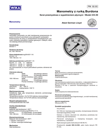 PM 02.03 Manometry z rurk¹ Burdona Serai przemys³owa z wype³nieniem p³ynnym • Model 233.50 Manometry Atest German Lloyd Przeznaczenie Wszystkie manometry ze stali nierdzewnej przeznaczone do pracy w trudnych warunkach, przy wstrz¹sach i pulsacjach. Przeznaczony do pracy w œrodowiskach korodogennych i pomiaru ciœnienia wszystkich mediów gazowych i ciek³ych, które nie zatykaj¹ uk³adu pomiarowego. Konstrukcja EN 837-1 Œrednica obudowy 63, 100 i 160 mm Klasa dok³adnoœci wg EN 837-1 /6 63 mm: 1.6 100 i 160 mm: 1.0 Zakresy pomiarowe wg EN 837-1 /5 63 mm: 0 ... 1 do 0 ... 1000 bar 100 mm: 0 ... 0,6 do 0 ... 1000 bar 160 mm: 0 ... 0,6 do 0 ... 1600 bar lub równowartoœæ w innych jednostkach pomiaru ciœnienia lub pró¿ni. Ciœnienie robocze 63 mm: Sta³e: 3/4 pe³nego zakresu Zmienne: 2/3 pe³nego zakresu Pomiar chwilowy: pe³ny zakres 100 i 160 mm: Sta³e: pe³ny zakres Zmienne: 0,9 pe³nego zakresu Pomiar chwilowy: 1,3 pe³nego zakresu Temperatura robocza Otoczenia: -20 ... +60 °C Medium: maksymalnie +100 °C B³¹d temperaturowy Dodatkowy b³¹d, gdy temperatura elementu pomiarowego ró¿ni siê od +20 °C Temperatura wy¿sza: +0,4 %/10 K zakresu rzeczywistego Temperatura ni¿sza: -0,4 %/10 K zakresu rzeczywistego Tarcza Bia³e aluminium z czarnym oznaczeniem, 63 mm z wypustem ograniczaj¹cym. Wskazówka Czarne aluminium Obudowa stal nierdzewna wykoñczona naturalnie, z odpowietrznikiem w górnej czêœci(63 i 100 mm) lub z ty³u obudowy (160 mm). Zakresy 10 bar z zaworem kompensuj¹cym ciœnienie w obudowie Szyba Szk³o bezpieczne wielowarstwowe Pierœcieñ zamykaj¹cy Pierœcieñ krzywkowy (typu bagnetowego) , ze stali nierdzewnej wykoñczonej naturalnie Stopieñ zabezpieczenia IP 65 dla EN 60 529 / IEC 529 p³ynne wype³nienie: Gliceryna 99,7 % Cechy standardowe Dodatki opcjonalne Przy³¹cze Materia³: stal nierdzewna 1.4571 Gwint (radialny lub tylny) wg EN 873-1 /7.3 63 mm: G 1/4 B (meski), 14 mm p³aski 100 i 160 mm: G 1/2 B (meski), 22 mm p³aski Element pomiarowy Materia³: stal nierdzewna 1.4571 < 100 bar: rurka typu C 100 bar: rurka typu helikalnego Mechanizm Stal nierdzewna - Inny króciec - Ko³nierz z trzema otworami do zabudowy panelowej lub naœciennej, stal nierdzewna - Pierœcieñ zamykaj¹cy o trójk¹tnej krawêdzi, stal nierdzewna, z zaciskiem - Styki awaryjne (patrz karta danych AE 08.01) 63 i 100 mm: hermetycznie szczelny, kompensacja ciœnienia wewnêtrznego(folia), IP 66 Przetwornik (model 89X.34.500, patrz karta danych PE 81.04) Wymiary Wersja standardowa 100 mm, króciec radialny dolny 100 mm, króciec tylny, w dolnej czêœci obudowy 1520 806.02 1520 814.02 Rozmiar Nominalny Wymiary [mm] a b b 1 b D1 2 D2 Waga [kg] e f G 1) h±1 SW 53 14 0.20 63 9.5 33 33 60 63 62 11.5 - 100 15.5 49.5 49.5 83 101 99 17.5 30 87 22 0.90 160 15.5 49.5 161 159 17.5 50 118 22 2.00 3) 49.5 2) 83 2) Króciec standardowy z równoleg³ym gwintem i gniazdem wg EN 837-1 /7.3. 1) Króciec tylny, centryczny 2) Dodatkowo 16 mm przy zakresach ciœnienia 100 bar 3) Dodatkowo 16 mm przy zakresie ciœnienia 1600 bar Zamówienie Proszê podaæ: Model manometru / Rozmiar nominalny / Zakres skali / Rozmiar przy³¹cza / zamawiane akcesoria opcjonalne Wykazy i wymiary podane w dokumencie zawieraj¹ dane techniczne aktualne w chwili oddania do druku niniejszego dokumentu. Dane te mog¹ ulec zmianie, a opisane urz¹dzenia byæ zast¹pione innymi bez wczeœniejszego ostrze¿enia