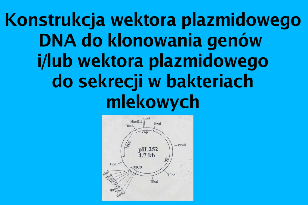 Konstrukcja wektora plazmidowego DNA do klonowania genów i/lub wektora plazmidowego do sekrecji w bakteriach mlekowych Łukasz Tranda Promotor: doc. dr hab. Jacek Bardowski, IBB Promotor: dr hab. Edward Darżynkiewicz, prof. nadzw. UW Co to jest plazmid? Charakteryzacja bakterii fermentacji mlekowej. Dlaczego warto skonstruować własny wektor? Jak wygląda wektror plazmidowy? Co to jest plazmid? Plazmidy są to autonomiczne, pozachromosalne elementy genetyczne występujące u wielu organizmów prokariotycznych i niektórych eukariotów. Charakterystyczną ich cechą jest: fizyczna odrębność od chromosomu, zdolność do trwałego utrzymywania i replikowania się w komórce. Plazmid nie koduje funkcji, które byłyby konieczne do jej życia. Zwiększa natomiast różnorodność zajmowanych środowisk. Ilość genów zgromadzonych w plazmidach odgrywa znaczącą rolę w ewolucji i zdolności adaptacyjnych komórek, w których się znajdują. Struktura przestrzenna plazmidu: Cząsteczki są zazwyczaj kowalencyjnie zamknięte, koliste i superzwinięte. U pewnych bakterii i drożdży stwierdzono również plazmidy liniowe. Wielkość: plazmid 2-100 kb i większe chromosom 1,8 – 2,5 Mb Replikacja plazmidów: Replikacja plazmidu odbywa się niezależnie od replikacji chromosomu komórki. Uznaje się je za pasożyty wewnątrzkomórkowe, które nadają komórce korzystny, w specyficznych warunkach, fenotyp. Replikację możemy podzielić na: Horyzontalną czyli poziomą; Wertykalną czyli pionową; Replikacja Pionowa: dotyczy przekazania genów w obrębie tego samego gatunku: Małe cząsteczki korzystają z systemu replikacyjnego gospodarza i jedynie potrzebują fragmentu zawierającego geny replikacji (rep). Jest to miejsce przyłączania się polimerazy DNA i wszystkich elementów potrzebnych do replikacji. Podczas podziału komórki małe fragmenty są rozdzielane losowo wraz z podziałem cytoplazmy. Duże plazmidy, mogą nieść geny, kodujące potrzebne składniki do replikacji. Podczas podziału komórki, po wcześniejszym powieleniu się plazmidów, są one rozdzielane jak chromosom, dzięki powiązaniu s z błoną poprzez mechanizm segregacji. Istnieją również plazmidy mogące integrować do chromosomu bakterii i ich replikacja zachodzi podczas powielania chromosomu. Replikacja Pozioma: dotyczy przekazania genów pomiędzy różnymi gatunkami: Koniugacja to mechanizm przenoszenia marteriału genetycznego z komórki do komórki, z udziłem plazmidu. Komórka zwierająca plazmid koniugacyjny (F+, płodna) tworzy pary koniugacyjne z komórkami nie zawierającymi takiego plazmidu (F-, niepłodna). Wytwarzając pilus, mostek łączący dwie komórki, który kurczy się powodując zbliżenie się koniugujących komórek. Dzięki takiemu połączeniu przenoszony jest DNA od dawcy F+ do biorcy F-. Geny tra niesione przez plazmid F zawierają pełną informację dotyczącą procesu koniugacji. Transfer genów bakteryjnych z jednej komórki do drugiej przez pakowanie ich w DNA faga. Tego typu przekaz genów nazywamy transdukcją. Komórki mogą pobierać nowe geny przez pobranie nagiego DNA z otaczającego podłoża. Ten proces nazywamy transformacją. Zdolność komórki do pobrania DNA zależy od jej szczególnego stanu który nazywamy kompetencją. Przykładem jest elektroporacja, która jest sztucznym procesem wstrzelanie plazmidu do komórki. Swobodne plazmidy wraz z komórkami mającymi przyjąć DNA umieszczamy w impulsie pola elektrycznego. W wyniku przepływu prądu powstają dziury w ścianie komórkowej i plazmid wnika do komórki. Krótka charakterystyka bakterii fermentacji mlekowej: gram dodatnie; fermentacja cukrów do kwasu mlekowego; obniżaanie pH środowiska do wartości 4,5-3,5; optymalna temperatura wynosi 30st C lub 37-45st C; Posiadanie statusu GRAS; czas generacji wynosi od 30 do 60 minut; Fakultatywne życie beztlenowe; wykorzystywanie w parafarmacji; ważne w biotechnologii, stosowane w przemyśle rolno-spożywczym; komórki mogą być pałeczkowate lub ziarniaki; zapobiegają niektórym schorzenią (np. alergia); Lactobacillus delbrueckii Streptococcus thermophilus Lactococcus lactis Lactobacillus casei Bifidobacterium longum Leuconostoc mesenteroides Wykorzystanie bakterii mlekowych jako model badawczy i aplikacyjny: Konstrukcja wektorów szczepionkowych w bakteriach jako adiowanty. Odgrywają one rolę w immunostymulacji układu odpornościowego; Jako GMO (genetycznie modyfikowane) produkują antygen i stymulują odporność; Jako probiotyki w hodowli zwierząt, którym nie będzie można aplikować antybiotyków; Zastosowanie probiotyków jest obecnie bardzo ograniczone ; Biotechnologia w produkcji rolno-spożywczej; Dlaczego warto się zająć konstrukcją własnych wektorów plazmidowych? Dokonywanie zmian w bakteriach to pewne narzędzie do celów badawczych, ale również aplikacyjnych. W późniejszym okresie korzystanie z tych plazmidów jest bezproblemowe. Posiadając własny obiekt badawczy znika kwestia patentu. Plazmidy bakteryjne na bazie, których będziemy konstruować wektory będą pochodzić z własnej kolekcji IBB lub zostaną wizolowane ze szczepów naturlnych, na które nikt nie posiada patentu. Typy genów obecnych w plazmidach: Pierwsze są niezbędne do funkcjonowania jako niezależny replikon, występujący na wszystkich plazmidach. Są to geny niezbędne do replikacji i utrzymania plazmidu w komórce nazywane genami rep. Plazmidy zawierające tylko pierwszy typ genów nie będą wyróżniały komórek bakteryjnych, które nazwano kryptycznymi. Ta sama nazwa odnosi się do plazmidów, których funkcji jeszcze nie znamy. Drugim typem są geny, stanowiące dodatkowe wyposażenie w plazmidzie. Odpowiadają one za różnorodność fenotypów kodowanych przez plazmidy: Przetwarzanie substancji organicznych Odporność na wysoką temperaturę; Oporność na antybiotyki; Oporność na jony metali ciężkich; Produkcja bakteriocyn; Pozwalające 