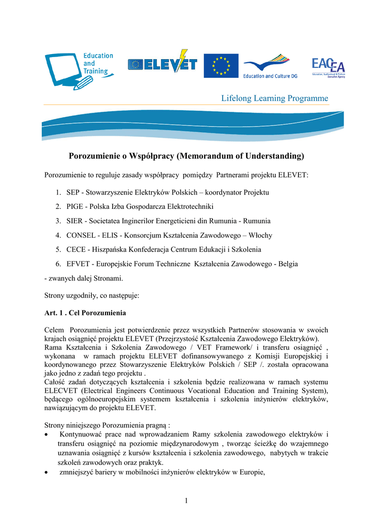 Lifelong Learning Programme Porozumienie o Współpracy (Memorandum of Understanding) Porozumienie to reguluje zasady współpracy pomiędzy Partnerami projektu ELEVET: 1. SEP - Stowarzyszenie Elektryków Polskich – koordynator Projektu 2. PIGE - Polska Izba Gospodarcza Elektrotechniki 3. SIER - Societatea Inginerilor Energeticieni din Rumunia - Rumunia 4. CONSEL - ELIS - Konsorcjum Kształcenia Zawodowego – Włochy 5. CECE - Hiszpańska Konfederacja Centrum Edukacji i Szkolenia 6. EFVET - Europejskie Forum Techniczne Kształcenia Zawodowego - Belgia - zwanych dalej Stronami. Strony uzgodniły, co następuje: Art. 1 . Cel Porozumienia Celem Porozumienia jest potwierdzenie przez wszystkich Partnerów stosowania w swoich krajach osiągnięć projektu ELEVET (Przejrzystość Kształcenia Zawodowego Elektryków). Rama Kształcenia i Szkolenia Zawodowego / VET Framework/ i transferu osiągnięć , wykonana w ramach projektu ELEVET dofinansowywanego z Komisji Europejskiej i koordynowanego przez Stowarzyszenie Elektryków Polskich / SEP /. została opracowana jako jedno z zadań tego projektu . Całość zadań dotyczących kształcenia i szkolenia będzie realizowana w ramach systemu ELECVET (Electrical Engineers Continuous Vocational Education and Training System), będącego ogólnoeuropejskim systemem kształcenia i szkolenia inżynierów elektryków, nawiązującym do projektu ELEVET. Strony niniejszego Porozumienia pragną : Kontynuować prace nad wprowadzaniem Ramy szkolenia zawodowego elektryków i transferu osiągnięć na poziomie międzynarodowym , tworząc ścieżkę do wzajemnego uznawania osiągnięć z kursów kształcenia i szkolenia zawodowego, nabytych w trakcie szkoleń zawodowych oraz praktyk. zmniejszyć bariery w mobilności inżynierów elektryków w Europie, 1 ustanowić dla kursantów międzynarodowe programy mobilności, rozpowszechniać we własnych krajach jednolitą metodę kształcenia elektryków poprzez stosowanie podręcznika dla wykładowców (Handbook for Trainers), uwzględniającego zasady podane w Ramie Kształcenia i Szkolenia Zawodowego, ustanowić dla absolwentów szkoleń dyplom inżyniera zawodu elektryka, uznawanego we wszystkich krajach UE. Strony postanawiają utworzenie Rady (ELECVET Certification BOARD) i Komitetu Roboczego (ELECVET Certification Working Commmittee) dla zapewnienia przyjęcia i i uznania Ramy Kształcenia i Szkolenia Zawodowego / VET Framework/ i transferu osiągnięć na poziomie krajowym ( w krajach partnerów) i na szczeblu międzynarodowym . Art. 2 . Definicje ELECVET Certification BOARD – zwana Radą , jest dobrowolnym organem , który wypełnia ustalenia zawarte we wnioskach ELEVET Work Package 4 . Rada skupia osoby delegowane przez partnerów , którzy pracują razem w celu zapewnienia przyjęcia i uznania Ramy Kształcenia i Szkolenia Zawodowego / VET Framework/ i transferu osiągnięć. Decyzje podjęte przez Radę będą akceptowane w drodze konsensusu pomiędzy Stronami . ELECVET Certification Working Commmittee – zwany Komitetem Roboczym , jest platformą roboczą Rady, która przekazuje poszczególne zadania do Komitetu . Komitet wykonuje te zadania przez Strony, które dostarczają wystarczających środków na taką realizację , pochodzących zarówno ze źródeł własnych jak i dofinansowania z Komisji Europejskiej (II etap realizacji projektu, o który występujemy). ECVET – europejski system kumulowania osiągnięć za pośrednictwem zdobywanych przez inżynierów elektryków punktów, określanych zgodnie z Ramą Szkolenia Zawodowego Inżynierów Elektryków (VET Framework and Credit Transfer). Art. 3 . Termin realizacji Porozumienia Niniejsza umowa wchodzi w życie z dniem podpisania Porozumienia przez wszystkie Strony i pozostaje w mocy na czas nieokreślony , chyba że zostanie rozwiązana zgodnie z artykułem 6. Art. 4 . Obowiązki i prawa Stron Strony będą przyczyniały się do utrzymania i rozwoju Ramy Kształcenia i szkolenia zawodowego / VET Framework/ i transferu osiągnięć w sposób uzgodniony i przyjętymi przez Radę . Strony będą uczestniczyć w regularnych posiedzeniach Rady i Komitetu Roboczego . Roczny program spotkań będzie ustalany na ostatnim posiedzeniu Rady każdego roku kalendarzowego . Przewiduje się, że w ciągu roku odbędzie się przynajmniej jedno posiedzenie Rady i jedno spotkanie Komitetu Roboczego. Roczny wkład czasu pracy dla Strony będzie wyszacowany w wystąpieniu o II etap realizacji projektu. Art. 5 . Szczególne obowiązki Stron w Komitecie Roboczym SEP, jako koordynator Projektu i i SIER ,będą zarządzać planami dotyczącymi Ramy Kształcenia i szkolenia zawodowego / VET Framework/ i transferu osiągnięć, 2 SEP zorganizuje sekretariat ds. Ramy Kształcenia i szkolenia zawodowego / VET Framework/ i transferu osiągnięć, który będzie służył jako centrum systemu odpowiedzialnego za zewnętrzną ( mailingi , promocje) i wewnętrzną komunikację między stronami, organizację posiedzeń Rady i Komitetu Roboczego, ogólną koordynację systemu . PIGE , CONSEL – ELIS , CECE, EFVET będą koordynować promocję Ramy Kształcenia i szkolenia zawodowego / VET Framework/ i transferu osiągnięć, w swoich krajach SEP zapewni utrzymanie strony internetowej projektu i bazy danych . Art. 6. Rozwiązanie umowy Każda ze stron może wypowiedzieć niniejszą umowę z trzymiesięcznym okresem wypowiedzenia . Art.7. Klauzula dotycząca jurysdykcji W przypadku braku polubownego rozwiązania spraw między stronami , wszelkie spory będą rozstrzygane przez Sądy i zgodnie z prawem obowiązującym w kraju partnera , który odpowiada za obowiązki sekretariatu, w którym znajduje się siedziba sekretariatu, w momencie składania petycji. Sądy te mają wyłączną kompetencję do rozstrzygania wszelkich sporów pomiędzy stronami umowy w odniesieniu do tej umowy . Artykuł 8. Zmiany lub uzupełnienia do umowy wymagają formy pisemnej, akceptowanej przez Strony