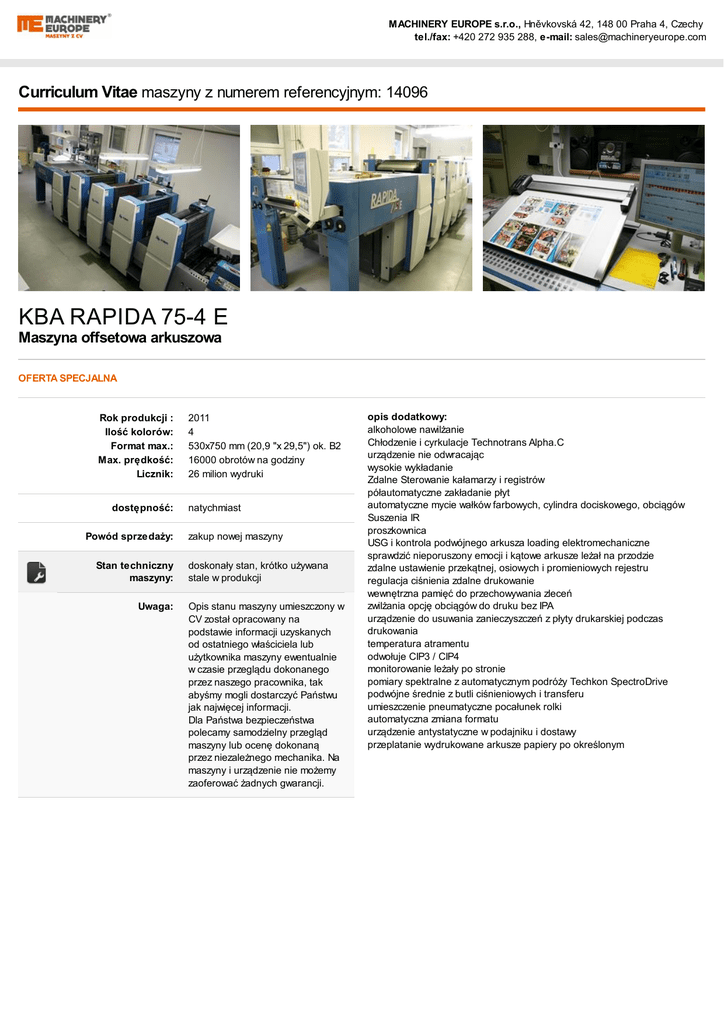 MACHINERY EUROPE s.r.o., Hněvkovská 42, 148 00 Praha 4, Czechy tel./fax: +420 272 935 288, e-mail: [email protected] Curriculum Vitae maszyny z numerem referencyjnym: 14096 KBA RAPIDA 75-4 E Maszyna offsetowa arkuszowa OFERTA SPECJALNA Rok produkcji : Ilość kolorów: Format max.: Max. prędkość: Licznik: dostępność: Powód sprzedaży: Stan techniczny maszyny: Uwaga: 2011 4 530x750 mm (20,9 "x 29,5") ok. B2 16000 obrotów na godziny 26 milion wydruki natychmiast zakup nowej maszyny doskonały stan, krótko używana stale w produkcji Opis stanu maszyny umieszczony w CV został opracowany na podstawie informacji uzyskanych od ostatniego właściciela lub użytkownika maszyny ewentualnie w czasie przeglądu dokonanego przez naszego pracownika, tak abyśmy mogli dostarczyć Państwu jak najwięcej informacji. Dla Państwa bezpieczeństwa polecamy samodzielny przegląd maszyny lub ocenę dokonaną przez niezależnego mechanika. Na maszyny i urządzenie nie możemy zaoferować żadnych gwarancji. opis dodatkowy: alkoholowe nawilżanie Chłodzenie i cyrkulacje Technotrans Alpha.C urządzenie nie odwracając wysokie wykładanie Zdalne Sterowanie kałamarzy i registrów półautomatyczne zakładanie płyt automatyczne mycie wałków farbowych, cylindra dociskowego, obciągów Suszenia IR proszkownica USG i kontrola podwójnego arkusza loading elektromechaniczne sprawdzić nieporuszony emocji i kątowe arkusze leżał na przodzie zdalne ustawienie przekątnej, osiowych i promieniowych rejestru regulacja ciśnienia zdalne drukowanie wewnętrzna pamięć do przechowywania zleceń zwilżania opcję obciągów do druku bez IPA urządzenie do usuwania zanieczyszczeń z płyty drukarskiej podczas drukowania temperatura atramentu odwołuje CIP3 / CIP4 monitorowanie leżały po stronie pomiary spektralne z automatycznym podróży Techkon SpectroDrive podwójne średnie z butli ciśnieniowych i transferu umieszczenie pneumatyczne pocałunek rolki automatyczna zmiana formatu urządzenie antystatyczne w podajniku i dostawy przeplatanie wydrukowane arkusze papiery po określonym