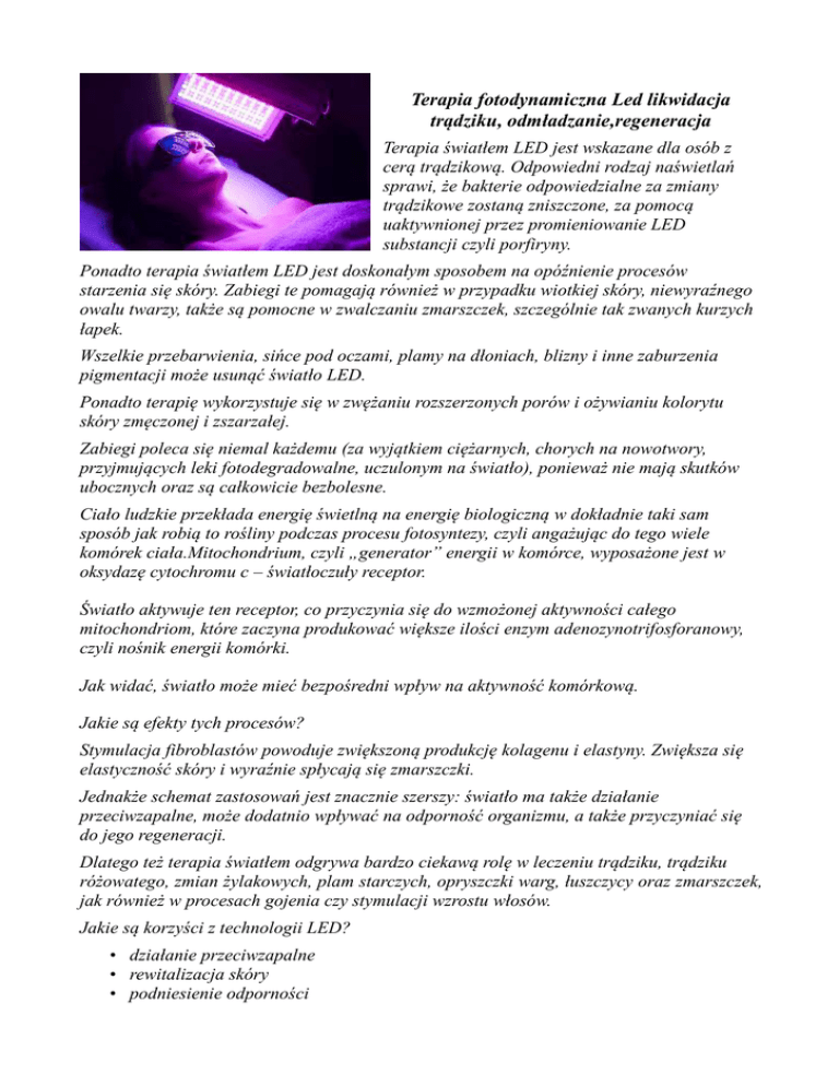 Terapia fotodynamiczna Led likwidacja trądziku, odmładzanie