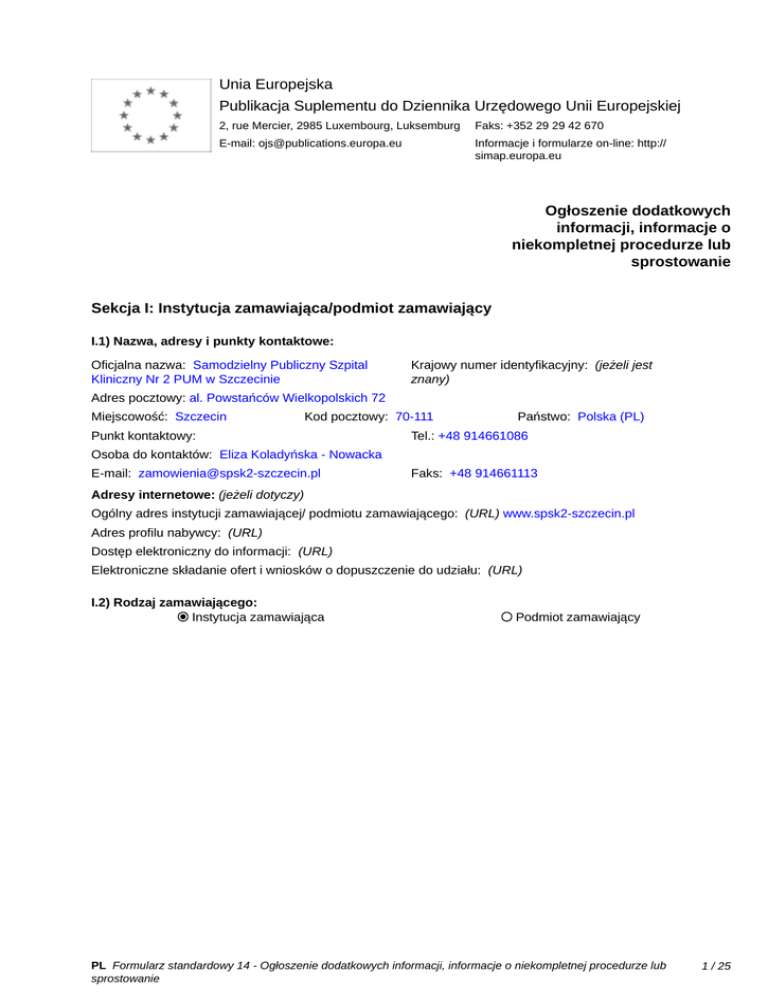 Unia Europejska Publikacja Suplementu do Dziennika Urzędowego Unii Europejskiej 2, rue Mercier, 2985 Luxembourg, Luksemburg Faks: +352 29 29 42 670 E-mail: [email protected] Informacje i formularze on-line: http:// simap.europa.eu Ogłoszenie dodatkowych informacji, informacje o niekompletnej procedurze lub sprostowanie Sekcja I: Instytucja zamawiająca/podmiot zamawiający I.1) Nazwa, adresy i punkty kontaktowe: Oficjalna nazwa: Samodzielny Publiczny Szpital Kliniczny Nr 2 PUM w Szczecinie Krajowy numer identyfikacyjny: (jeżeli jest znany) _____ Adres pocztowy: al. Powstańców Wielkopolskich 72 Miejscowość: Szczecin Kod pocztowy: 70-111 Punkt kontaktowy: _____ Państwo: Polska (PL) Tel.: +48 914661086 Osoba do kontaktów: Eliza Koladyńska - Nowacka E-mail: [email protected] Faks: +48 914661113 Adresy internetowe: (jeżeli dotyczy) Ogólny adres instytucji zamawiającej/ podmiotu zamawiającego: (URL) www.spsk2-szczecin.pl Adres profilu nabywcy: (URL) _____ Dostęp elektroniczny do informacji: (URL) _____ Elektroniczne składanie ofert i wniosków o dopuszczenie do udziału: (URL) _____ I.2) Rodzaj zamawiającego: Instytucja zamawiająca Podmiot zamawiający PL Formularz standardowy 14 - Ogłoszenie dodatkowych informacji, informacje o niekompletnej procedurze lub sprostowanie 1 / 25 Sekcja II: Przedmiot zamówienia II.1.1) Nazwa nadana zamówieniu: Wykonanie robót budowlanych polegających na przebudowie/rozbudowie budynku Szpitala mieszczącego Kliniki chirurgiczne z blokami operacyjnymi (budynek F) II.1.2) Krótki opis zamówienia lub zakupu: (podano w pierwotnym ogłoszeniu) Przedmiotem zamówienia są roboty budowlane polegające na przebudowie/rozbudowie budynku szpitala mieszczącego kliniki chirurgiczne z blokami operacyjnymi (budynek F) w SPSK-2 PUM w Szczecinie wraz z infrastrukturą towarzyszącą, drogami wewnętrznymi, z wprowadzeniem wyjścia ewakuacyjnego przez mur. Przedmiot zamówienia obejmuje następujące branże: - budowlaną - architektoniczną - elektryczną - sanitarną - teletechniczną - wentylacyjno-klimatyzacyjną - technologiczną - zagospodarowanie terenu wraz z instalacjami zewnętrznymi. II.1.3) Wspólny Słownik Zamówień (CPV) Główny przedmiot Dodatkowe przedmioty Słownik główny 45000000 45111300 45112700 45215140 45261210 45332200 45332300 45111100 45300000 45331100 45331200 45333000 45331210 45331220 45330000 45231300 45312200 45314000 45312100 45421000 45443000 Słownik uzupełniający (jeżeli dotyczy) PL Formularz standardowy 14 - Ogłoszenie dodatkowych informacji, informacje o niekompletnej procedurze lub sprostowanie 2 / 25 Sekcja IV: Procedura IV.1)Rodzaj procedury (podano w pierwotnym ogłoszeniu) Otwarta Ograniczona Ograniczona przyspieszona Negocjacyjna Negocjacyjna przyspieszona Dialog konkurencyjny Negocjacyjna z uprzednim ogłoszeniem Negocjacyjna bez uprzedniego ogłoszenia Negocjacyjna z publikacją ogłoszenia o zamówieniu Negocjacyjna bez publikacji ogłoszenia o zamówieniu Udzielenie zamówienia bez uprzedniej publikacji ogłoszenia o zamówieniu w Dzienniku Urzędowym Unii Europejskiej IV.2)Informacje administracyjne IV.2.1)Numer referencyjny: (podano w pierwotnym ogłoszeniu) ZP/220/38/14 IV.2.2)Dane referencyjne ogłoszenia w przypadku ogłoszeń przesłanych drogą elektroniczną: Pierwotne ogłoszenie przesłane przez eNotices TED eSender Login: ENOTICES_SSZP Dane referencyjne ogłoszenia: 2014-035529 rok i numer dokumentu IV.2.3)Ogłoszenie, którego dotyczy niniejsza publikacja: Numer ogłoszenia w Dz.U.: 2014/S 055-091295 z dnia: 19/03/2014 (dd/mm/rrrr) IV.2.4)Data wysłania pierwotnego ogłoszenia: 14/03/2014 (dd/mm/rrrr) PL Formularz standardowy 14 - Ogłoszenie dodatkowych informacji, informacje o niekompletnej procedurze lub sprostowanie 3 / 25 Sekcja VI: Informacje uzupełniające VI.1) Ogłoszenie dotyczy: Procedury niepełnej Sprostowania Informacji dodatkowych VI.2) Informacje na temat niepełnej procedury udzielenia zamówienia: Postępowanie o udzielenie zamówienia zostało przerwane Postępowanie o udzielenie zamówienia uznano za nieskuteczne Zamówienia nie udzielono Zamówienie może być przedmiotem ponownej publikacji VI.3) Informacje do poprawienia lub dodania : VI.3.1) Zmiana oryginalnej informacji podanej przez instytucję zamawiającą Publikacja w witrynie TED niezgodna z oryginalną informacją, przekazaną przez instytucję zamawiającą Oba przypadki VI.3.2) W ogłoszeniu pierwotnym W odpowiedniej dokumentacji przetargowej (więcej informacji w odpowiedniej dokumentacji przetargowej) W obu przypadkach (więcej informacji w odpowiedniej dokumentacji przetargowej) VI.3.3) Tekst, który należy poprawić w pierwotnym ogłoszeniu Miejsce, w którym znajduje się Zamiast: zmieniany tekst: — Wykluczenie wykonawców z III.2.1) Sytuacja podmiotowa postępowania (art. 24 PZP) oraz oświadczenia i dokumenty, jakie wykonawców, w tym wymogi mają dostarczyć Wykonawcy w związane z wpisem do rejestru celu wykazania braku podstaw do zawodowego lub handlowego. wykluczenia: Informacje i formalności konieczne 1. Wykonawcy podlegają wykluczeniu z postępowania w do dokonania oceny spełniania okolicznościach, o których mowa w wymogów: art. 24 ust 1 i 2 PZP. 2. W celu wykazania braku podstaw do wykluczenia z postępowania w okolicznościach, o których mowa w art. 24 ust. 1 PZP Zamawiający żąda załączenia do formularza oferty stanowiącego załącznik do SIWZ następujących oświadczeń i dokumentów: 2.1. oświadczenia o braku podstaw do wykluczenia z postępowania - w tym celu wykonawcy mogą wykorzystać wzór oświadczenia stanowiący załącznik do formularza oferty; Powinno być: - Wykluczenie wykonawców z postępowania (art. 24 PZP) oraz oświadczenia i dokumenty, jakie mają dostarczyć Wykonawcy w celu wykazania braku podstaw do wykluczenia: 1. Wykonawcy podlegają wykluczeniu z postępowania w okolicznościach, o których mowa w art. 24 ust 1 i 2 PZP. 2. W celu wykazania braku pod