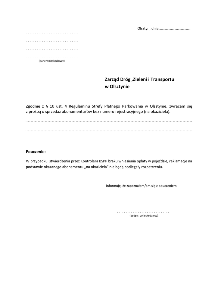 Olsztyn, dnia ………………………………. .............................. .............................. .............................. .............................. (dane wnioskodawcy) Zarząd Dróg ,Zieleni i Transportu w Olsztynie Zgodnie z § 10 ust. 4 Regulaminu Strefy Płatnego Parkowania w Olsztynie, zwracam się z prośbą o sprzedaż abonamentu/ów bez numeru rejestracyjnego (na okaziciela). Pouczenie: W przypadku stwierdzenia przez Kontrolera BSPP braku wniesienia opłaty w pojeździe, reklamacje na podstawie okazanego abonamentu „na okaziciela” nie będą podlegały rozpatrzeniu. informuję, że zapoznałem/am się z pouczeniem .............................. (podpis wnioskodawcy)