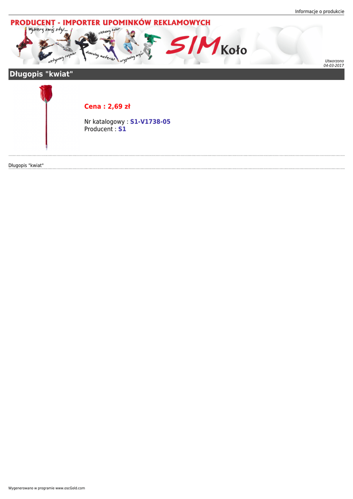 Informacje o produkcie Utworzono 04-03-2017 Długopis "kwiat" Cena : 2,69 zł Nr katalogowy : S1-V1738-05 Producent : S1 Długopis "kwiat" Wygenerowano w programie www.oscGold.com