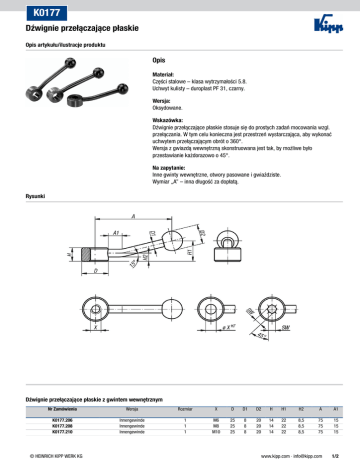 K0177 Dźwignie przełączające płaskie Opis artykułu/ilustracje produktu Opis Materiał: Części stalowe – klasa wytrzymałości 5.8. Uchwyt kulisty – duroplast PF 31, czarny. Wersja: Oksydowane. Wskazówka: Dźwignie przełączające płaskie stosuje się do prostych zadań mocowania wzgl. przełączania. W tym celu konieczna jest przestrzeń wystarczająca, aby wykonać uchwytem przełączającym obrót o 360°. Wersja z gwiazdą wewnętrzną skonstruowana jest tak, by możliwe było przestawianie każdorazowo o 45°. Na zapytanie: Inne gwinty wewnętrzne, otwory pasowane i gwiaździste. Wymiar „A” – inna długość za dopłatą. Rysunki Dźwignie przełączające płaskie z gwintem wewnętrznym Nr Zamówienia Wersja Rozmiar X D D1 D2 H H1 H2 A A1 K0177.206 K0177.208 K0177.210 Innengewinde Innengewinde Innengewinde 1 1 1 M6 M8 M10 25 25 25 8 8 8 20 20 20 14 14 14 22 22 22 8,5 8,5 8,5 75 75 75 15 15 15 www.kipp.com · [email protected] 1/2 © HEINRICH KIPP WERK KG K0177 Dźwignie przełączające płaskie Nr Zamówienia Wersja Rozmiar X D D1 D2 H H1 H2 A A1 K0177.212 K0177.216 K0177.220 K0177.224 Innengewinde Innengewinde Innengewinde Innengewinde 2 2 3 3 M12 M16 M20 M24 33 33 41 41 10 10 12 12 25 25 30 30 17 17 20 20 27 27 36 36 10 10 11,5 11,5 100 100 128 128 15 15 15 15 Dźwignie przełączające płaskie z otworem pasowanym Nr Zamówienia Wersja Rozmiar X D D1 D2 H H1 H2 A A1 K0177.106 K0177.108 K0177.110 K0177.112 K0177.116 K0177.120 K0177.124 Otwór pasowany Otwór pasowany Otwór pasowany Otwór pasowany Otwór pasowany Otwór pasowany Otwór pasowany 1 1 1 2 2 3 3 6 8 10 12 16 20 24 25 25 25 33 33 41 41 8 8 8 10 10 12 12 20 20 20 25 25 30 30 14 14 14 17 17 20 20 22 22 22 27 27 36 36 8,5 8,5 8,5 10 10 11,5 11,5 75 75 75 100 100 128 128 15 15 15 15 15 15 15 Dźwignie przełączające płaskie z gwiazdą wewnętrzną Nr Zamówienia Wersja Rozmiar SW D D1 D2 H H1 H2 A A1 K0177.305 K0177.307 K0177.309 K0177.311 K0177.314 K0177.319 Gwiazda wewnętrzna Gwiazda wewnętrzna Gwiazda wewnętrzna Gwiazda wewnętrzna Gwiazda wewnętrzna Gwiazda wewnętrzna 1 1 2 2 3 3 5,5 7 9 11 14 19 25 25 33 33 41 41 8 8 10 10 12 12 20 20 25 25 30 30 14 14 17 17 20 20 22 22 27 27 36 36 8,5 8,5 10 10 11,5 11,5 75 75 100 100 128 128 15 15 15 15 15 15 © HEINRICH KIPP WERK KG www.kipp.com · [email protected] 2/2