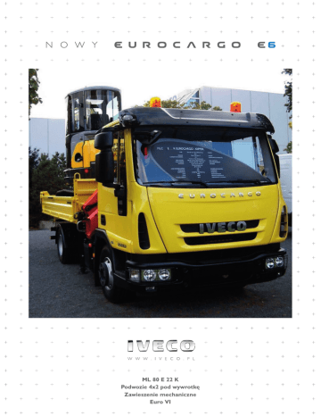 ML 80 E 22 K Podwozie 4x2 pod wywrotkę Zawieszenie mechaniczne Euro VI SILNIK TECTOR E22 I SKRZYNIA BIEGÓW Chłodzony cieczą silnik 6-cylindrowy, rzędowy, czterosuwowy, wysokoprężny z turbodoładowaniem i chłodzeniem powietrza doładowanego, wał korbowy na 5 łożyskach, wałek rozrządu w głowicy, 4 zawory na cylinder. Turbosprężarka z zaworem upustowym, elektronicznie sterowany wtrysk wysokociśnieniowy ze wspólnego kolektora Common Rail (HPCR). Pompa wspomagania, suchy filtr powietrza, wymuszony układ smarowania z pompą zębatą. Wentylator ze sprzęgłem wiskotycznym. Filtr paliwa z separatorem wody, hamulec silnikowy klapowy, układ oczyszczania spalin SCRT, z kontrolą OBD i sterowaniem wtrysku AdBlue. Pasywny filtr cząstek stałych nie wymagający dopalania. TECTOR E 22 Moc maksymalna / przy obrotach Maksymalny moment obrotowy Liczba cylindrów Średnica cylindra x skok tłoka Pojemność skokowa Moc hamulca silnikowego Wskaźnik zużycia paliwa Zielony zakres obrotów Masa sucha Pojemność skokowa kompresora Poziom hałasu zgodny z Emisja spalin zgodna z Typ kW (KM) / obr/min Nm / obr/min mm 3 cm kW (KM) / obr/min g/kWh obr/min kg 3 cm F4A 162 (220) / 2500 800 / 1250 4 104 x 132 6728 118 (165) / 2800 199,1 1000 – 2100 526 225 70/157/EU*1999/101/EU 595/2009/EU Euro VI SKRZYNIA BIEGÓW I PRZEŁOŻENIA ZF 6 AS 800 TO (138 kg) Skrzynia zautomatyzowana 1. 6,58 2. 3,60 3. 2,12 4. 1,39 5. 1,00 6. 0,78 R 6,06 ZF 6 S 800 TO (124 kg) Skrzynia manualna 1. 6,58 2. 3,60 3. 2,12 4. 1,39 5. 1,00 6. 0,78 R 6,06 ZF 9 S 75 TO (125 kg) Skrzynia manualna C. 9,56 1. 6,47 2. 4,72 3. 3,50 4. 2,54 5. 1,85 6. 1,35 7. 1,00 8. 0,73 R. 8,53 Suche jednotarczowe Ø 395 mm, sterowane elektrohydraulicznie Zautomatyzowane bez pedału sprzęgła Suche jednotarczowe Ø 395 mm, sterowane hydraulicznie Suche jednotarczowe Ø 395 mm, sterowane hydraulicznie PARAMETRY JEZDNE Typ skrzyni biegów ZF6AS800 TO ZF6S800 TO ZF9S75TO Przełożenie główne i= 4,1 4,1 4,56 Prędkość na 1. biegu km/h 14,3 14,3 8,8 Prędkość na najwyższym. biegu km/h (ogranicznik) 120 (90) 120 (90) 115 (90) Pokonywanie wzniesień na 1. % 63,3 63,3 100,0 biegu Pokonywanie wzniesień na % 6,9 6,9 7,2 najwyższym biegu Obroty silnika na najwyższym obr/min 1895 1895 1970 biegu przy 90 km/h Pokonywanie wzniesień dla DMC, wszystkie dane dla standardowego przełożenia mostu i ogumienia. Prędkość maksymalna ograniczona elektronicznie do 90 km/h ML 80 E 22 K Podwozie 4x2 pod wywrotkę Zawieszenie mechaniczne Euro VI D80 PODWOZIE Układ hamulcowy Hamulce tarczowe na przedniej i tylnej osi, układ dwuobwodowy hydropneumatyczny wspomagany nadciśnieniem z hydraulicznym układem wykonawczym. Układ przeciwpoślizgowy ABS i elektroniczny korektor siły hamowania (EBL), podgrzewany osuszacz powietrza, zbiorniki powietrza stalowe. Standardowo bez złączy do przyczepy. Średnica tarcz: oś przednia 330 x 32 mm oś tylna 330 x 32 mm Hamulec pomocniczy i postojowy sprężynowy zwalniany pneumatycznie, działający na oś tylną Hamulec silnikowy klapowy Amortyzatory Amortyzatory hydrauliczne przedniej i tylnej osi. Stabilizatory Stabilizator osi przedniej i tylnej Oś przednia Oś sztywna, kierowana, prosta, środkowa część profil dwuteowy Oś tylna Oś sztywna, napędzana, jednostopniowa, przełożenie standardowe: i=4,1 dla skrzyń 6-biegowych i=4,56 dla skrzyni 9-biegowej Koła / ogumienie Koła stalowe 6.00 x 17,5 Ogumienie: Oś 1: 9,5/75R17,5, szosowo-terenowe Oś 2: 9,5/75R17,5, szosowo-terenowe, bliźniacze Układ kierowniczy Wspomaganie hydrauliczne ZF, kolumna kierownicy regulowana w zakresie wysokości (50 mm) i pochylenia (17°) Koło kierownicy o średnicy 470 mm ML 80 E 22 K Podwozie 4x2 pod wywrotkę Zawieszenie mechaniczne Euro VI Zawieszenie mechaniczne Oś 1: sześciopiórowe zawieszenie z resorami półeliptycznymi i odbojami gumowymi Oś 2: ośmiopiórowe zawieszenie z resorami półeliptycznymi Rama nośna Rama drabinkowa z równoległymi i jednolitymi na całej długości podłużnicami ceowymi, pierwsza poprzeczka z przykręconym zaczepem do holowania, poprzeczki nitowane w części środkowej, ostatnia poprzeczka przykręcana, możliwość holowania do D=70 kN Wymiary podłużnic: 203x65x4,0 mm Elementy podwozia 3 Zbiornik paliwa 120 dm z tworzywa sztucznego. 3 Zbiornik AdBlue 30 dm z tworzywa sztucznego, podgrzewany Dwa kliny pod koła Osłona chłodnicy Osłony przeciwnajazdowe z przodu i z tyłu Inne Zestaw narzędzi z podnośnikiem Wyposażenie opcjonalne - różne przełożenia przekładni głównej - różne rozmiary i marki opon - przygotowanie do holowania przyczep - układ przeciwpoślizgowy przy ruszaniu ASR - układ utrzymania stabilności pojazdu ESP - złącze telematyki i urządzeń zarządzania flotą FMS - moduł sterowania silnikiem do pracy z przystawką odbioru mocy CanOpen - przygotowanie do montażu windy hydraulicznej - przystawki odbioru mocy - składana osłona przeciwnajazdowa z tyłu - inne Układ wydechowy Tłumik zintegrowany z katalizatorem układu obróbki spalin SCRT, z elektronicznie sterowanym i podgrzewanym układem wtrysku AdBlue, bez układu EGR. Wylot w lewo. Układ elektryczny Wielokanałowa architektura oparta na technologii CAN-Bus Napięcie pokładowe 24V Alternator 28V, 70A (1960W) Rozrusznik 24V, 4,5kW Akumulatory 2x12V, 120Ah Światła główne halogenowe H7 Światła tylne zintegrowane z cofania i przeciwmgłowym Przygotowanie do świateł obrysowych Immobilizer Tempomat Przygotowanie do PTO D80 KABINA Kabina dzienna MLC Zewnątrz Niski dach Częściowo ocynkowana Okna w ścianie tylnej Górne światła obrysowe Osłony podwozia Izolacja dźwiękowa i termiczna Zawieszenie machaniczne Hydrauliczny układ podnoszenia Lusterka do szerokości 2600 mm zgodne z Dyr. 2003/97/EU i 5005/27/EU, sterowane ręcznie Filtr powietrza za kabiną Osłony przeciwrozbryzgowe w nadkolu Zderzak z tw. sztucznego i elementy kabiny nielakierowane, ciemnoszare Króćce napełniania oleju 