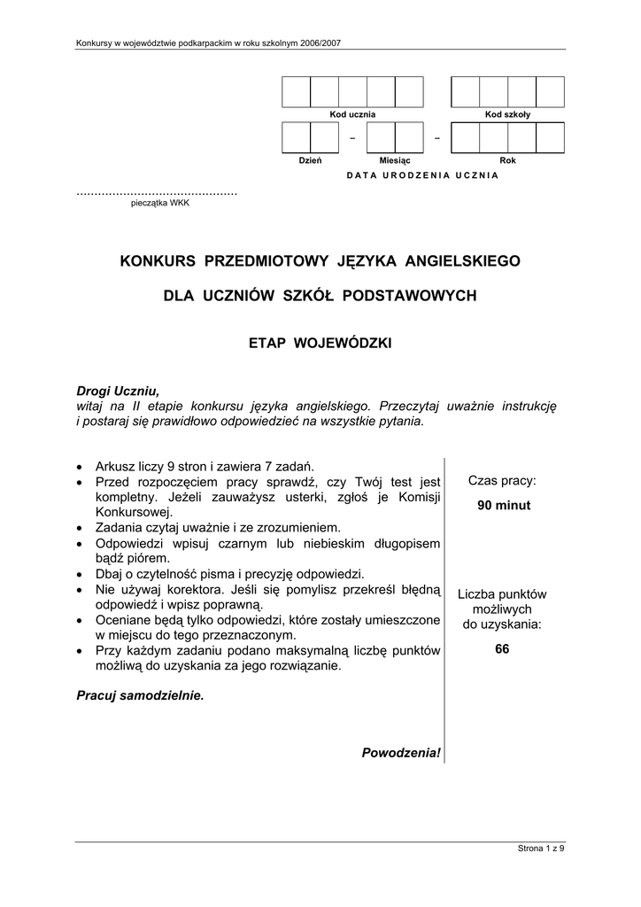 Konkursy w województwie podkarpackim w roku szkolnym 2006/2007 Kod ucznia Kod szkoły – Dzień – Miesiąc Rok DATA URODZENIA UCZNIA ............................................. pieczątka WKK KONKURS PRZEDMIOTOWY JĘZYKA ANGIELSKIEGO DLA UCZNIÓW SZKÓŁ PODSTAWOWYCH ETAP WOJEWÓDZKI Drogi Uczniu, witaj na II etapie konkursu języka angielskiego. Przeczytaj uważnie instrukcję i postaraj się prawidłowo odpowiedzieć na wszystkie pytania. • • • • • • • • Arkusz liczy 9 stron i zawiera 7 zadań. Przed rozpoczęciem pracy sprawdź, czy Twój test jest kompletny. Jeżeli zauważysz usterki, zgłoś je Komisji Konkursowej. Zadania czytaj uważnie i ze zrozumieniem. Odpowiedzi wpisuj czarnym lub niebieskim długopisem bądź piórem. Dbaj o czytelność pisma i precyzję odpowiedzi. Nie używaj korektora. Jeśli się pomylisz przekreśl błędną odpowiedź i wpisz poprawną. Oceniane będą tylko odpowiedzi, które zostały umieszczone w miejscu do tego przeznaczonym. Przy każdym zadaniu podano maksymalną liczbę punktów możliwą do uzyskania za jego rozwiązanie. Czas pracy: 90 minut Liczba punktów możliwych do uzyskania: 66 Pracuj samodzielnie. Powodzenia! Strona 1 z 9 Konkursy w województwie podkarpackim w roku szkolnym 2006/2007 Zadanie 1. (0 – 6 pkt.) Read the following information about different pen pals. 1. Mary, 24 years old, comes from 2. Kim Lee, 19 years old, comes from Scotland and would like to find a pen pal Seoul, South Korea. Kim loves travelling who comes from East Europe. She likes and hopes to visit Great Britain in the playing the piano and listening to jazz future. He would like a pen pal who is music. She is interested in history but interested in discussing the differences does not like discussing politics. between life in Europe and life in Asia. He loves listening to pop music and playing football in his free time. 3. Pietro, 42 years old, comes from 4. Helga, 33 years old, comes from Argentina. He is a businessman and Germany and speaks French, English and would like to find a pen pal who is also a Russian. She would like a pen pal who is businessperson and lives in North interested in exchanging ideas about America. He is married with three language learning. She does not like using children and likes using the Internet in computers for learning and believes that his free time. language learning can only happen in a classroom. 5. Jennifer, 18, comes from Cardiff in 6. Alessandro, 25 years old, comes from Wales. She is interested in discussing Rome. He is interested in finding a pen pal the political differences between East who speaks different languages and can Europe and the United Kingdom. She exchange ideas on using the computer for loves riding her horse, Jackie, and learning purposes. He likes playing tennis listening to jazz music. and football in his free time. Comprehension Questions Which pen pal is best for these people? Choose ONLY ONE pen pal for each person. A. Piotrek Kowalski, 18, comes from Poland and would like a pen pal who is interested in discussing the current political situation in the world. He likes jazz and playing tennis in his free time. The best pen pal for Piotrek would be.......................................... Strona 2 z 9 Konkursy w województwie podkarpackim w roku szkolnym 2006/2007 B. Tom Hendrix, 36, is a businessman from Toronto, Canada. He would like to find a pen pal from a different continent to discuss business practices and differences between his country and others. The best pen pal for Tom would be.............................................. C. Olga, 32 years old, comes from Moscow, Russia. She is a historian and would like to find a pen pal who is interested in discussing the history of Russia before the communist regime. She is not interested in comparing different political systems. The best pen pal for Olga would be............................................... D. Jack, 27, is from London. His favourite pastime is learning languages. He goes to evening German and French classes and uses his computer to improve his German and French by visiting Internet sites. The best pen pal for Jack would be....................................................... E. James, 22, is from Dublin. He loves travelling and wants to visit Asia in the near future and would like a pen pal who likes playing football and who can tell him about the differences between life in Asia and Ireland. The best pen pal for James would be............................................... F. Ela, 35 years old, comes from Sydney, Australia. She likes learning languages, but does not like using modern technology. She is interested in finding a pen pal who also enjoys learning languages in a traditional manner. The best pen pal for Ela would be...................................................... Strona 3 z 9 Konkursy w województwie podkarpackim w roku szkolnym 2006/2007 Zadanie 2. (0 – 10 pkt.) Odd-Word-Out. Which Word is Different? 1. elephant, panda, pig, tiger, goat, sheep, snake 2. strawberry, raspberry, blackberry, blueberry, peach 3. football, wrestling, cricket, ping pong, golf, rugby, polo, volleyball 4. secretary, judge, man, policeman, fireman, teacher, nurse, postman 5. Poland, Russia, England, Rome, Laos, Wales, Jersey, Ukraine 6. onion, celery, lettuce, pineapple, turnip, parsnip, leek, potato 7. Melanie, Hania, Ruth, Peter, Maria, Jenny, Christine, Magda 8. mineral water, bread, soda, tea, cola, coffee, milk, juice, hot chocolate, milk shake 9. aeroplane, bird, rocket, balloon, cat, jet 10. stockings, bra, blouse, bag, waistcoat, dress, hat Zadanie 3. (0 – 10 pkt.) Put the words in the correct order to make a proper sentence. 1. ideas / much / hers / always / better / his / are / than …………………………………………………………………………………………….. 2. listens / forecast / hardly / she / to / weather / ever / the / radio …………………………………