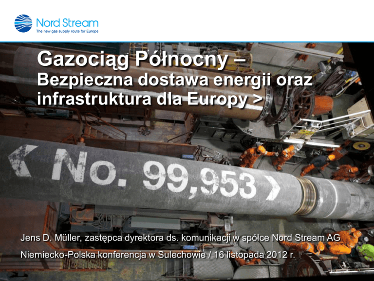 Gazociąg Północny – Bezpieczna dostawa energii oraz infrastruktura dla Europy > Jens D. Müller, zastępca dyrektora ds. komunikacji w spółce Nord Stream AG Niemiecko-Polska konferencja w Sulechowie / 16 listopada 2012 r. Rosnące zapotrzebowanie na gaz ziemny w Europie > W roku 2030 UE będzie musiała importować dodatkowo 211 mld m³ gazu ziemnego 626 mld m³ 508 mld m³ 55 156 312 Deficyt gazu 211 mld m³ Istniejący import UE 312 196 Spadek produkcji własnej w UE Produkcja własna Żródło: IEA World Energy Outlook 2011 Istniejący import 103 Dodatkowe zapotrzebowanie na import Gazociąg Północny 2 Rosnący udział gazu ziemnego w mix-ie energetycznym w UE i w Polsce > Udział gazu ziemnego w mix-ie energetycznym w UE 2009 25,2 % 2030 29,8 % Udział gazu ziemnego w mix-ie energetycznym w Polsce 2010 12,9 % 2030 14,5 % Żródła: dla Polski: “Polityka energetyczna Polski do roku 2030” (polskie Ministerstwo Gospodarki, 2009) | Dla UE-27: IEA World Energy Outlook, 2011 3 Strategia UE: dywersyfikacja źródeł oraz infrastruktury przesyłowej > Import z Norwegii Import LNG Import z Rosji Wydobycie gazu łupkowego Import z Azerbejdżanu Import z Północnej Afryki 4 Dywersyfikacja wydobycia oraz tras przesyłowych w Polsce > Planowany import LNG Planowany gazociąg BernauSzczecin Przesył zwrotny, tzw. „wirtualny rewers“ gazociągiem jamalskim Import z Rosji przez Gazociąg Jamalski Wydobycie gazu łupkowego Gazociągi pomiędzy państwami sąsiadującymi (DE, CZ, UA, BY) 5 Potrzebne są dodatkowe trasy przesyłu gazu ziemnego > Gazociągi działające od roku 2008 Gazociąg Północny Gazociągi w budowie (55 mld. m3 rocznie) Działają obie nitki Europejska sieć przesyłowa Gazociąg Nabucco West* Galsi 3 Medgaz (8 mld m rocznie) (8 mld m3 rocznie) Transmed (+ 7 mld m3 rocznie) Źródło: Komisja Europejska, Plan priorytetowych połączeń 2007; Gazociąg Północny (10-23 mld m3 rocznie) Gazociąg Transadriatycki Gazociąg (TAP)* Południowy (10 mld m3 (63 mld m3 rocznie) rocznie) ITGI / IGI Poseidon (8-10 mld m3 rocznie) Połączenie Turkey-GreeceInterconnector (11-12 mld m3 rocznie) Gazociąg Trans-Anatolian (TANAP) (16 mld m3 rocznie) * Uwaga: Gazociąg Nabucco West oraz Gazociąg Transadriatycki starają się o dalszy przesył gazu ziemnego poprzez TANAP, prawdopodobnie zostanie zrealizowany tylko jeden z tych projektów. 6 Gazociąg Północny: projekt w interesie Europy > > Gazociąg Północny został uznany za projekt priorytetowy w ramach Dyrektyw dotyczących sieci transeuropejskich („Dyrektywy TEN-E“) w roku 2000 Gazociąg Północny zakwalifikowano w Dyrektywie TEN-E jako „przedsięwzięcie leżące we wspólnym interesie “ w roku 2003 potwierdzono status gazociągu w roku 2006 Gazociąg Północny uznano za „przedsięwzięcie leżące w interesie Europy“ > Oznacza to, że Gazociąg Północny… Jest zgodny z celami europejskiej polityki energetycznej - stałości, konkurencyjności i bezpieczeństwa dostaw Został uznany przez państwa członkowskie UE za jeden z najbardziej znaczących projektów uwzględniających zapotrzebowanie na infrastrukturę w Europie Źródło: decyzja 1364/2006/WE Parlamentu Europejskiego oraz Rady Europejskiej, 6 września 2006 r. Wyzwania w zakresie zaopatrzenia w gaz w Europie > Gazociąg Północny jest „prawdziwie europejskim projektem“ oraz dobrym przykładem współpracy w obszarze Morza Bałtyckiego. Jose Manuel Barroso Prezydent Komisji Europejskiej Stralsund, 31 maja 2012 r. 8 Struktura energetyczna dla Europy> Gazociąg Północny > Dwie równoległe nitki przebiegające przez Morze Bałtyckie , o długości 1.224 km każda > Przepustowość przesyłu 55 mld m³ rocznie > Bezpośrednie połączenie złóż gazu w Rosji z Unią Europejską > Stanowi uzupełnienie istniejącej sieci gazowej oraz planowane projekty budowy gazociągów Gaz z Gazociągu Północnego może > Dostarczyć energię elektryczną i cieplną do 26 milionów gospodarstw w Europie > W znaczący sposób przyczynić się do osiągnięcia celów klimatycznych UE > Dotrzeć do odbiorców już od listopada 2011 9 Nord Stream AG – silne europejsko-rosyjskie konsorcjum > 51% 15,5% 15,5% 9% 9% 10 Wzajemne interesy kształtują europejsko-rosyjskie stosunki energetyczne > > Przychody z eksportu gazu ziemnego do Europy * (27,26 mld euro) stanowiły w roku 2010 ok. 50% przychodów ogółem z eksportu spółki Gazprom. 148,1 mld m³ gazu > Około 20% przychodów Rosji pochodzi z Gazpromu Niezawodna i stabilna współpraca leży w interesie obu partnerów € 27,26 mld euro Quellen: Gazprom, 2010 | * Europa = EU-27 exklusive baltische Staaten, plus Schweiz, Türkei, Serbien, Kroatien 11 Projekt Gazociągu Północnego w zarysie > Gazociąg Północny przyczynia się do bezpieczeństwa energetycznego w Europie oraz do osiągnięcia celów UE w zakresie ochrony klimatycznej > Gazociąg Północny jest jednym z kluczowych projektów mających na celu zapewnienie dostaw energii w Europie przez najbliższe 50 lat > Gazociąg Północny jest bezpiecznym i ekologicznym gazociągiem, zbudowanym zgodnie z rygorystycznymi międzynarodowymi i krajowymi standardami > Gazociąg Północny jest długofalowym projektem współpracy pomiędzy UE a Rosją > Realizacja Gazociągu Północnego odbyła się zgodnie z planem finansowym oraz harmonogramem czasowym i od listopada 2011 płynie nim gaz bezpośrednio do Unii Europejskiej > W październiku 2012 uruchomiono w pełni zautomatyzowany system gazociągów. Studium wykonalności 1997-1999 Ocena wpływu na Projekt środowisko Wnioski & I i II etap techniczny naturalne pozwolenia finansowania 2005-2009 2006-2008 2009 2009-2011 Budowa 1 Uruchomienie Budowa 2 nitki nitki 1 nitki 2010-2011 2011 2011-2012 Uruchomienie Wstępne 2 nitki uruchomienie 2 nitki 2012 2012 12 Dziewięć państw graniczących z Morzem Bałtyckim wzięło udział w konsultacjach na mocy konwencji z Espoo > Państwa zaangażowane w proj.