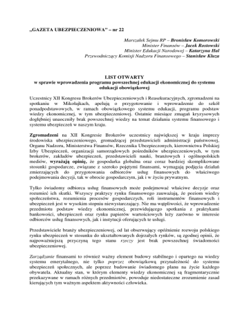 „GAZETA UBEZPIECZENIOWA” – nr 22 Marszałek Sejmu RP – Bronisław Komorowski Minister Finansów – Jacek Rostowski Minister Edukacji Narodowej – Katarzyna Hal Przewodniczący Komisji Nadzoru Finansowego – Stanisław Kluza LIST OTWARTY w sprawie wprowadzenia programu powszechnej edukacji ekonomicznej do systemu edukacji obowiązkowej Uczestnicy XII Kongresu Brokerów Ubezpieczeniowych i Reasekuracyjnych, zgromadzeni na spotkaniu w Mikołajkach, apelują o przygotowanie i wprowadzenie do szkół ponadpodstawowych, w ramach obowiązkowego systemu edukacji, programu podstaw wiedzy ekonomicznej, w tym ubezpieczeniowej. Ostatnie miesiące zmagań kryzysowych dogłębniej unaoczniły brak powszechnej wiedzy na temat działania systemu finansowego i systemu ubezpieczeń w naszym kraju. Zgromadzeni na XII Kongresie Brokerów uczestnicy największej w kraju imprezy środowiska ubezpieczeniowego, gromadzącej przedstawicieli administracji państwowej, Organu Nadzoru, Ministerstwa Finansów, Rzecznika Ubezpieczonych, kierownictwa Polskiej Izby Ubezpieczeń, organizacji samorządowych pośredników ubezpieczeniowych, w tym brokerów, zakładów ubezpieczeń, przedstawicieli nauki, branżowych i ogólnopolskich mediów, wyrażają opinię, że gospodarka globalna oraz coraz bardziej skomplikowane stosunki gospodarcze, związane z szeroko pojętymi finansami, wymagają podjęcia działań zmierzających do przygotowania odbiorców usług finansowych do właściwego podejmowania decyzji, tak w obrocie gospodarczym, jak i w życiu prywatnym. Tylko świadomy odbiorca usług finansowych może podejmować właściwe decyzje oraz rozumieć ich skutki. Wszyscy praktycy rynku finansowego zauważają, że poziom wiedzy społeczeństwa, rozumienia procesów gospodarczych, roli instrumentów finansowych i ubezpieczeń jest w wysokim stopniu niewystarczający. Nie ma wątpliwości, że wprowadzenie przedmiotu podstaw wiedzy ekonomicznej, przewidującego spotkania z praktykami bankowości, ubezpieczeń oraz rynku papierów wartościowych leży zarówno w interesie odbiorców usług finansowych, jak i instytucji oferujących te usługi. Przedstawiciele branży ubezpieczeniowej, od lat obserwujący opóźnienie rozwoju polskiego rynku ubezpieczeń w stosunku do ukształtowanych dojrzałych rynków, są zgodnej opinii, że najpoważniejszą przyczyną tego stanu rzeczy jest brak powszechnej świadomości ubezpieczeniowej. Zarządzanie finansami to również ważny element budowy stabilnego i opartego na wiedzy systemu emerytalnego, nie tylko poprzez obowiązkową przynależność do systemu ubezpieczeń społecznych, ale poprzez budowanie świadomego planu na życie każdego obywatela. Aktualny stan, w którym elementy wiedzy ekonomicznej są fragmentarycznie przekazywane w ramach różnych przedmiotów, powoduje niedostateczne zrozumienie zasad kierujących tym ważnym aspektem aktywności człowieka. Mając na uwadze powyższe, zwracamy się z prośbą o pilne podjęcie interdyscyplinarnych prac, zmierzających do wprowadzenia programu powszechnej edukacji ekonomicznej do systemu edukacji obowiązkowej. Uczestnicy spotkania * * *