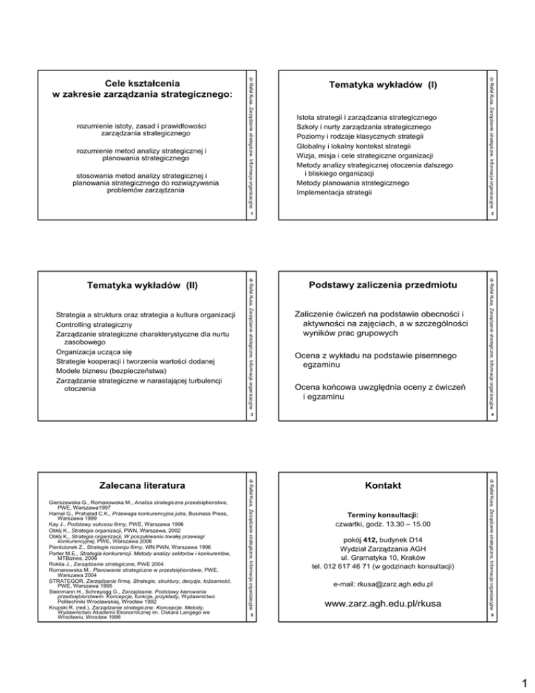 rozumienie metod analizy strategicznej i planowania strategicznego stosowania metod analizy strategicznej i planowania strategicznego do rozwiązywania problemów zarządzania Tematyka wykładów (I) Istota strategii i zarządzania strategicznego Szkoły i nurty zarządzania strategicznego Poziomy i rodzaje klasycznych strategii Globalny i lokalny kontekst strategii Wizja, misja i cele strategiczne organizacji Metody analizy strategicznej otoczenia dalszego i bliskiego organizacji Metody planowania strategicznego Implementacja strategii 1 2 Podstawy zaliczenia przedmiotu Zaliczenie ćwiczeń na podstawie obecności i aktywności na zajęciach, a w szczególności wyników prac grupowych Ocena z wykładu na podstawie pisemnego egzaminu Ocena końcowa uwzględnia oceny z ćwiczeń i egzaminu 3 5 4 Kontakt Terminy konsultacji: czwartki, godz. 13.30 – 15.00 pokój 412, budynek D14 Wydział Zarządzania AGH ul. Gramatyka 10, Kraków tel. 012 617 46 71 (w godzinach konsultacji) e-mail: [email protected] www.zarz.agh.edu.pl/rkusa dr Rafał Kusa, Zarządzanie strategiczne, Informacje organizacyjne Gierszewska G., Romanowska M., Analiza strategiczna przedsiębiorstwa, PWE, Warszawa1997 Hamel G., Prahalad C.K., Przewaga konkurencyjna jutra, Business Press, Warszawa 1999 Kay J., Podstawy sukcesu firmy, PWE, Warszawa 1996 Obłój K., Strategia organizacji, PWN, Warszawa, 2002 Obłój K., Strategia organizacji, W poszukiwaniu trwałej przewagi konkurencyjnej, PWE, Warszawa 2006 Pierścionek Z., Strategie rozwoju firmy, WN PWN, Warszawa 1996 Porter M.E., Strategia konkurencji. Metody analizy sektorów i konkurentów, MTBiznes, 2006 Rokita J., Zarządzanie strategiczne, PWE 2004 Romanowska M., Planowanie strategiczne w przedsiębiorstwie, PWE, Warszawa 2004 STRATEGOR, Zarządzanie firmą. Strategie, struktury, decyzje, toŜsamość, PWE, Warszawa 1995 Steinmann H., Schreyogg G., Zarządzanie. Podstawy kierowania przedsiębiorstwem. Koncepcje, funkcje, przykłady, Wydawnictwo Politechniki Wrocławskiej, Wrocław 1992 Krupski R. (red.), Zarządzanie strategiczne. Koncepcje. Metody, Wydawnictwo Akademii Ekonomicznej im. Oskara Langego we Wrocławiu, Wrocław 1998 dr Rafał Kusa, Zarządzanie strategiczne, Informacje organizacyjne Zalecana literatura dr Rafał Kusa, Zarządzanie strategiczne, Informacje organizacyjne Strategia a struktura oraz strategia a kultura organizacji Controlling strategiczny Zarządzanie strategiczne charakterystyczne dla nurtu zasobowego Organizacja ucząca się Strategie kooperacji i tworzenia wartości dodanej Modele biznesu (bezpieczeństwa) Zarządzanie strategiczne w narastającej turbulencji otoczenia dr Rafał Kusa, Zarządzanie strategiczne, Informacje organizacyjne Tematyka wykładów (II) dr Rafał Kusa, Zarządzanie strategiczne, Informacje organizacyjne rozumienie istoty, zasad i prawidłowości zarządzania strategicznego dr Rafał Kusa, Zarządzanie strategiczne, Informacje organizacyjne Cele kształcenia w zakresie zarządzania strategicznego: 6 1