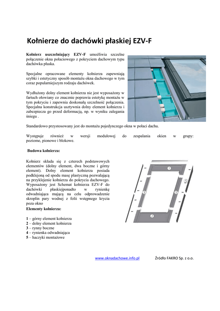 Kołnierze do dachówki płaskiej EZV-F Kołnierz uszczelniający EZV-F umożliwia szczelne połączenie okna połaciowego z pokryciem dachowym typu dachówka płaska. Specjalne opracowane elementy kołnierza zapewniają szybki i estetyczny sposób montażu okna dachowego w tym coraz popularniejszym rodzaju dachówek. Wydłużony dolny element kołnierza nie jest wyposażony w fartuch ołowiany co znacznie poprawia estetykę montażu w tym pokryciu i zapewnia doskonałą szczelność połączenia. Specjalna konstrukcja usztywnia dolny element kołnierza i zabezpiecza go przed deformacją, np. w wyniku zalegania śniegu . Standardowo przystosowany jest do montażu pojedynczego okna w połaci dachu. Występuje również w poziome, pionowe i blokowe. wersji modułowej do zespalania okien w grupy: Budowa kołnierza: Kołnierz składa się z czterech podstawowych elementów (dolny element, dwa boczne i górny element). Dolny element kołnierza posiada podklejoną od spodu masę plastyczną pozwalającą na przyklejenie kołnierza do pokrycia dachowego. Wyposażony jest Schemat kołnierza EZV-F do dachówki płaskiejponadto w rynienkę odwadniająca mającą na celu odprowadzenie skroplin pary wodnej z folii wstępnego krycia poza okno Elementy kołnierza: 1 – górny element kołnierza 2 – dolny element kołnierza 3 – rynny boczne 4 – rynienka odwadniająca 5 – haczyki montażowe www.oknadachowe.info.pl Źródło FAKRO Sp. z o.o.