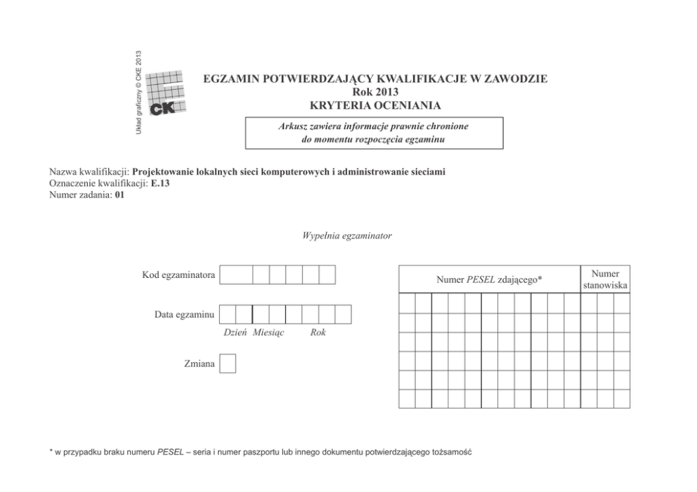Ukáad graficzny © CKE 2013 EGZAMIN POTWIERDZAJĄCY KWALIFIKACJE W ZAWODZIE Rok 2013 KRYTERIA OCENIANIA Arkusz zawiera informacje prawnie chronione do momentu rozpoczĊcia egzaminu Nazwa kwalifikacji: Projektowanie lokalnych sieci komputerowych i administrowanie sieciami Oznaczenie kwalifikacji: E.13 Numer zadania: 01 Wypeánia egzaminator Kod egzaminatora Numer PESEL zdającego* Data egzaminu DzieĔ Miesiąc Rok Zmiana * w przypadku braku numeru PESEL – seria i numer paszportu lub innego dokumentu potwierdzającego toĪsamoĞü Numer stanowiska Numer stanowiska Elementy podlegające ocenie/kryteria oceny Rezultat 1. Kabel pođączeniowy 1 Kabel z obu stron zakoĔczony zđączami 8P8C/RJ45 2 Kabel wykonany jako pođączeniowy prosty 3 Przewody w 8P8C uđoĪone zgodnie ze standardem EIA/TIA 586 B Rezultat 2. Skonfigurowany protokóđ TCP/IP 1 Ustawiony adres IP: 192.168.1.X 2 Ustawiona maska: 255.255.255.0 3 Ustawiona brama: 192.168.1.1 4 Ustawiony DNS: 127.0.0.1/lub 192.168.1.X Rezultat 3. Utworzone konta i grupy uĪytkowników 1 Utworzone konto uĪytkownika jacek z hasđem jacek123 2 Utworzone konto uĪytkownika adam z hasđem adam234 3 Konto jacek jest czđonkiem grupy PRODUKCJA 4 Konto adam jest czđonkiem grupy SPRZEDAĩ Rezultat 4. Skonfigurowana usđuga FTP i DNS 1 Dziađająca usđuga FTP z dostĊpem anonimowym na porcie 21 (ftp://192.168.1.xx widoczne pliki: *.exe) 2 Zainstalowany serwer DNS 3 Ustawiona nazwa zetka1.pl na adres IP serwera 4 Ustawiona nazwa bogobo.org na adres IP 123.123.123.123 5 Ustawione przekazywanie zapytaĔ na adres 194.204.159.1 Strona 2 z 3 Egzaminator wpisuje T, jeĪeli zdający speđniđ kryterium albo N, jeĪeli nie speđniđ Numer stanowiska Rezultat 5. Skonfigurowany serwer DHCP 1 Zainstalowany serwer DHCP 2 Nazwa zakresu dodawanych adresów zawiera PESEL zdającego 3 Przypisany zakres adresów IP: od 192.168.1.20 – 192.168.1.39, dđugoĞü maski /24 4 Ustawiony czas dzierĪawy na 4 dni dla pierwszego zakresu dodawanych adresów 5 Ustawione zastrzeĪenie dla egzaminacyjnej stacji roboczej: na adres IP 192.168.1.30 Uwaga: Egzaminator sprawdza czy kable zostađy poprawnie opisane (zapisany PESEL zdającego i numer stanowiska egzaminacyjnego), a nastĊpnie ocenia poprawnoĞü podđączenia stacji roboczej i serwera do sieci LAN oraz konfiguracjĊ usđug sieciowych na serwerze zgodnie ze schematem oceniania. Po zakoĔczeniu ww. prac egzaminator ocenia poprawnoĞü wykonania kabli, posđugując siĊ testerem, znajdującym siĊ na stanowisku egzaminacyjnym Egzaminator ......................................................................................................................... .......................................................................... data i czytelny podpis imiĊ i nazwisko Strona 3 z 3