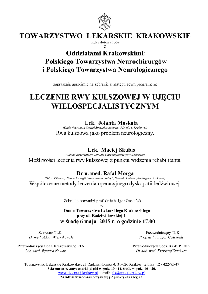 TOWARZYSTWO LEKARSKIE KRAKOWSKIE Rok założenia 1866 Z Oddziałami Krakowskimi: Polskiego Towarzystwa Neurochirurgów i Polskiego Towarzystwa Neurologicznego zapraszają uprzejmie na zebranie z następującym programem: LECZENIE RWY KULSZOWEJ W UJĘCIU WIELOSPECJALISTYCZNYM Lek. Jolanta Moskała (Oddz.Neurologii Szpital Specjalistyczny im. J.Dietla w Krakowie) Rwa kulszowa jako problem neurologiczny. Lek. Maciej Skubis (Zakład Rehabilitacji, Szpitala Uniwersyteckiego w Krakowie) Możliwości leczenia rwy kulszowej z punktu widzenia rehabilitanta. Dr n. med. Rafał Morga (Oddz. Kliniczny Neurochirurgii i Neurotraumatologii, Szpitala Uniwersyteckiego w Krakowie) Współczesne metody leczenia operacyjnego dyskopatii lędźwiowej. Zebranie prowadzi prof. dr hab. Igor Gościński w Domu Towarzystwa Lekarskiego Krakowskiego przy ul. Radziwiłłowskiej 4, w środę 6 maja 2015 r. o godzinie 17.00 Sekretarz TLK Dr med. Adam Wiernikowski Przewodniczący TLK Prof. dr hab. Igor Gościński Przewodniczący Oddz. Krakowskiego PTN Lek. Med. Ryszard Nowak Przewodniczący Oddz. Krak. PTNch Dr hab. med. Krzysztof Stachura Towarzystwo Lekarskie Krakowskie, ul. Radziwiłłowska 4, 31-026 Kraków, tel./fax 12 - 422-75-47 Sekretariat czynny: wtorki, piątki w godz. 10 - 14, środy w godz. 16 – 20. www.tlk.cm-uj.krakow.pl email: [email protected] Za udział w zebraniu przysługują 2 punkty edukacyjne.