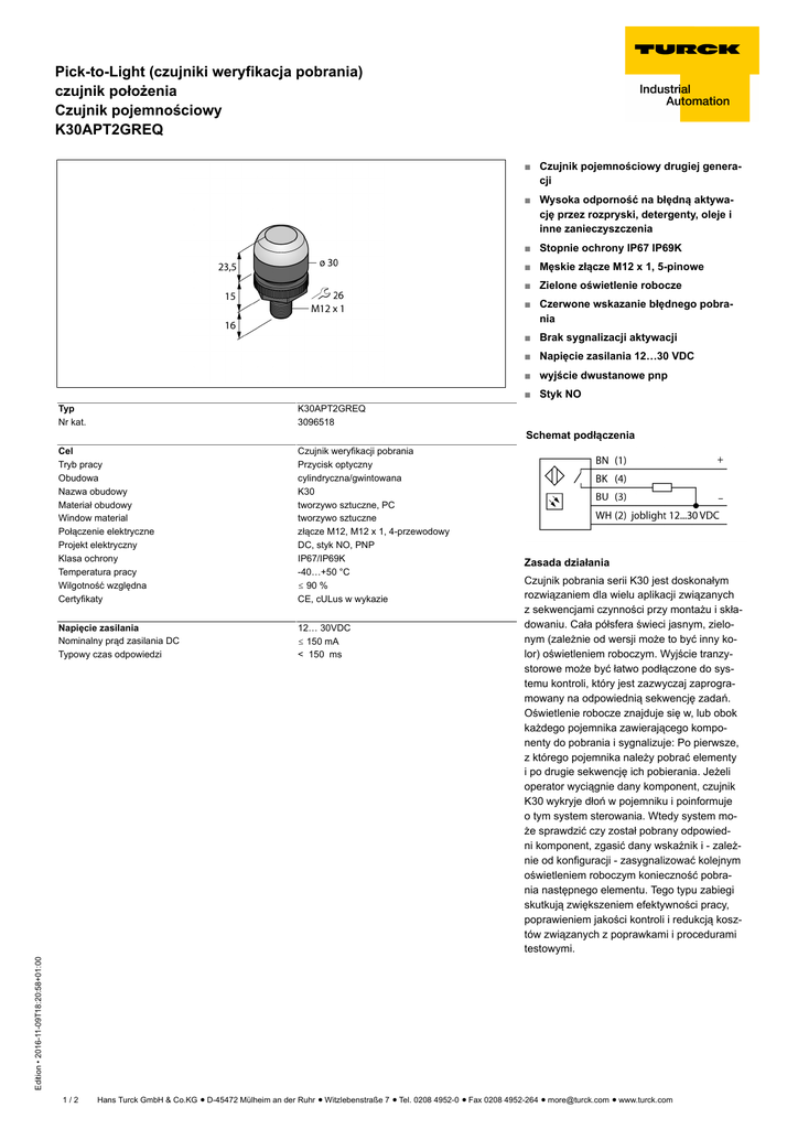 Pick-to-Light (czujniki weryfikacja pobrania) czujnik położenia Czujnik pojemnościowy K30APT2GREQ ■ Czujnik pojemnościowy drugiej generacji ■ Wysoka odporność na błędną aktywację przez rozpryski, detergenty, oleje i inne zanieczyszczenia ■ Stopnie ochrony IP67 IP69K ■ Męskie złącze M12 x 1, 5-pinowe ■ Zielone oświetlenie robocze ■ Czerwone wskazanie błędnego pobrania ■ Brak sygnalizacji aktywacji ■ Napięcie zasilania 12…30 VDC ■ wyjście dwustanowe pnp ■ Styk NO K30APT2GREQ 3096518 Cel Tryb pracy Obudowa Nazwa obudowy Materiał obudowy Window material Połączenie elektryczne Projekt elektryczny Klasa ochrony Temperatura pracy Wilgotność względna Certyfikaty Czujnik weryfikacji pobrania Przycisk optyczny cylindryczna/gwintowana K30 tworzywo sztuczne, PC tworzywo sztuczne złącze M12, M12 x 1, 4-przewodowy DC, styk NO, PNP IP67/IP69K -40…+50 °C ð 90 % CE, cULus w wykazie Napięcie zasilania Nominalny prąd zasilania DC Typowy czas odpowiedzi 12… 30VDC ð 150 mA < 150 ms Schemat podłączenia Zasada działania Czujnik pobrania serii K30 jest doskonałym rozwiązaniem dla wielu aplikacji związanych z sekwencjami czynności przy montażu i składowaniu. Cała półsfera świeci jasnym, zielonym (zależnie od wersji może to być inny kolor) oświetleniem roboczym. Wyjście tranzystorowe może być łatwo podłączone do systemu kontroli, który jest zazwyczaj zaprogramowany na odpowiednią sekwencję zadań. Oświetlenie robocze znajduje się w, lub obok każdego pojemnika zawierającego komponenty do pobrania i sygnalizuje: Po pierwsze, z którego pojemnika należy pobrać elementy i po drugie sekwencję ich pobierania. Jeżeli operator wyciągnie dany komponent, czujnik K30 wykryje dłoń w pojemniku i poinformuje o tym system sterowania. Wtedy system może sprawdzić czy został pobrany odpowiedni komponent, zgasić dany wskaźnik i - zależnie od konfiguracji - zasygnalizować kolejnym oświetleniem roboczym konieczność pobrania następnego elementu. Tego typu zabiegi skutkują zwiększeniem efektywności pracy, poprawieniem jakości kontroli i redukcją kosztów związanych z poprawkami i procedurami testowymi. Edition • 2016-11-09T18:20:58+01:00 Typ Nr kat. 1/2 Hans Turck GmbH & Co.KG ñ D-45472 Mülheim an der Ruhr ñ Witzlebenstraße 7 ñ Tel. 0208 4952-0 ñ Fax 0208 4952-264 ñ [email protected] ñ www.turck.com Pick-to-Light (czujniki weryfikacja pobrania) czujnik położenia Czujnik pojemnościowy K30APT2GREQ Akcesoria montażowe Nr kat. SMB22A 3079414 Rysunek wymiarowy Mounting bracket, stainless steel, for K30L series Edition • 2016-11-09T18:20:58+01:00 Typ 2/2 Hans Turck GmbH & Co.KG ñ D-45472 Mülheim an der Ruhr ñ Witzlebenstraße 7 ñ Tel. 0208 4952-0 ñ Fax 0208 4952-264 ñ [email protected] ñ www.turck.com
