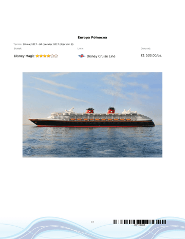 Europa Północna Termin: 28 maj 2017 - 04 czerwiec 2017 (ilość dni: 8) Statek: Disney Magic Linia: Cena od: Disney Cruise Line €1 533.00/os. 1/3 EV:46032 TRASA REJSU Data Port Wpłynięcie Wypłynięcie niedziela 28.05.2017 Kopenhaga --:-- 16:00 dzień 2 poniedziałek 29.05.2017 Dzień na morzu --:-- --:-- dzień 3 wtorek 30.05.2017 Tallinn 10:45 17:15 środa 31.05.2017 Sankt Petersburg 08:15 23:30 11:45 17:30 09:15 15:45 dzień 1 dzień 4 dzień 5 czwartek 01.06.2017 Dania Estonia Rosja Helsinki Finlandia piątek 02.06.2017 Sztokholm dzień 7 sobota 03.06.2017 Dzień na morzu --:-- --:-- dzień 8 niedziela 04.06.2017 Kopenhaga 07:30 --:-- dzień 6 Legenda Szwecja Dania CENNIK Cena katalogowa Kabina wewnętrzna od €1 533.00 Kabina zewnętrzna z oknem od €1 706.00 Kabina zewnętrzna z balkonem od €2 234.00 Suite (apartament) od €6 422.00 Kabina jednoosobowa na zapytanie 3 i 4 osoba dorosła w kabinie na zapytanie dziecko od 2 do 12 lat jako 3 i 4 osoba w kabinie na zapytanie dziecko od 0 do 2 lat jako 3 i 4 osoba w kabinie na zapytanie Cena promocyjna 2/3 EV:46032 Opłaty portowe €126.00 Uwaga! Ceny za osobę w kabinie dwuosobowej. Cena zawiera: zakwaterowanie w kabinie wybranej kategorii; wyżywienie - 3 główne posiłki, przekąski między posiłkami, bufet lub przekąski o północy; napoje serwowane do śniadania i w bufetach samoobsługowych; serwis bagażowy podczas wejścia i zejścia ze statku; serwis kabinowy; korzystanie ze wszystkich urządzeń sportowo - rekreacyjnych znajdujących się na pokładzie statku (basen, jacuzzi, sala fitness, itp.); udział we wszystkich imprezach organizowanych na statku (przedstawienia w teatrze, koncerty, programy animacyjne itp.). Cena nie zawiera: kosztów dojazdu do portu; ewentualnych noclegów w hotelu przed/po rejsie i transferów; wycieczek fakultatywnych w trakcie rejsu; korzystania z barów, mini baru w kabinie oraz napojów zamawianych w restauracji; korzystania z punktów usługowych (fryzjer, pralnia, fotograf, salon piękności i odnowy biologicznej, internet) i wydatków osobistych; napiwków dla obsługi na statku (kwota uzależniona od długości rejsu); ubezpieczenia KL, NNW i bagaż, kosztów wiz (tam gdzie wymagane). 3/3 EV:46032