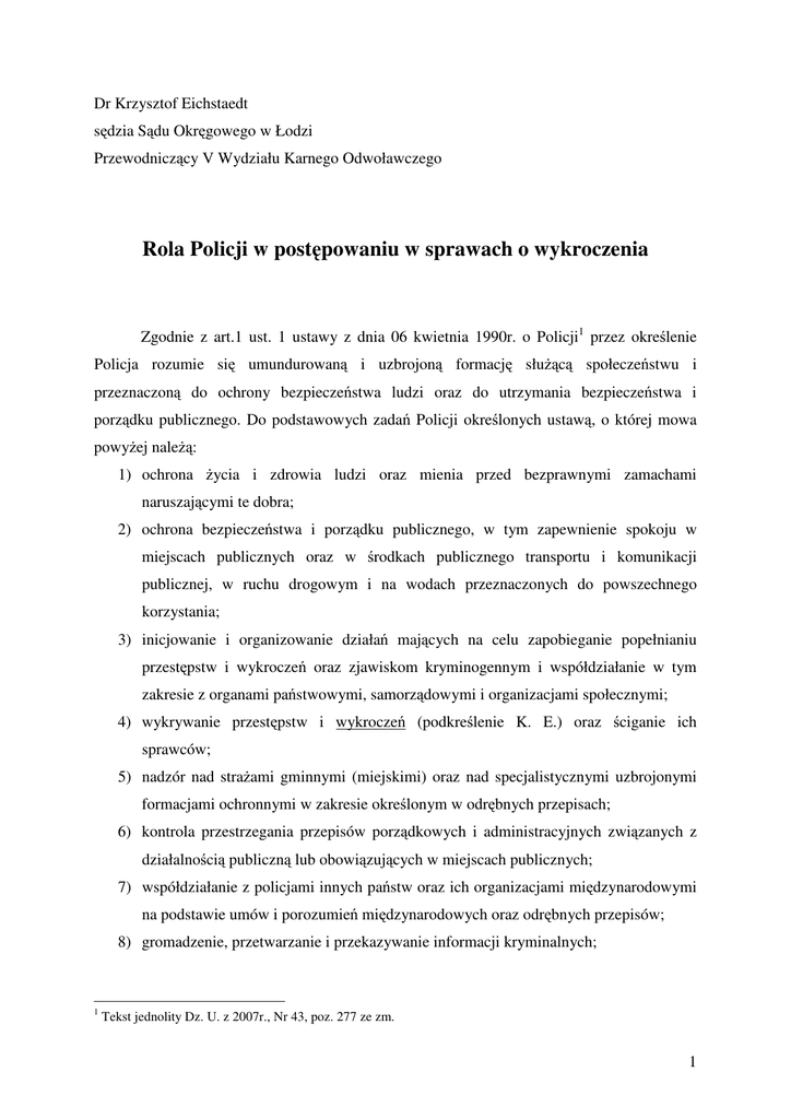 Dr Krzysztof Eichstaedt sędzia Sądu Okręgowego w Łodzi Przewodniczący V Wydziału Karnego Odwoławczego Rola Policji w postępowaniu w sprawach o wykroczenia Zgodnie z art.1 ust. 1 ustawy z dnia 06 kwietnia 1990r. o Policji1 przez określenie Policja rozumie się umundurowaną i uzbrojoną formację służącą społeczeństwu i przeznaczoną do ochrony bezpieczeństwa ludzi oraz do utrzymania bezpieczeństwa i porządku publicznego. Do podstawowych zadań Policji określonych ustawą, o której mowa powyżej należą: 1) ochrona życia i zdrowia ludzi oraz mienia przed bezprawnymi zamachami naruszającymi te dobra; 2) ochrona bezpieczeństwa i porządku publicznego, w tym zapewnienie spokoju w miejscach publicznych oraz w środkach publicznego transportu i komunikacji publicznej, w ruchu drogowym i na wodach przeznaczonych do powszechnego korzystania; 3) inicjowanie i organizowanie działań mających na celu zapobieganie popełnianiu przestępstw i wykroczeń oraz zjawiskom kryminogennym i współdziałanie w tym zakresie z organami państwowymi, samorządowymi i organizacjami społecznymi; 4) wykrywanie przestępstw i wykroczeń (podkreślenie K. E.) oraz ściganie ich sprawców; 5) nadzór nad strażami gminnymi (miejskimi) oraz nad specjalistycznymi uzbrojonymi formacjami ochronnymi w zakresie określonym w odrębnych przepisach; 6) kontrola przestrzegania przepisów porządkowych i administracyjnych związanych z działalnością publiczną lub obowiązujących w miejscach publicznych; 7) współdziałanie z policjami innych państw oraz ich organizacjami międzynarodowymi na podstawie umów i porozumień międzynarodowych oraz odrębnych przepisów; 8) gromadzenie, przetwarzanie i przekazywanie informacji kryminalnych; 1 Tekst jednolity Dz. U. z 2007r., Nr 43, poz. 277 ze zm. 1 9) prowadzenie bazy danych zawierającej informacje o wynikach analizy kwasu dezoksyrybonukleinowego (DNA); 10) realizacja zadań wynikających z umów i porozumień międzynarodowych, na zasadach i w zakresie w nich określonych (art.1 ust. 2 ustawy z dnia 06 kwietnia 1990r. o Policji). Szeroki zakres zadań, jaki powierzony został do realizacji Policji, wskazuje na dużą rolę, jaką ma ona do odegrania w procesie stosowania prawa, w tym przede wszystkim znacząca jest rola Policji w postępowaniu w sprawach o wykroczenia. Zarówno bowiem z ustawy o Policji, jak i Kodeksu postępowania w sprawach o wykroczenia w sposób jednoznaczny wynika, iż to Policja jest podstawowym organem ścigania wykroczeń. Chociaż z ustawy z dnia 06 kwietnia 1990r. o Policji w sposób jednoznaczny wynika, iż główną rolą Policji w zakresie dotyczącym wykroczeń jest przede wszystkim ich wykrywanie oraz ściganie ich sprawców, to jednak lektura ustawy z dnia 24 sierpnia 2001r. Kodeks postępowania w sprawach o wykroczenia2 wskazuje na szeroki wachlarz uprawnień, jakie posiada Policja w postępowaniu w sprawach o wykroczenia. Przede wszystkim należy do nich zaliczyć: 1) prawo do sygnalizacji, a mianowicie w razie stwierdzenia w toku postępowania istotnego uchybienia w czynnościach instytucji państwowej, samorządowej lub społecznej, sprzyjającego naruszeniom prawa, sąd, a w toku czynności wyjaśniających organ je prowadzący, a zatem także Policja, zawiadamia o stwierdzonym uchybieniu tę instytucję bądź organ powołany do sprawowania nad nią nadzoru (art.3 k.p.w.); 2) Policja w zakresie postępowania w sprawach o wykroczenia wykonuje nie tylko polecenia sądu, ale przede wszystkim w granicach określonych w ustawie prowadzi czynności wyjaśniające (art. 7 k.p.w., zobacz także art.54§1 k.p.w.); 3) wykonanie obowiązków wynikających z odpowiedniego stosowania przepisów art.20 k.p.k. oraz art.23 k.p.k. (zobacz: art. 8 k.p.w.); 4) wykonywanie uprawnień i obowiązku oskarżyciela publicznego, w tym także prawo do udziału zarówno w postępowaniu przed sądem pierwszej jak i drugiej instancji oraz składanie środków odwoławczych od orzeczeń zapadłych w pierwszej instancji (art.17§1 k.p.w., zobacz także art. 72§2 k.p.w. – dotyczący odczytania wniosku o ukaranie na rozprawie przez oskarżyciela publicznego oraz art.106§1 k.p.w. – dotyczy udziału stron w posiedzeniu sądu odwoławczego); 2 Dz. U. z 2001r., Nr 106, poz. 1148 ze zm. 2 5) prawo do przeprowadzenia przeszukania bez wcześniejszego postanowienia sądu lub prokuratora, ale tylko w wypadkach niecierpiących zwłoki (art.44§4 k.p.w.);3 6) prawo do zatrzymania osoby ujętej na gorącym uczynku popełnienia wykroczenia lub bezpośrednio potem, ale tylko w przypadku spełnienia prawem przewidzianych warunków (art. 45§1 k.p.w.); 7) prawo do dokonania tymczasowego zajęcia przedmiotów podlegających przepadkowi celem ich zabezpieczenia (art.48§1 k.p.w.); 8) Policja o ile tylko prowadzi czynności wyjaśniające, może nałożyć karę porządkową wobec świadka, biegłego, tłumacza lub specjalisty, który bez usprawiedliwienia nie stawił się na wezwanie uprawnionego organu lub bez zezwolenia tego organu samowolnie wydalił się z miejsca czynności przed jej zakończeniem albo bezpodstawnie odmówił złożenia zeznań, wykonania czynności biegłego, tłumacza lub specjalisty (art.51§1 k.p.w.); 9) wnioskowanie do sądu właściwego do rozpoznanie sprawy o zarządzenie przymusowego doprowadzenia świadka (art.51§1 k.p.w.); 10) ustalanie miejsca pobytu osoby podejrzanej o popełnienie wykroczenia (art. 53 k.p.w.); 11) rozpoznawanie przez organ nadrzędny zażaleń na niewniesienie wniosku o ukaranie (art.56 a k.p.w.); 12) sporządzanie wniosku o ukaranie (art. 57§1 k.p.w., zobacz także art.58§1 k.p.w. – dotyczy wniosku o skazanie bez rozprawy); 13) prowadzenie postępowania mandatowego (art. 95§1 k.p.w.); 14) złożenie wniosku o wznowienie postępowania (art.113§1 k.p.w.w zw. z art.542§1 k.p.k.). Mając powyższe na uwadze należy stwierdzić, iż Policja w sprawach o wykroczenia pełni następujące funkcje: 1