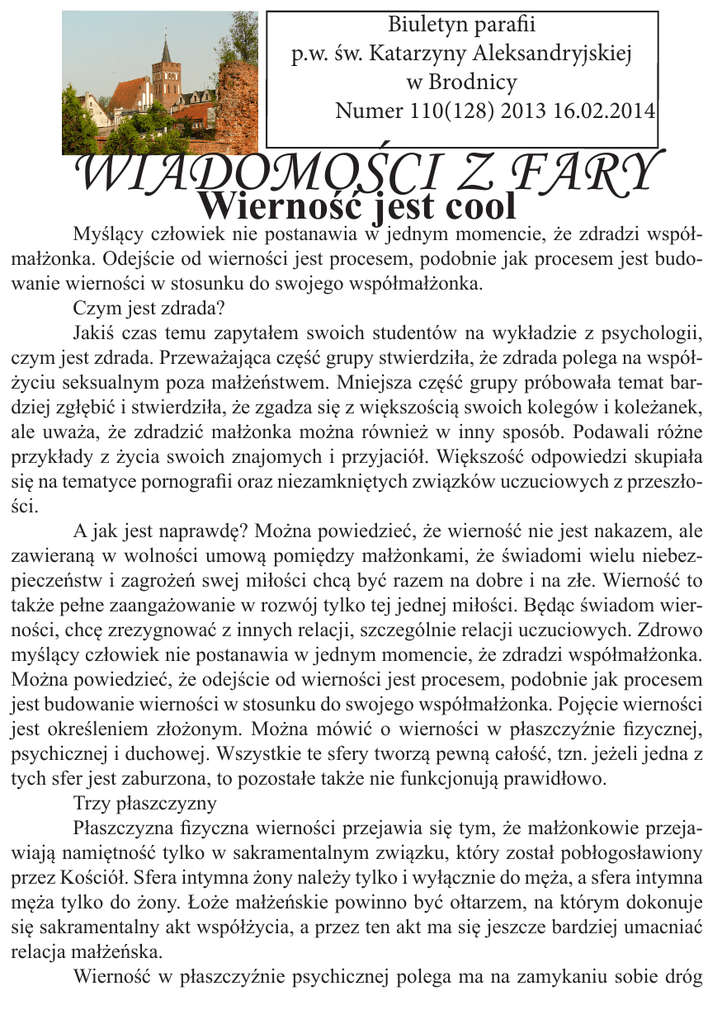 Biuletyn parafii p.w. św. Katarzyny Aleksandryjskiej w Brodnicy Numer 110(128) 2013 16.02.2014 WIADOMOŚCI Z FARY Wierność jest cool Myślący człowiek nie postanawia w jednym momencie, że zdradzi współmałżonka. Odejście od wierności jest procesem, podobnie jak procesem jest budowanie wierności w stosunku do swojego współmałżonka. Czym jest zdrada? Jakiś czas temu zapytałem swoich studentów na wykładzie z psychologii, czym jest zdrada. Przeważająca część grupy stwierdziła, że zdrada polega na współżyciu seksualnym poza małżeństwem. Mniejsza część grupy próbowała temat bardziej zgłębić i stwierdziła, że zgadza się z większością swoich kolegów i koleżanek, ale uważa, że zdradzić małżonka można również w inny sposób. Podawali różne przykłady z życia swoich znajomych i przyjaciół. Większość odpowiedzi skupiała się na tematyce pornografii oraz niezamkniętych związków uczuciowych z przeszłości. A jak jest naprawdę? Można powiedzieć, że wierność nie jest nakazem, ale zawieraną w wolności umową pomiędzy małżonkami, że świadomi wielu niebezpieczeństw i zagrożeń swej miłości chcą być razem na dobre i na złe. Wierność to także pełne zaangażowanie w rozwój tylko tej jednej miłości. Będąc świadom wierności, chcę zrezygnować z innych relacji, szczególnie relacji uczuciowych. Zdrowo myślący człowiek nie postanawia w jednym momencie, że zdradzi współmałżonka. Można powiedzieć, że odejście od wierności jest procesem, podobnie jak procesem jest budowanie wierności w stosunku do swojego współmałżonka. Pojęcie wierności jest określeniem złożonym. Można mówić o wierności w płaszczyźnie fizycznej, psychicznej i duchowej. Wszystkie te sfery tworzą pewną całość, tzn. jeżeli jedna z tych sfer jest zaburzona, to pozostałe także nie funkcjonują prawidłowo. Trzy płaszczyzny Płaszczyzna fizyczna wierności przejawia się tym, że małżonkowie przejawiają namiętność tylko w sakramentalnym związku, który został pobłogosławiony przez Kościół. Sfera intymna żony należy tylko i wyłącznie do męża, a sfera intymna męża tylko do żony. Łoże małżeńskie powinno być ołtarzem, na którym dokonuje się sakramentalny akt współżycia, a przez ten akt ma się jeszcze bardziej umacniać relacja małżeńska. Wierność w płaszczyźnie psychicznej polega ma na zamykaniu sobie dróg do wszystkiego, co może zapanować nad myślami, które powinny koncentrować się przede wszystkim na współmałżonku. Dlatego bardzo destrukcyjnie na tę płaszczyznę oddziałuje pornografia, która sprowadza drugą osobę do roli przedmiotu. Osoba korzystająca z pornografii pomału traci zdolność patrzenia w sposób racjonalny na swojego małżonka. Często sprowadza małżonka do roli narzędzia, które ma służyć tylko i wyłącznie do zaspokajania pożądliwości ciała. I ostatnia płaszczyzna wierności to płaszczyzna duchowa. Wierność duchowa to oddanie się współmałżonkowi całkowicie. Można powiedzieć, że ta płaszczyzna wierności jest najtrudniejsza do wypełnienia, gdyż wymaga działania wbrew nierzadko nieuporządkowanym emocjom i uczuciom. Aby lepiej wytłumaczyć wierność w aspekcie duchowym, posłużę się przykładem. Otóż jakiś czas temu spotkałem mężczyznę, który mówił mi o problemach w relacji ze swoją żoną. Wszystko zaczęło się psuć w jego małżeństwie, od kiedy żona zaczęła kilka razy dziennie rozmawiać ze swoją matką. Teściowa mojego rozmówcy daje swojej córce wciąż nowe rady, jak żyć w małżeństwie, które nie do końca są akceptowane przez męża owej młodej kobiety. Niezwykle ważne jest, aby być wiernym swojemu współmałżonkowi w sferze duchowej. Bóg i małżonek powinni być centrum życia nawet wtedy, gdy kochający rodzice mają inne plany na życie swojej córki czy swojego syna. Płaszczyzna duchowa wierności to także praca nad swoją afektywnością względem innych osób, które stają się ważniejsze od małżonka – także swojego dziecka. Odejście od wierności jest procesem długotrwałym. Kryzys? Zdrada małżeńska bywa wyrazem kryzysu, który miał miejsce już od jakiegoś czasu. Nierzadko wyjście na jaw zdrady staje się szczytowym momentem tego kryzysu, sytuacją, w której małżeństwo musi stawić czoło trudnościom, które przez wiele lat odkładali na późniejszy czas. Niewierność w małżeństwie potrafi zniszczyć całą rodzinę. Jedynym sposobem zachowania wierności jest kryształowa uczciwość w małżeństwie. Aby umocnić wierność w małżeństwie, warto mówić swojemu małżonkowi o swoim wewnętrznym nieidealnym świecie. Małżonkowie, którzy rozmawiają ze sobą szczerze, przejawiają w tym wierność małżeńską, gdyż wierność jest prawdą, a przeciwieństwo wierności, czyli zdrada, jest kłamstwem. Ludzie, którzy budują na kłamstwie, na zakładaniu masek, nie mogą komfortowo czuć się w relacji, szczególnie w relacji małżeńskiej trwającej aż do śmierci. Praca nad sobą, unikanie sytuacji, które mogą powodować zachwianie wierności w małżeństwie, są oprócz szczerej rozmowy podstawowymi narzędziami mogącymi zapewnić małżeństwu jedność. Budowanie na Chrystusie Niezwykle istotne w małżeństwie, szczególnie w małżeństwie chrześcijańskim, jest budowanie relacji na Ewangelii. Obraz Chrystusa do końca wiernemu swojemu Ojcu jest najlepszym przykładem dla ludzi, którzy przejawiają trudności w aspekcie wierności. Aby być sobie wiernym, warto o tę wierność prosić Boga we wspólnej modlitwie małżeńskiej. Wspólna modlitwa jest miejscem spotkania małżonków nie tylko z sobą nawzajem, ale także z Bogiem. Szczera modlitwa potrafi ze słabych ludzi uczynić mocnych, z ludzi niewiernych uczynić oddanych, a miłość ludzką – często niedoskonałą i pełną afektów przemienić na wzór mi
