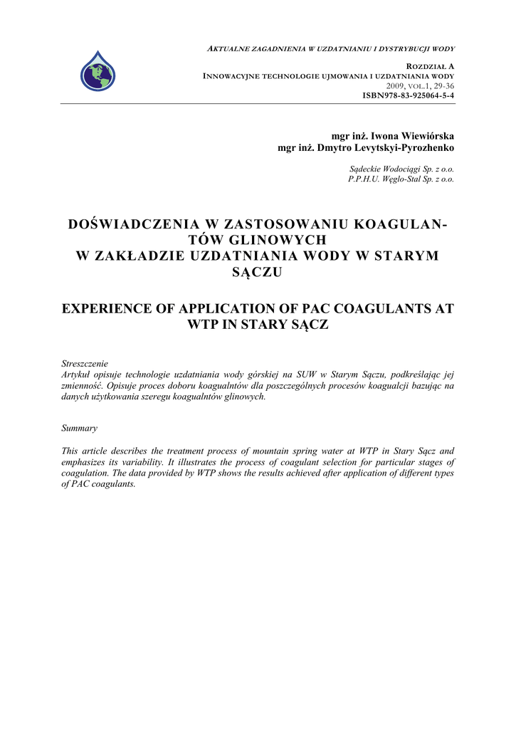 AKTUALNE ZAGADNIENIA W UZDATNIANIU I DYSTRYBUCJI WODY R OZDZIAŁ A I NNOWACYJNE TECHNOLOGIE UJMOWANIA I UZDATNIANIA WODY 2009, VOL .1, 29-36 ISBN978-83-925064-5-4 mgr inż. Iwona Wiewiórska mgr inż. Dmytro Levytskyi-Pyrozhenko Sądeckie Wodociągi Sp. z o.o. P.P.H.U. Węglo-Stal Sp. z o.o. DOŚWIADCZENIA W ZASTOSOWANIU KOAGULANTÓW GLINOWYCH W ZAKŁADZIE UZDATNIANIA WODY W STARYM SĄCZU EXPERIENCE OF APPLICATION OF PAC COAGULANTS AT WTP IN STARY SĄCZ Streszczenie Artykuł opisuje technologie uzdatniania wody górskiej na SUW w Starym Sączu, podkreślając jej zmienność. Opisuje proces doboru koagualntów dla poszczególnych procesów koagualcji bazując na danych użytkowania szeregu koagualntów glinowych. Summary This article describes the treatment process of mountain spring water at WTP in Stary Sącz and emphasizes its variability. It illustrates the process of coagulant selection for particular stages of coagulation. The data provided by WTP shows the results achieved after application of different types of PAC coagulants. 2 Iwona Wiewiórska, Dmytro Levytskyi-Pyrozhenko Aktualne zagadnienia w uzdatnianiu i dystrybucji wody 1. Wstęp Rzeki górskie na terenie Polski narażone są na stały dopływ zanieczyszczeń i szybką zmianę parametrów fizyczno-chemicznych takich jak zawiesina, mętność i barwa wody. Konieczność poprawy jakości wody do spożycia, wynikającej z zaostrzających się przepisów prawnych unijnych i krajowych powodują, że przedsiębiorstwa wodociągowe poszukują rozwiązań, dających gwarancję bezpieczeństwa jakościowego i ilościowego wody, przy równoczesnej optymalizacji kosztów. Dlatego też aby woda przeznaczona do spożycia przez ludzi spełniała wymagania Rozporządzeni Ministra Zdrowia [1], musi być poddawana odpowiednim procesom uzdatniania. Jednym ze sposobów usuwania zanieczyszczeń z wody zastosowanym w Zakładzie Uzdatniania Wody w Starym Sączu jest proces koagulacji. Koagulacja w przeciągu całej historii rozwoju metodyki uzdatniania wody odgrywa główną rolę w redukcji podstawowych parametrów zanieczyszczeń. Ważnym aspektem technologicznym procesu jest odpowiedni dobór koagulantu. Dlatego na skalę laboratoryjną i procesową prowadzone są badania zależności pomiędzy składem chemicznym ujmowanej wody a rodzajem oraz dawką koagulantu, która dla każdego ujęcia jest unikatowa. 2. Cel i zakres pracy Celem artykułu jest zaprezentowanie procesu doboru punktów dozowania, rodzajów koagulantów i ich dawek dla ZUW w Starym Sączu oraz zaprezentowanie zaawansowanych rozwiązań technologicznych uzdatniania rzek górskich. 3. Charakterystyka procesu uzdatniania wody Zakład Uzdatniania Wody w Starym Sączu zaopatruje w wodę ludność aglomeracji Nowego i Starego Sącza. Maksymalna wydajność stacji to 14 000 m3/dobę. Woda na potrzeby stacji pobierana jest z rzeki Dunajec i studni infiltracyjnych. Za pomocą ujęcia dennego infiltracyjnego woda powierzchniowa z rzeki doprowadzana jest do dwóch komór zbiorczych. Skąd jej część (maksymalnie 190m3/h) trafia do pierwszego ciągu technologicznego infiltracji w gruncie złożonego z trzech zespołów basenów infiltracyjnych i 15 szt. studni infiltracyjnych. Pozostała część wody (max 500 m 3/h) poddawana jest najpierw koagulacji objętościowej w dwóch osadnikach pionowych z sedymentacją na płytach Lamella o czasie zatrzymania 1-3 godzin. Koagulacja objętościowa pozwala w znacznym stopniu zredukować wartości mętności przed następnym stopniem filtracji, czyli koagulacją kontaktową na dziesięciu filtrach pośpiesznych ze złożem piaskowo-antracytowym (czas kontaktu 20-40 minut). W trakcie pracy filtrów powstają wody popłuczne, które oczyszczane są na separatorze Lamella i zawracane z powrotem do układu technologicznego. Po oczyszczeniu na filtrach piaskowych, woda poddawana jest procesowi ozonowania, filtracji w ośmiu filtrach ciśnieniowych ze złożem z węgla aktywnego, dezynfekcji lampami UV i chlorem gazowym. Doświadczenia w zastosowaniu koagualntów glinowych w ZUW Stray Sącz 3 Rozdział A Rys 1. Schemat technologiczny Zakładu Uzdatniania Wody w Starym Sączu. Fig 1. A flow diagram of WTP in Stary Sącz. 3. Zmienność jakości wody surowej kierowanej do zakładu uzdatniania Wody rzeki Dunajec charakteryzują się dużą zmiennością parametrów fizycznochemicznych oraz bakteriologicznych. Skład fizyczno-chemiczny rzeki kształtują głównie warunki atmosferyczne oraz spływy powierzchniowe potoków górskich oraz rzek. Nagłe, krótkotrwałe podwyższone wartości parametrów: mętności, barwy, pH, absorbancji przy długości fali 254 nm, obserwować można w porze wiosenno-letniej, w trakcie roztopów, w okresie burz i nagłych wezbrań potoków. O zanieczyszczeniu bakteriologicznym wód Dunajca decyduje liczba bakterii grupy coli oraz coli typu fekalnego. Zanieczyszczenia te dostają się do rzeki wraz ze ściekami bytowo-gospodarczymi. Parametry graniczne oraz średnie wody w poszczególnych etapach procesu uzdatniania przedstawiono w tabelach 2-4. 4. Zastosowane koagulanty W Zakładzie Uzdatniania Wody aż do roku 2002 do koagulacji stosowano siarczan glinu w postaci stałej, którego dozowanie stwarzało problemy natury eksploatacyjnej (utrudnione przygotowanie roztworu) jak i technologicznej (dostateczny efekt uzdatniania wody obserwowany w okresach wyższych temperatur). Od roku 2003 do 2009, proces koagulacji prowadzono za pomocą koagulantu PAX XL 3. 4 Iwona Wiewiórska, Dmytro Levytskyi-Pyrozhenko Aktualne zagadnienia w uzdatnianiu i dystrybucji wody W 2010 roku, po bardzo suchym lecie koagulant PAX XL 3 zastąpiono koagulantem PAX XL 19F. Ostatecznie od 2012 roku, po kilku powodziach, wiosennych falach roztopowych, gwałtownych burzach, latach suchych i bardzo mokrych, Sądeckie Wodociągi wypracowały system dawkowania dwóch koagulantów: PAX XL 19F i PAX XL 10. Tabela 1. Charakterystyka fizyczno-chemiczna zastosow