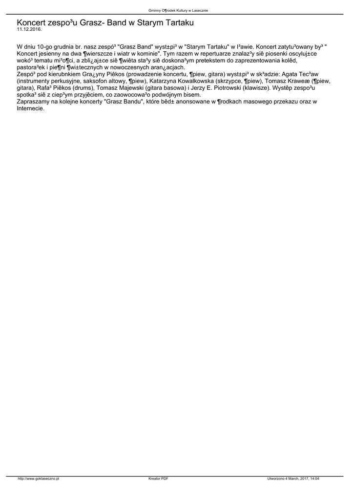 Gminny O¶rodek Kultury w Lasecznie Koncert zespo³u Grasz- Band w Starym Tartaku 11.12.2016. W dniu 10-go grudnia br. nasz zespó³ "Grasz Band" wyst±pi³ w "Starym Tartaku" w I³awie. Koncert zatytu³owany by³ " Koncert jesienny na dwa ¶wierszcze i wiatr w kominie". Tym razem w repertuarze znalaz³y siê piosenki oscyluj±ce wokó³ tematu mi³o¶ci, a zbli¿aj±ce siê ¶wiêta sta³y siê doskona³ym pretekstem do zaprezentowania kolêd, pastora³ek i pie¶ni ¶wi±tecznych w nowoczesnych aran¿acjach. Zespó³ pod kierubnkiem Gra¿yny Piêkos (prowadzenie koncertu, ¶piew, gitara) wyst±pi³ w sk³adzie: Agata Tec³aw (instrumenty perkusyjne, saksofon altowy, ¶piew), Katarzyna Kowalkowska (skrzypce, ¶piew), Tomasz Kraweæ (¶piew, gitara), Rafa³ Piêkos (drums), Tomasz Majewski (gitara basowa) i Jerzy E. Piotrowski (klawisze). Wystêp zespo³u spotka³ siê z ciep³ym przyjêciem, co zaowocowa³o podwójnym bisem. Zapraszamy na kolejne koncerty "Grasz Bandu", które bêd± anonsowane w ¶rodkach masowego przekazu oraz w Internecie. http://www.goklaseczno.pl Kreator PDF Utworzono 4 March, 2017, 14:04