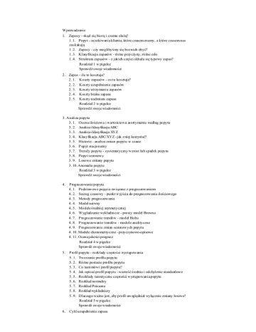 Wprowadzenie 1. Zapasy - skąd się biorą i czemu słuŜą? 1. 1. Popyt - oczekiwania klienta, które czasem znamy, a które czasem nas zaskakują 1. 2. Zapasy - czy moglibyśmy się bez nich obyć? 1. 3. Klasyfikacja zapasów - róŜne przyczyny, róŜne cele 1. 4. Struktura zapasów - z jakich części składa się typowy zapas? Rozdział 1 w pigułce Sprawdź swoje wiadomości 2. Zapas - ile to kosztuje? 2. 1. Koszty zapasów - co tu kosztuje? 2. 2. Koszty uzupełniania zapasów 2. 3. Koszty utrzymania zapasów 2. 4. Koszty braku zapasu 2. 5. Koszty nadmiaru zapasu Rozdział 2 w pigułce Sprawdź swoje wiadomości 3. Analiza popytu 3. 1. Ocena ilościowa i wartościowa asortymentu według popytu 3. 2. Analiza i klasyfikacja ABC 3. 3. Analiza i klasyfikacja XYZ 3. 4. Klasyfikacja ABC/XYZ - jak z niej korzystać? 3. 5. Historia - analiza zmian popytu w czasie 3. 6. P opyt stacjonarny 3. 7. Trendy popytu - systematyczny wzrost lub spadek popytu 3. 8. Popyt sezonowy 3. 9. Losowe zmiany popytu 3. 10. Anomalie popytu Rozdział 3 w pigułce Sprawdź swoje wiadomości 4. P rognozowanie popytu 4. 1. Podstawowe pojęcia związane z prognozowaniem 4. 2. Szereg czasowy - punkt wyjścia do prognozowania ilościowego 4. 3. Metody prognozowania 4. 4. Model naiwny 4. 5. Modele średniej arytmetycznej 4. 6. Wygładzanie wykładnicze - prosty model Browna 4. 7. P rognozowanie trendów - model Holta 4. 8. P rognozowanie trendów - modele analityczne 4. 9. P rognozowanie zmian sezonowych popytu 4. 10. Modele ekonometryczne - przyczynowo-opisowe 4. 11. Ocena jakości prognoz Rozdział 4 w pigułce Sprawdź swoje wiadomości 5. P rofil popytu - rozkłady częstości występowania 5. 1. Tworzenie profilu popytu 5. 2. RóŜne postacie profilu popytu 5. 3. Co nam mówi profil popytu? 5. 4. Jak opisać profil popytu - wartość średnia i odchylenie standardowe 5. 5. Rozkłady teoretyczne częstości występowania popytu 5. 6. Rozkład normalny 5. 7. Rozkład Poissona 5. 8. Rozkład wykładniczy 5. 9. Dlaczego waŜne jest, aby profil uwzględniał wyłącznie zmiany losowe? Rozdział 5 w pigułce Sprawdź swoje wiadomości 6. Cykl uzupełnienia zapasu 6. 1. Jeszcze raz o rozkładzie częstości występowania popytu i o tym, co niego wynika 6. 2. Cykl uzupełnienia zapasu 6. 3. Popyt w cyklu uzupełnienia zapasu Rozdział 6 w pigułce Sprawdź swoje wiadomości 7. Zapas zabezpieczający - klucz do zapewnienia wymaganego poziomu obsługi 7. 1. Poziom obsługi klienta - punkt wyjścia do określania zapasu zabezpieczającego 7. 2. Poziom obsługi klienta - jako prawdopodobieństwo niewystąpienia braku w zapasie 7. 3. Poziom obsługi klienta -jako stopień ilościowej realizacji zamówień 7. 4. Zapas zabezpieczający - od czego zaleŜy i jak go obliczać? 7. 5. Ile powinien wynosić poziom obsługi? Na jakim poziomie ustalić zapas zabezpieczający? 7. 6. Jak moŜna zmniejszać poziom zapasu zabezpieczającego? Rozdział 7 w pigułce Sprawdź swoje wiadomości 8. Zapas cykliczny - niech to nie kosztuje zbyt wiele 8. 1. Jeszcze raz o tym, skąd się bierze zapas cykliczny 8. 2. Kryteria i metody określania wielkości dostaw 8. 3. Ekonomiczna wielkość zamówienia 8. 4. Czy i jak moŜna modyfikować ekonomiczną wielkość dostawy? Rozdział 8 w pigułce Sprawdź swoje wiadomości 9. Odnawianie zapasów w systemie opartym na poziomie informacyjnym 9. 1. P rzypadek najprostszy, choć nierealny - stały popyt i stały czas cyklu uzupełnienia 9. 2. Zmienność popytu - jak to wpływa na realizację uzupełniania zapasu 9. 3. Co zrobić, gdy nie ma moŜliwości składania zamówień w dowolnym momencie? 9. 4. Zapas wolny - jak poprawnie obliczać zapas porównywany z zapasem informacyjnym 9. 5. Poziom informacyjny zapasu w przypadku zmienności czasu cyklu uzupełnienia zapasu 9. 6. Wielkość zamówienia w systemie opartym na poziomie informacyjnym Rozdział 9 w pigułce Sprawdź swoje wiadomości 10. Odnawianie zapasów w systemie opartym na przeglądzie okresowym 10. 1. Główne załoŜenia systemu 10. 2. Związek pomiędzy parametrem ZMAX a poziomem obsługi 10. 3. Wpływ czasu cyklu przeglądu na zapas zabezpieczający i zapas cykliczny 10. 4. Ustalanie optymalnego czasu cyklu przeglądu zapasu Rozdział 10 w pigułce Sprawdź swoje wiadomości 11. Inne systemy odnawiania zapasu 11. 1. Dlaczego nie wystarczą dwa podstawowe systemy? 11. 2. P arametry opisujące systemy odnawiania zapasów 11. 3. SystemMIN-МАХ 11. 4. System okresowego przeglądu zapasów z określonym poziomem informacyjnym i stałymi wielkościami dostaw 11. 5. System okresowego przeglądu zapasów z określonym poziomem informacyjnym oraz maksymalnym i zmiennymi wielkościami dostaw 11. 6. System dwóch skrzynek jako szczególny sposób odnawiania zapasu w oparciu o poziom informacyjny 11. 7. Odnawianie zapasów pozycji wolno rotujących Rozdział 11 w pigułce Sprawdź swoje wiadomości 12. Zapas zabezpieczający w przypadku rozproszenia zapasu 12. 1. Odchylenie standardowe popytu w wielu miejscach obsługi 12. 2. P rawo pierwiastka kwadratowego 12. 3. Zapas zabezpieczający w przypadku rozproszenia zapasu 12. 4. Czy rozpraszanie lub centralizacja zapasu ma wpływ na zapas cykliczny? Rozdział 12 w pigułce Sprawdź swoje wiadomości 13. Zarządzanie zapasami grup pozycji asortymentowych 13. 1. Grupowanie zamówień 13. 2. Analiza pokrycia - sposób na minimalizację kosztów utrzymania zapasu grupy pozycji asortymentowych Rozdział 13 w pigułce Sprawdź swoje wiadomości 14. O kontroli zapasów i o systemach zarządzania nimi 14. 1. Pomiar zapasu -jak zmierzyć, ile go mamy 14. 2. Odpowiedzialność za zapasy w przedsiębiorstwie 14. 3. RóŜne strategie i koncepcje logistyczne nakierowane na redukcję zapasów Rozdział 14 w pigułce Sprawdź swoje wiadomości Literatura pomocnica Tablice pomocnicze Wyniki zadań rachunkowych