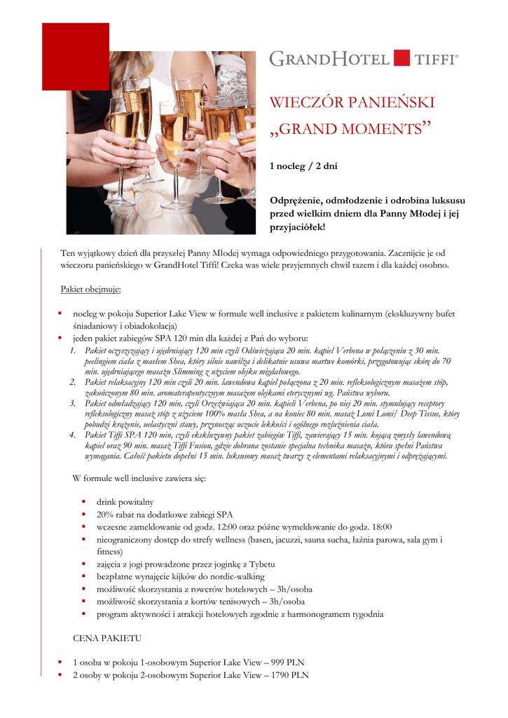 WIECZÓR PANIEŃSKI „GRAND MOMENTS” 1 nocleg / 2 dni Odprężenie, odmłodzenie i odrobina luksusu przed wielkim dniem dla Panny Młodej i jej przyjaciółek! Ten wyjątkowy dzień dla przyszłej Panny Młodej wymaga odpowiedniego przygotowania. Zacznijcie je od wieczoru panieńskiego w GrandHotel Tiffi! Czeka was wiele przyjemnych chwil razem i dla każdej osobno. Pakiet obejmuje: nocleg w pokoju Superior Lake View w formule well inclusive z pakietem kulinarnym (ekskluzywny bufet śniadaniowy i obiadokolacja) jeden pakiet zabiegów SPA 120 min dla każdej z Pań do wyboru: 1. Pakiet oczyszczający i ujędrniający 120 min czyli Odświeżająca 20 min. kąpiel Verbena w połączeniu z 30 min. peelingiem ciała z masłem Shea, który silnie nawilża i delikatnie usuwa martwe komórki, przygotowując skórę do 70 min. ujędrniającego masażu Slimming z użyciem olejku migdałowego. 2. Pakiet relaksacyjny 120 min czyli 20 min. lawendowa kąpiel połączona z 20 min. refleksologicznym masażem stóp, zakończonym 80 min. aromaterapeutycznym masażem olejkami eterycznymi wg. Państwa wyboru. 3. Pakiet odmładzający 120 min, czyli Orzeźwiająca 20 min. kąpieli Verbena, po niej 20 min. stymulujący receptory refleksologiczny masaż stóp z użyciem 100% masła Shea, a na koniec 80 min. masaż Lomi Lomi/ Deep Tissue, który pobudzi krążenie, uelastyczni stawy, przynosząc uczucie lekkości i ogólnego rozluźnienia ciała. 4. Pakiet Tiffi SPA 120 min, czyli ekskluzywny pakiet zabiegów Tiffi, zawierający 15 min. kojącą zmysły lawendową kąpiel oraz 90 min. masaż Tiffi Fusion, gdzie dobrana zostanie specjalna technika masażu, która spełni Państwa wymagania. Całość pakietu dopełni 15 min. luksusowy masaż twarzy z elementami relaksacyjnymi i odprężającymi. W formule well inclusive zawiera się: drink powitalny 20% rabat na dodatkowe zabiegi SPA wczesne zameldowanie od godz. 12:00 oraz późne wymeldowanie do godz. 18:00 nieograniczony dostęp do strefy wellness (basen, jacuzzi, sauna sucha, łaźnia parowa, sala gym i fitness) zajęcia z jogi prowadzone przez joginkę z Tybetu bezpłatne wynajęcie kijków do nordic-walking możliwość skorzystania z rowerów hotelowych – 3h/osoba możliwość skorzystania z kortów tenisowych – 3h/osoba program aktywności i atrakcji hotelowych zgodnie z harmonogramem tygodnia CENA PAKIETU 1 osoba w pokoju 1-osobowym Superior Lake View – 999 PLN 2 osoby w pokoju 2-osobowym Superior Lake View – 1790 PLN