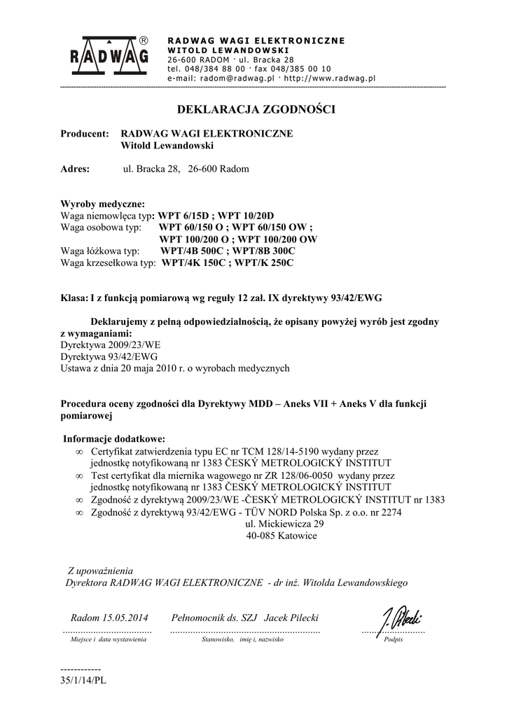 RADWAG WAGI ELEKTRONICZNE WITOLD LEWANDOWSKI 26-600 RADOM · ul. Bracka 28 tel. 048/384 88 00 · fax 048/385 00 10 e-mail: [email protected] · http://www.radwag.pl -------------------------------------------------------------------------------------------------------------------------------------------------------------------------- DEKLARACJA ZGODNOŚCI Producent: RADWAG WAGI ELEKTRONICZNE Witold Lewandowski Adres: ul. Bracka 28, 26-600 Radom Wyroby medyczne: Waga niemowlęca typ: WPT 6/15D ; WPT 10/20D Waga osobowa typ: WPT 60/150 O ; WPT 60/150 OW ; WPT 100/200 O ; WPT 100/200 OW Waga łóżkowa typ: WPT/4B 500C ; WPT/8B 300C Waga krzesełkowa typ: WPT/4K 150C ; WPT/K 250C Klasa: I z funkcją pomiarową wg reguły 12 zał. IX dyrektywy 93/42/EWG Deklarujemy z pełną odpowiedzialnością, że opisany powyżej wyrób jest zgodny z wymaganiami: Dyrektywa 2009/23/WE Dyrektywa 93/42/EWG Ustawa z dnia 20 maja 2010 r. o wyrobach medycznych Procedura oceny zgodności dla Dyrektywy MDD – Aneks VII + Aneks V dla funkcji pomiarowej Informacje dodatkowe: • Certyfikat zatwierdzenia typu EC nr TCM 128/14-5190 wydany przez jednostkę notyfikowaną nr 1383 ČESKÝ METROLOGICKÝ INSTITUT • Test certyfikat dla miernika wagowego nr ZR 128/06-0050 wydany przez jednostkę notyfikowaną nr 1383 ČESKÝ METROLOGICKÝ INSTITUT • Zgodność z dyrektywą 2009/23/WE -ČESKÝ METROLOGICKÝ INSTITUT nr 1383 • Zgodność z dyrektywą 93/42/EWG - TÜV NORD Polska Sp. z o.o. nr 2274 ul. Mickiewicza 29 40-085 Katowice Z upoważnienia Dyrektora RADWAG WAGI ELEKTRONICZNE - dr inż. Witolda Lewandowskiego Radom 15.05.2014 ................................... Miejsce i data wystawienia -----------35/1/14/PL Pełnomocnik ds. SZJ Jacek Pilecki ........................................................... Stanowisko, imię i, nazwisko ......................... Podpis