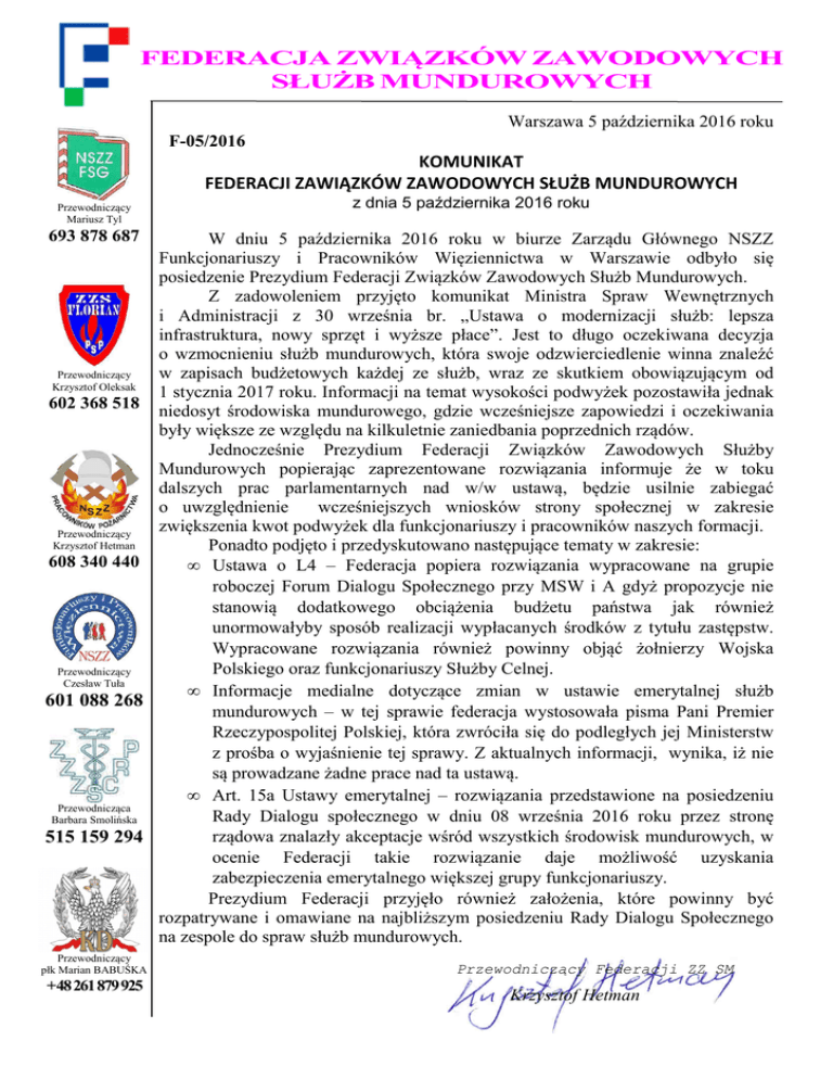 FEDERACJA ZWIĄZKÓW ZAWODOWYCH SŁUŻB MUNDUROWYCH Warszawa 5 października 2016 roku F-05/2016 KOMUNIKAT FEDERACJI ZAWIĄZKÓW ZAWODOWYCH SŁUŻB MUNDUROWYCH Przewodniczący Mariusz Tyl z dnia 5 października 2016 roku 693 878 687 W dniu 5 października 2016 roku w biurze Zarządu Głównego NSZZ Funkcjonariuszy i Pracowników Więziennictwa w Warszawie odbyło się posiedzenie Prezydium Federacji Związków Zawodowych Służb Mundurowych. Z zadowoleniem przyjęto komunikat Ministra Spraw Wewnętrznych i Administracji z 30 września br. „Ustawa o modernizacji służb: lepsza infrastruktura, nowy sprzęt i wyższe płace”. Jest to długo oczekiwana decyzja o wzmocnieniu służb mundurowych, która swoje odzwierciedlenie winna znaleźć w zapisach budżetowych każdej ze służb, wraz ze skutkiem obowiązującym od Przewodniczący Krzysztof Oleksak 1 stycznia 2017 roku. Informacji na temat wysokości podwyżek pozostawiła jednak 602 368 518 niedosyt środowiska mundurowego, gdzie wcześniejsze zapowiedzi i oczekiwania były większe ze względu na kilkuletnie zaniedbania poprzednich rządów. Jednocześnie Prezydium Federacji Związków Zawodowych Służby Mundurowych popierając zaprezentowane rozwiązania informuje że w toku dalszych prac parlamentarnych nad w/w ustawą, będzie usilnie zabiegać o uwzględnienie wcześniejszych wniosków strony społecznej w zakresie zwiększenia kwot podwyżek dla funkcjonariuszy i pracowników naszych formacji. Przewodniczący Krzysztof Hetman Ponadto podjęto i przedyskutowano następujące tematy w zakresie: 608 340 440 • Ustawa o L4 – Federacja popiera rozwiązania wypracowane na grupie roboczej Forum Dialogu Społecznego przy MSW i A gdyż propozycje nie stanowią dodatkowego obciążenia budżetu państwa jak również unormowałyby sposób realizacji wypłacanych środków z tytułu zastępstw. Wypracowane rozwiązania również powinny objąć żołnierzy Wojska Polskiego oraz funkcjonariuszy Służby Celnej. Przewodniczący Czesław Tuła • Informacje medialne dotyczące zmian w ustawie emerytalnej służb 601 088 268 mundurowych – w tej sprawie federacja wystosowała pisma Pani Premier Rzeczypospolitej Polskiej, która zwróciła się do podległych jej Ministerstw z prośba o wyjaśnienie tej sprawy. Z aktualnych informacji, wynika, iż nie są prowadzane żadne prace nad ta ustawą. • Art. 15a Ustawy emerytalnej – rozwiązania przedstawione na posiedzeniu Przewodnicząca Rady Dialogu społecznego w dniu 08 września 2016 roku przez stronę Barbara Smolińska rządowa znalazły akceptacje wśród wszystkich środowisk mundurowych, w 515 159 294 ocenie Federacji takie rozwiązanie daje możliwość uzyskania zabezpieczenia emerytalnego większej grupy funkcjonariuszy. Prezydium Federacji przyjęło również założenia, które powinny być rozpatrywane i omawiane na najbliższym posiedzeniu Rady Dialogu Społecznego na zespole do spraw służb mundurowych. Przewodniczący płk Marian BABUŚKA +48 261 879 925 Przewodniczący Federacji ZZ SM Krzysztof Hetman