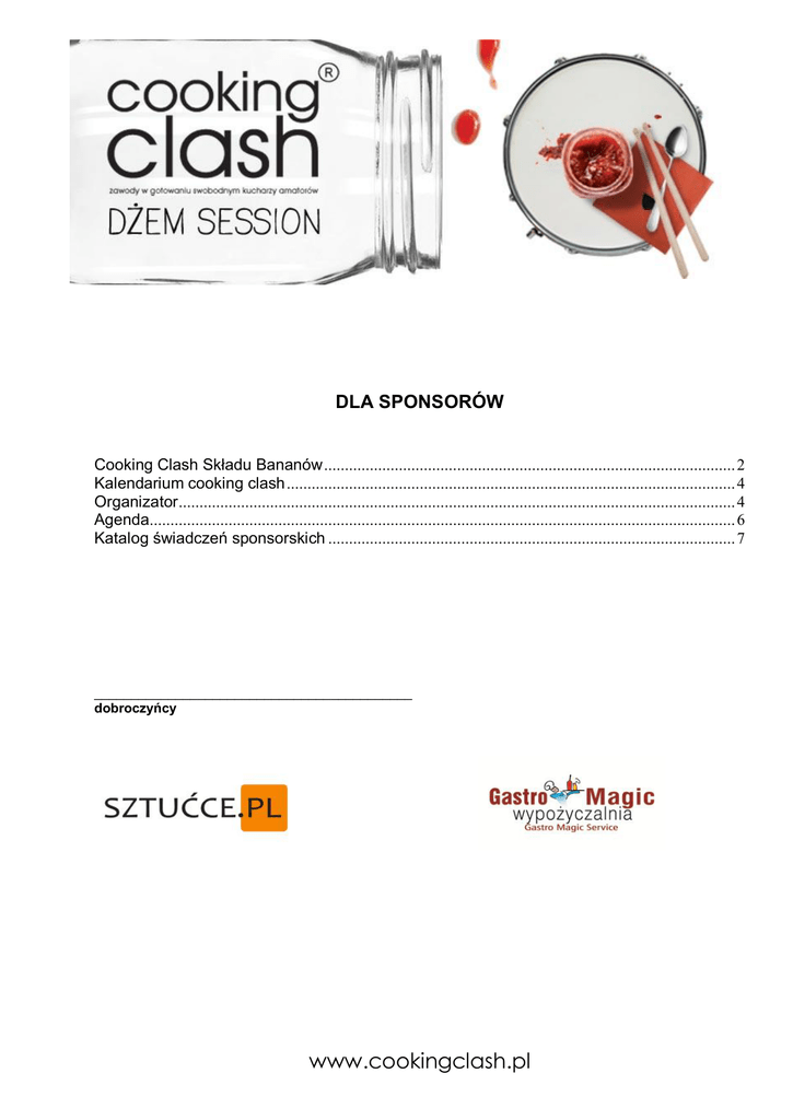 DLA SPONSORÓW Cooking Clash Składu Bananów ................................................................................................... 2 Kalendarium cooking clash ............................................................................................................ 4 Organizator ...................................................................................................................................... 4 Agenda............................................................................................................................................. 6 Katalog świadczeń sponsorskich .................................................................................................. 7 ___________________________________________ dobroczyńcy www.cookingclash.pl Cooking Clash Składu Bananów ______________________________________________________________________________________________ VII CC Składu Bananów, czyli zawody w gotowaniu swobodnym kucharzy amatorów – „Dżem Session” Już po raz siódmy zapraszamy na najzabawniejsze i pełne smacznych emocji gargantuiczne starcie kulinarne, jak zwykle w plenerze, jak zawsze z humorem. Zasady są proste – 3 drużyny gotują na Waszych oczach na zadany temat. Zgromadzona publiczność podgląda, pyta, podpowiada, kibicuje, smakuje, wreszcie decyduje o zwycięstwie. Tytułu bronić będą zwycięzcy poprzedniej edycji Catering Corps – kto rzuci im wyzwanie? Podnosimy poprzeczkę, podkręcamy temperaturę, rzucamy wyzwanie! Tym razem bardzo sezonowo, bardzo lokalnie i… bardzo muzycznie – tematem VII CC jest Dżem Session. Klucz: zawodnicy zarzucają kulinarną nutę a następnie na dany znak przekazują swoje danie kolejnej drużynie tak, aby po trzech wymianach powstało skończone danie. Bądźcie tam z nimi! Zapraszamy starych i młodych, pojedynczo i w grupach, przyjaciół i rodziny, dzieci i dziadków, wegetarian i mięsożerców, kucharzy i łasuchów, smakoszy, krytyków i kulinarnych zapaleńców – każdy znajdzie coś dla siebie. W trakcie Cooking Clash’a działać będą: Kulinarna Wioska Dziecięca, namiot pokazów i szkoleń kulinarnych, Targ spożywczy z wystawcami regionalnymi i etnicznymi, Strefa Piknikowa . 20 września,11:00-20:00 Park Szczęśliwicki na warszawskiej Ochocie. Spotkajmy się przy jedzeniu! www.cookingclash.pl www.cookingclash.pl Kalendarium cooking clash orgia smaków na trzy curry – 25.07.2009 r. Temat: Curry Indyjskie vs Tajskie vs Japońskie. Impreza dla przyjaciół, krewnych i znajomych królika. Wielki sukces w małej skali. fiesta banana – 12.09.2009 r. Po sukcesie pierwszej edycji z marszu zorganizowaliśmy drugie starcie. Tym razem jako finisaż tygodnia z Yerba Mate odbywającego się w Składzie Bananów. Pojawił się latający kredens z Yerba Mate (serwowaliśmy ponad 100 różnych gatunków), odbyła się wystawa zdjęć z podróży po Ameryce Południowej, zagrał zespół Wielbłądy. etno garden party – 29.05.2010 r. Tym razem temat związany z nowym anturażem yerbaciarni i ogródka. W zupełnie nowym otoczeniu świętowaliśmy zakończenie prac remontowych. Starciom kucharzy towarzyszyła moc atrakcji towarzyskich, wystawa prac Roberta Kowalskiego oraz koncert zespołu Long-Long. kangur strusia krokodylem pogania – 28.05.2011 r. Czwarty Cooking Clash, w którym uczestnicy musieli wykazać się kunsztem w grillowaniu mięs egzotycznych: kangura, strusia i krokodyla. Po raz pierwszy w imprezie pojawili się zewnętrzni partnerzy - firma Elkopol – dystrybutor mięs egzotycznych oraz firma Megapunkt, fundator nagród dla uczestników Cooking Clash’a. Zainteresowanie przerosło nasze oczekiwania, w Składzie Bananów było naprawdę tłoczno. buszowanie na straganie! – 29.12.2012 r. Po sukcesie poprzedniego Cooking Clash’a postanowiliśmy zmienić formułę i opuścić nasze skromne progi organizując zawody wspólnie z Ośrodkiem Kultury Ochoty w przepięknym otoczeniu Parku Szczęśliwickiego. Impreza rozrosła się o mnóstwo atrakcji towarzyszących: Targ z produktami regionalnymi etnicznymi i okołokulinarnymi, Kulinarna Wioska Dziecięca, Aleia NGO, Aleja Restauracji, Alej Szkoleń Kulinarnych, Strefa Paneli i Seminariów. Partnerami przedsięwzięcia byli Slow Fod Youth Warszawa, Lokalna Żywność. Sponsorami szkoleń Swedeponic, Snails Planet, Fabryka Robaków. Sponsorem nagród Red Onion. Uff… dużo się działo! będzie się działo! – 10.05.2014 r. VII CC odbył się w Parku Górczewska na Bemowie, to kolejne przedsięwzięcie, które organizowaliśmy z całą rzeszą partnerów - Wydziałem Zdrowia Gminy Bemowo, Ośrodkiem Kultury Art. Bem, Street Marketem. Zgodnie z nową formułą, oprócz starcia kulinarnego, działała plenerowa szkoła gotowania, najmłodsi gotowali w kulinarnej wiosce dziecięcej a zdobyte kalorie spalali na olbrzymim placu zabaw, produkty regionalne i kuchni świata można było kupić u ponad 40 wystawców Street Market’u. Na głównej scenie amfiteatru występowali artyści w ramach festiwalu frankofonia. Oczywiście były też pierwsze razy – przyjechały do nas Foood Truck’i a w Cooking Clashu przyznaliśmy nagrodę profesjonalistów. Partnerami przedsięwzięcia byli: Foodlovers, Gastro Magic, Bionaczynia; Nagrody sponsorowali Sztucce.pl oraz Bookoff. Dżem session – 20.09.2014 r. Organizator www.cookingclash.pl Skład Bananów Inicjatywa kulinarna skierowana do wszystkich tych, dla których gotowanie i jedzenie, jest pasją, sposobem na życie i chwilą wielkiej przyjemności. Od wielu lat, dla naszych przyjaciół klientów importujemy i dostarczamy delikatesy z całego świata, prowadzimy sklep i szkołę gotowania, zapraszamy na imprezy kulinarne i cooking clash’e. Nasze życie kręci się wokół jedzenia i z pasją pracujemy dla podobnych nam kulinarnie zakręconych. __________________________________________________________________________________________ W tej chwili nasza inicja
