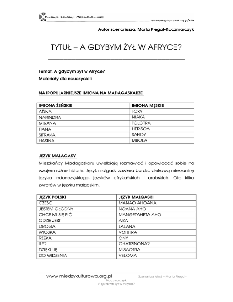 Autor scenariusza: Marta Piegat-Kaczmarczyk TYTUŁ – A GDYBYM śYŁ W AFRYCE? ___________________________________ Temat: A gdybym Ŝył w Afryce? Materiały dla nauczycieli NAJPOPULARNIEJSZE IMIONA NA MADAGASKARZE IMIONA śEŃSKIE IMIONA MĘSKIE TOKY NIAKA TOLOTRA HERISOA SAFIDY MBOLA AĎNA NARINDRA MIRANA TIANA SITRAKA HASINA JĘZYK MALAGASY Mieszkańcy Madagaskaru uwielbiają rozmawiać i opowiadać sobie na wzajem róŜne historie. Język malgaski zawiera bardzo ciekawą mieszaninę języka indonezyjskiego, języków afrykańskich i arabskich. Oto kilka zwrotów w języku malgaskim. JĘZYK POLSKI CZEŚĆ JESTEM GŁODNY CHCE MI SIĘ PIĆ GDZIE JEST DROGA WIOSKA RZEKA ILE? DZIĘKUJĘ DO WIDZENIA JĘZYK MALGASKI MANAO AHOANA NOANA AHO MANGETAHETA AHO AIZA LALANA VOHITRA ONY OHATRINONA? MISAOTRA VELOMA ________________________________________________________________________________________ www.miedzykulturowa.org.pl Kaczmarczyk A gdybym Ŝył w Afryce? Scenariusz lekcji – Marta Piegat- ZABAWY AFRYKAŃSKICH DZIECI Chowany – tak jak bawimy się w Polsce, z tym, Ŝe zamiast „1-2-3 za siebie” mówi się: „pero” lub „chirchir adebe”. Papier-kamień-noŜyczki – jest to równieŜ gra, którą znamy, z tą tylko róŜnicą, Ŝe przed wyciągnięciem dłoni przed siebie liczymy w języku malgaskim „ iray, roa, telo”, czyli 1, 2, 3. Ogon tygrysa – ustawiamy się wszyscy w „pociąg”, chwytamy osobę przed sobą za ramiona. Tak ustawiony pociąg, w afrykańskim wydaniu – tygrys, ma za zadanie złapać swój ogon – czyli pierwsze dziecko ma złapać ostatnie, oczywiście bez rozrywania pociągu/tygrysa. Skakanie na skakance – najczęściej w trójkach lub większych grupach, jeśli tylko pozwala na to długość skakanki lub liny. CYFRY W JĘZYKU MALGASKIM 1 2 3 4 IRAY ROA TELO EFATR A 5 DIMY 6 ENINA 7 FITO 8 VALO PRZYSMAKI PROSTO Z MADAGASKARU AKOHO SY VOANIO – PORCJA DLA CZTERECH OSÓB SKŁADNIKI: • 1 kurczak • 1 orzech kokosowy • 2 pomidory • 2 cebule • 2 ząbki czosnku • 20 gramów imbiru • olej, sól i pieprz ________________________________________________________________________________________ www.miedzykulturowa.org.pl Kaczmarczyk A gdybym Ŝył w Afryce? Scenariusz lekcji – Marta Piegat- 9 SIVY 10 FOLO SPOSÓB PRZYGOTOWANIA AKOHO SY VOANIO Kurczaka posolić i popieprzyć. Jednego pomidora obrać ze skórki, pokroić w plasterki i poukładać wokół kurczaka na patelni. Rozłupać orzech kokosowy. Mleko odlać do szklanki, a drobinki miąŜszu rozsypać na kurczaku i plasterkach pomidora. Wlać trochę oleju na patelnię. Kurczaka smaŜyć na średnim ogniu, aŜ mięso będzie miękkie. Dodać cebulę. PodsmaŜyć ją, aŜ się zeszkli i zbrązowieje. Dodać imbir, drugiego pomidora (równieŜ bez skórki i w plasterkach) oraz czosnek. Gotować na średnim ogniu, delikatnie mieszając. Dodać mleko kokosowe. Dobrze wymieszać. Gotować jeszcze około 30 min na małym ogniu. Podawać z ryŜem i sałatą – smacznego! CZERWONA HERBATA Z WANILIĄ – PORCJA NA JEDEN DZBANEK SKŁADNIKI • cztery łyŜeczki herbaty roibos • świeŜo starta wanilia • cukier SPOSÓB PRZYGOTOWANIA HERBATY Z MADAGASKARU Zetrzeć wanilię na tarce. Wsypać do dzbanka herbatę i wanilię. Następnie zalać wrzątkiem. Podawać z cukrem. PLONY MADAGASKARU KUKURYDZA, KAWA, TRZCINA CUKROWA, RYś, WANILIA, TYTOŃ, MANIOK I GOŹDZIKI, MANGO ________________________________________________________________________________________ www.miedzykulturowa.org.pl Kaczmarczyk A gdybym Ŝył w Afryce? Scenariusz lekcji – Marta Piegat- Zdjęcia z Madagaskaru moŜna znaleźć na stronach: http://www.freewebs.com/oonalee/madagascar/index.htm http://www.malypodroznik.pl/ - w galerii Małego podróŜnika ________________________________________________________________________________________ www.miedzykulturowa.org.pl Kaczmarczyk A gdybym Ŝył w Afryce? Scenariusz lekcji – Marta Piegat-