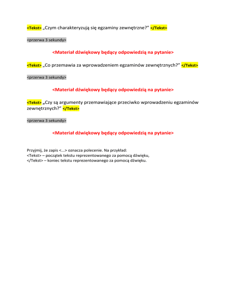 <Tekst> „Czym charakteryzują się egzaminy zewnętrzne?” </Tekst> <przerwa 3 sekundy> <Materiał dźwiękowy będący odpowiedzią na pytanie> <Tekst> „Co przemawia za wprowadzeniem egzaminów zewnętrznych?” </Tekst> <przerwa 3 sekundy> <Materiał dźwiękowy będący odpowiedzią na pytanie> <Tekst> „Czy są argumenty przemawiające przeciwko wprowadzeniu egzaminów zewnętrznych?” </Tekst> <przerwa 3 sekundy> <Materiał dźwiękowy będący odpowiedzią na pytanie> Przyjmij, że zapis <...> oznacza polecenie. Na przykład: <Tekst> – początek tekstu reprezentowanego za pomocą dźwięku, </Tekst> – koniec tekstu reprezentowanego za pomocą dźwięku.