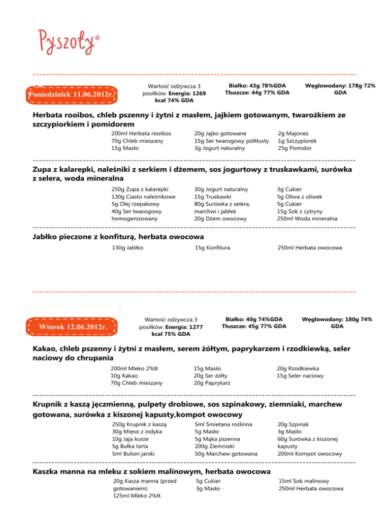 -----------------------------------------------------------------------------------------------------PO Białko: 43g 78%GDA Węglowodany: 178g 72% Wartość odżywcza 3 Tłuszcze: 44g 77% GDA GDA posiłków: Energia: 1269 Poniedziałek 11.06.2012r.` kcal 74% GDA Herbata rooibos, chleb pszenny i żytni z masłem, jajkiem gotowanym, twarożkiem ze szczypiorkiem i pomidorem 200ml Herbata rooibos 70g Chleb mieszany 15g Masło 20g Jajko gotowane 15g Ser twarogowy półtłusty 3g Jogurt naturalny 2g Majonez 1g Szczypiorek 25g Pomidor ------------------------------------------------------------------------------------------------------Zupa z kalarepki, naleśniki z serkiem i dżemem, sos jogurtowy z truskawkami, surówka z selera, woda mineralna 250g Zupa z kalarepki 130g Ciasto naleśnikowe 5g Olej rzepakowy 40g Ser twarogowy homogenizowany 30g Jogurt naturalny 15g Truskawki 80g Surówka z selera, marchwi i jabłek 20g Dżem owocowy 3g Cukier 5g Oliwa z oliwek 5g Cukier 15g Sok z cytryny 250ml Woda mineralna ------------------------------------------------------------------------------------------------------Jabłko pieczone z konfiturą, herbata owocowa, pola na miodem,bawarka 130g Jabłko 15g Konfitura 250ml Herbata owocowa ------------------------------------------------------------------------------------------------------ Wtorek 12.06.2012r. Wartość odżywcza 3 posiłków: Energia: 1277 kcal 75% GDA Białko: 40g 74%GDA Tłuszcze: 45g 77% GDA Węglowodany: 180g 74% GDA Kakao, chleb pszenny i żytni z masłem, serem żółtym, paprykarzem i rzodkiewką, seler naciowy do chrupania 200ml Mleko 2%tł. 10g Kakao 70g Chleb mieszany 15g Masło 20g Ser żółty 20g Paprykarz 20g Rzodkiewka 15g Seler naciowy ------------------------------------------------------------------------------------------------------Krupnik z kaszą jęczmienną, pulpety drobiowe, sos szpinakowy, ziemniaki, marchew gotowana, surówka z kiszonej kapusty,kompot owocowy 250g Krupnik z kaszą 30g Mięso z indyka 10g Jaja kurze 5g Bułka tarta 5ml Bulion jarski 5ml Śmietana roślinna 5g Masło 5g Mąka pszenna 200g Ziemniaki 50g Marchew gotowana 20g Szpinak 3g Masło 60g Surówka z kiszonej kapusty 200ml Kompot owocowy ------------------------------------------------------------------------------------------------------Kaszka manna na mleku z sokiem malinowym, herbata owocowa 20g Kasza manna (przed gotowaniem) 125ml Mleko 2%tł. 5g Cukier 3g Masło 15ml Sok malinowy 250ml Herbata owocowa --------------------------------------------------------------------------------------------------------------Wartość odżywcza 3 posiłków: Energia: 1257 kcal 74% GDA Środa 13.06.2012r. Białko: 37g 76%GDA Tłuszcze: 45g 77% GDA Węglowodany: 183g 72% GDA Mleko, chleb pszenny i żytni z masłem, polędwicą sopocką, ogórkiem, twarożkiem na słodko z konfiturą 200ml Mleko 2%tł. 20g Polędwica sopocka 5g Jogurt naturalny 70g Chleb mieszany 12g Masło 20g Ogórek zielony 15g Ser twarogowy półtłusty 5g Konfitura owocowa ------------------------------------------------------------------------------------------------------Krem warzywny z grzankami, gulasz pieczony, kasza jęczmienna, sos pieczeniowy, sałata z sosem winegret, buraczki gotowane, kompot owocowy 250ml Krem warzywny 15g Chleb pszenny, grzanki 35g Wieprzowina pieczona 5g Olej rzepakowy 15ml Bulion jarski 2,5g Mąka pszenna 5g Pasta pomidorowa 100g Kasza jęczmienna 50g Buraki gotowane 30g Sałata 10g Rzodkiewka 2g Oliwa z oliwek 3g Cukier 5g Sok z cytryny 200ml Kompot owocowy ------------------------------------------------------------------------------------------------------Galaretka z truskawkami, herbatniki, herbata rooibos 150g Galaretka owocowa 40g Truskawki 16g Herbatniki 250ml Herbata rooibos ------------------------------------------------------------------------------------------------------ Czwartek 14.06.2012r. Wartość odżywcza 3 posiłków: Energia: 1276 kcal 75% GDA Białko: 42g 67%GDA Tłuszcze: 44g 76% GDA Węglowodany: 182g 76% GDA Zupa mleczna z ryżem, tartym jabłkiem i rodzynkami, chleb pszenny i żytni z masłem, schabem pieczonym i pomidorem, herbata owocowa 200ml Mleko 2%tł. 50g Ryż gotowany 40g Jabłko 10g Rodzynki 35g Chleb mieszany 20g Schab pieczony 10g Masło 25g Pomidor 250ml Herbata owocowa ------------------------------------------------------------------------------------------------------Krem z buraków, zapiekanka makaronowa z kurczakiem i warzywami, marchew z groszkiem gotowana, kompot owocowy 250g Krem z buraków 120g Makaron gotowany 7g Olej rzepakowy 35g Mięso z kurczaka 10g Pasta pomidorowa 10g Śmietana roślinna 5g Masło 60g Mieszanka gotowanych warzyw 50g Marchew z groszkiem gotowana 200ml Kompot owocowy ------------------------------------------------------------------------------------------------------Budyń z wiśniami, chrupki kukurydziane, herbata ziołowa 20g Budyń 125ml Mleko 2%tł. 30g Wiśnie bez pestek 10g Cukier 2,5g Masło 20g Chrupki kukurydziane 250ml Herbata ziołowa -----------------------------------------------------------------------------------------------------PO Białko: 44g 74%GDA Węglowodany: 175g 75% Wartość odżywcza 3 Piątek 15.06.2012r. Tłuszcze: 45g 74% GDA GDA posiłków: Energia: 1275 kcal 75% GDA Kakao, bułka pszenna z masłem, pasta jajeczna ze szczypiorkiem, ser żółty, rzodkiewka, kalarepa do chrupania 200ml Mleko 2%tł. 10g Kakao 70g Bułka pszenna 20g Masło 15g Jaja gotowane 2g Majonez 2g Jogurt naturalny 1g Szczypiorek 15g Ser żółty 20g Rzodkiewka 30g Kalarepa ------------------------------------------------------------------------------------------------------Zupa pomidorowa z makaronem, rolada rybna w sosie cytrynowym, ziemniaki, surówka z marchewki, kapusta gotowana, woda mineralna 250g Zupa pomidorowa 30g Makaron gotowany 35g Mintaj, filet 5g Jaja kurze 5g Bułka tarta 200g Ziemniaki 5ml Bulion jarski 3ml Śmietana roślinna 15g Sok z cytryny 7g Masło 60g Surówka z 