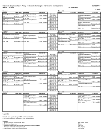 Inżynieria Bezpieczeństwa Pracy 4-letnie studia I stopnia inżynierskie niestacjonarne WIPOS SEMESTR 8 r.a. 2014/2015 14 osób 14 osób Zjazd1 Sobota 14.03.2015 Zapobieganie stratom w przed. Niedziela Transport mat.niebezp. 2/10 w 3/10 w P-204, bud.B10 Transport mat.niebezp. Analiza zagrożeń proc. 2/10 proj 2/10 w P-204, bud.B10 Seminarium dyplomowe Zapobieganie stratom w przed. 3/20 sem 3/20 ćw P-204, bud.B10 Zjazd3 Sobota 28.03.2015 Zapobieganie stratom w przed. Niedziela 15.03.2015 P-204, bud.B10 P-204, bud.B10 P-204, bud.B10 Pałacyk, bud.B4 9/20 P-204, bud.B10 Zjazd5 Sobota P-204, bud.B10 6/20 sem Niedziela Transport mat.niebezp. Analiza zagrożeń proc. 8/10 w 8/10 w P-204, bud.B10 Transport mat.niebezp. Zapobieganie stratom w przed. 8/10 proj Analiza zagrożeń proc. 15/20 ćw P-204, bud.B10 4/10 ćw Analiza zagrożeń proc. 18.04.2015 Zjazd7 Sobota 09.05.2015 Zap.stratom w przed.P-104, bud.B10 Standardy prawn.-proced. 2/5 w P-104, bud.B10 Analiza zagrożeń proc. 10/10 w P-104, bud.B10 Zapobieganie stratom w przed. 18/20 ćw P-104, bud.B10 Zjazd9 Sobota 13.06.2015 8.15-9.00 9.15-10.00 10.15-11.00 11.15-12.00 12.15-13.00 13.15-14.00 14.15-15.00 15.15-16.00 16.15-17.00 17.15-18.00 18.15-19.00 19.15-20.00 Pałacyk, bud.B4 Pałacyk, bud.B4 6/20 proj Pałacyk, bud.B4 Niedziela 10.05.2015 Analiza zagrożeń proc. 12/20 proj Seminarium dyplomowe P-204, bud.B10 12/20 sem P-204, bud.B10 Niedziela Analiza zagrożeń proc. 10/10 ćw Analiza zagrożeń proc. 14.06.2015 18/20 proj Seminarium dyplomowe P-204, bud.B10 18/20 sem P-204, bud.B10 P-204, bud.B10 6/20 ćw Niedziela 12.04.2015 Transport mat.niebezp. 6/10 w P-204, bud.B10 9/10 w P-204, bud.B10 Transport mat.niebezp. Analiza zagrożeń proc. 6/10 proj P-204, bud.B10 2/10 ćw P-204, bud.B10 Seminarium dyplomowe Analiza zagrożeń proc. 9/20 sem P-204, bud.B10 3/20 proj P-204, bud.B10 Zapobieganie stratom w przed. 12/20 25.04.2015 ćw Niedziela Transport mat.niebezp. 10/10 w Transport mat.niebezp. 10/10 proj Analiza zagrożeń proc. 6/10 ćw Analiza zagrożeń proc. 9/20 proj Zjazd8 Sobota 30.05.2015 Standardy prawn.-proced. Niedziela Pałacyk, bud.B4 26.04.2015 Pałacyk, bud.B4 Pałacyk, bud.B4 Pałacyk, bud.B4 Pałacyk, bud.B4 31.05.2015 Zapobieganie stratom w przed. P-204, bud.B10 5/5 w P-104, bud.B10 20/20 ćw Analiza zagrożeń proc. Seminarium dyplomowe 8/10 ćw P-104, bud.B10 Analiza zagrożeń proc. 15/20 sem P-204, bud.B10 Standardy prawn.-proced. 15/20 proj P-104, bud.B10 3/5 ćw P-204, bud.B10 20.06.2015 Niedziela 21.06.2015 Analiza zagrożeń proc. 20/20 proj P-204, bud.B10 Standardy prawn.-proced. 5/5 ćw P-204, bud.B10 Seminarium dyplomowe 20/20 sem P-204, bud.B10 Legenda: Pałacyk - aud. I piętro, budynek B4, ul. Wólczanska 213 P-104, P-204 audytorium - w budynku B10, ul. Wólczańska 215 Program: 1. Analiza zagrożeń procesowych (egz.) 2. Seminarium dyplomowe 3. Standardy prawno-proceduralne w przemysle procesowym (egz.) 4. Transport materiałów niebezpiecznych 5. Zapobieganie stratom w przedsiębiorstwie Pałacyk, bud.B4 Zjazd4 Sobota 11.04.2015 Zapobieganie stratom w przed. Z j a z d 10 Sobota 8.15-9.00 9.15-10.00 10.15-11.00 11.15-12.00 12.15-13.00 13.15-14.00 14.15-15.00 15.15-16.00 16.15-17.00 17.15-18.00 18.15-19.00 19.15-20.00 22.03.2015 Analiza zagrożeń proc. 4/10 w Pałacyk, bud.B4 Zapobieganie stratom w przed. 8.15-9.00 9.15-10.00 10.15-11.00 11.15-12.00 12.15-13.00 13.15-14.00 14.15-15.00 15.15-16.00 16.15-17.00 17.15-18.00 18.15-19.00 19.15-20.00 8.15-9.00 9.15-10.00 10.15-11.00 11.15-12.00 12.15-13.00 13.15-14.00 14.15-15.00 15.15-16.00 16.15-17.00 17.15-18.00 18.15-19.00 19.15-20.00 Niedziela Transport mat.niebezp. 4/10 w P-204, bud.B10 Transport mat.niebezp. 4/10 proj P-204, bud.B10 Zjazd6 Sobota 19.04.2015 Pałacyk, bud.B4 21.03.2015 8.15-9.00 9.15-10.00 10.15-11.00 11.15-12.00 12.15-13.00 13.15-14.00 14.15-15.00 15.15-16.00 16.15-17.00 17.15-18.00 18.15-19.00 19.15-20.00 29.03.2015 Analiza zagrożeń proc. 6/10 w P-204, bud.B10 6/10 w Zapobieganie stratom w przed. Seminarium dyplomowe ćw Zjazd2 Sobota 10w, 10ćw, 20proj 20Sem 5w, 5ćw 10w, 10proj 10w, 20ćw